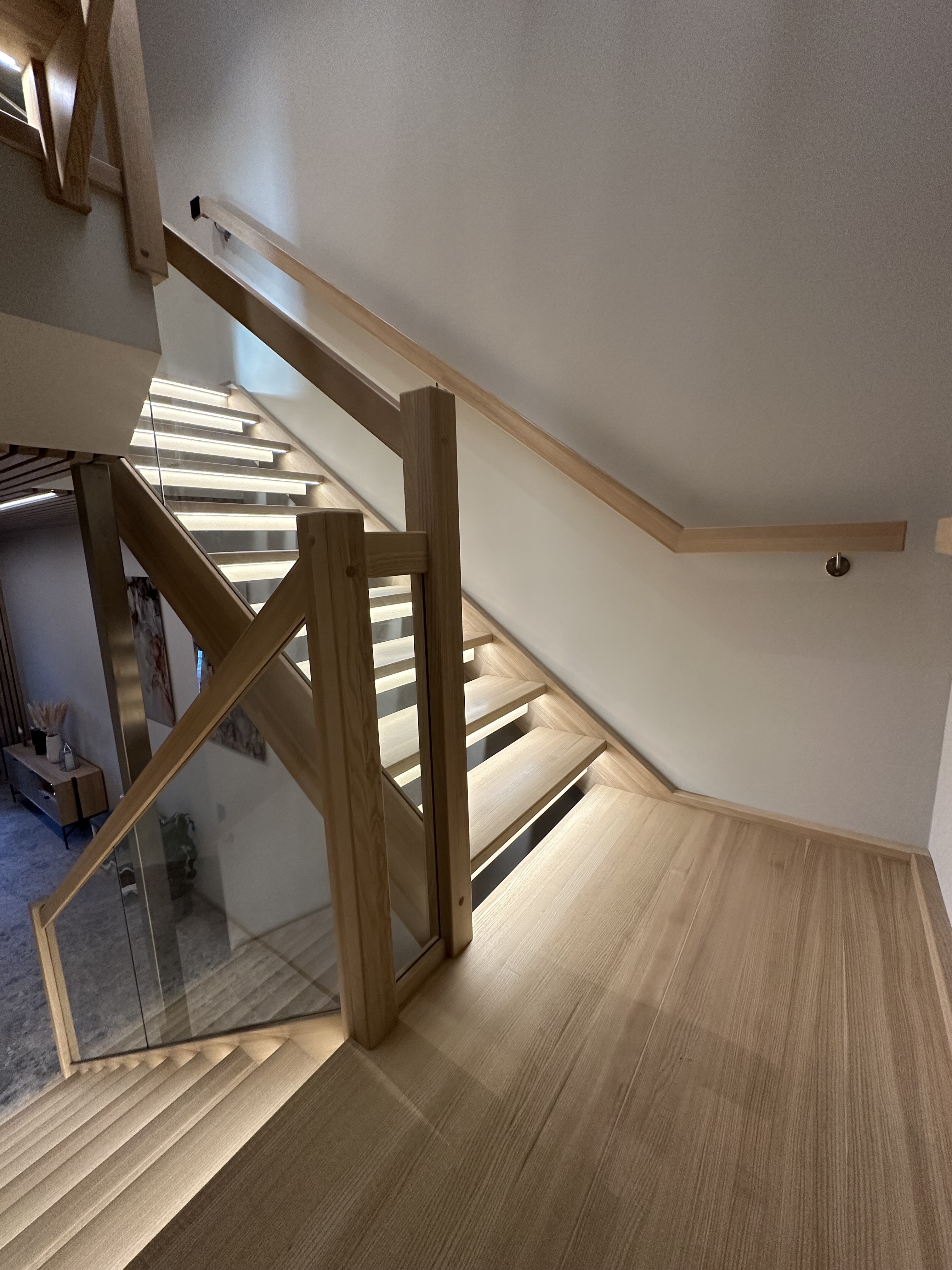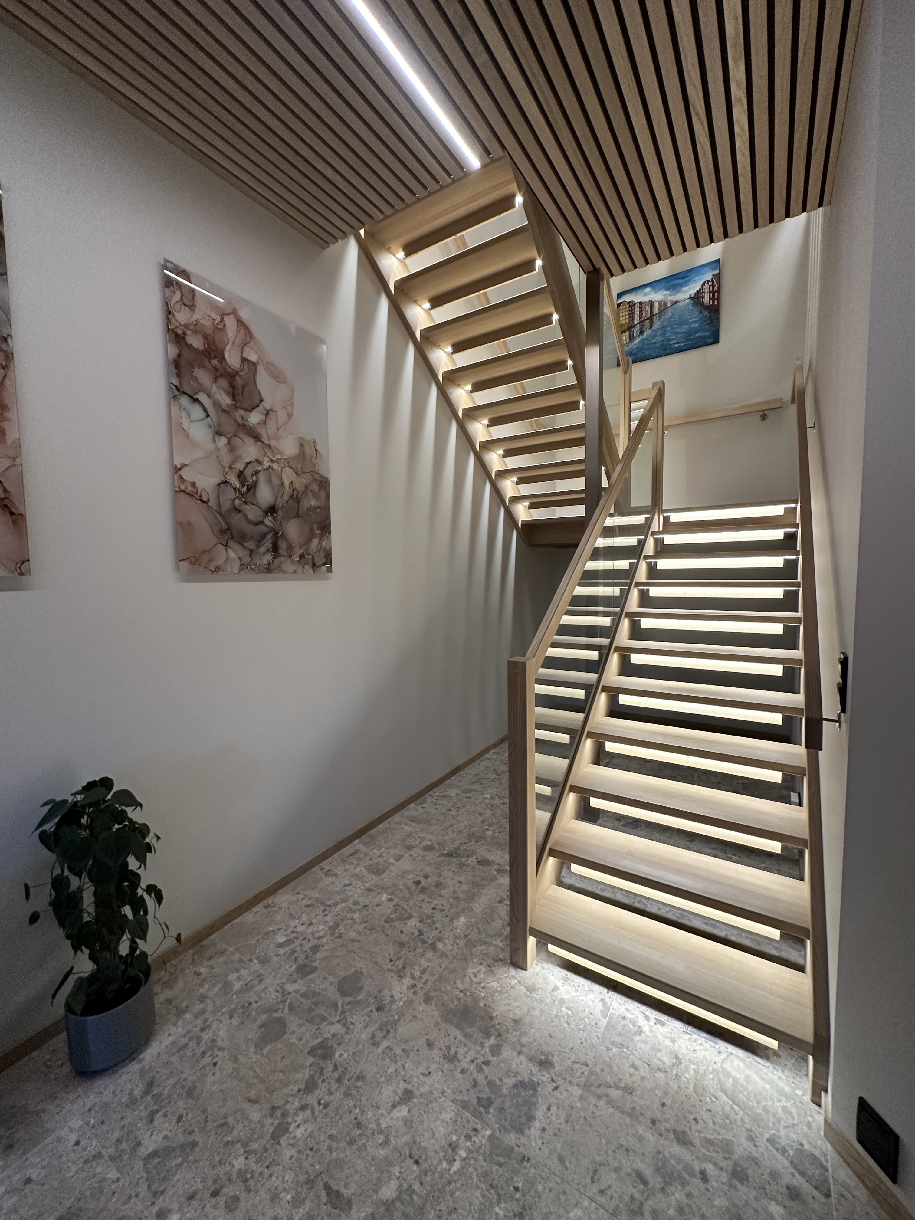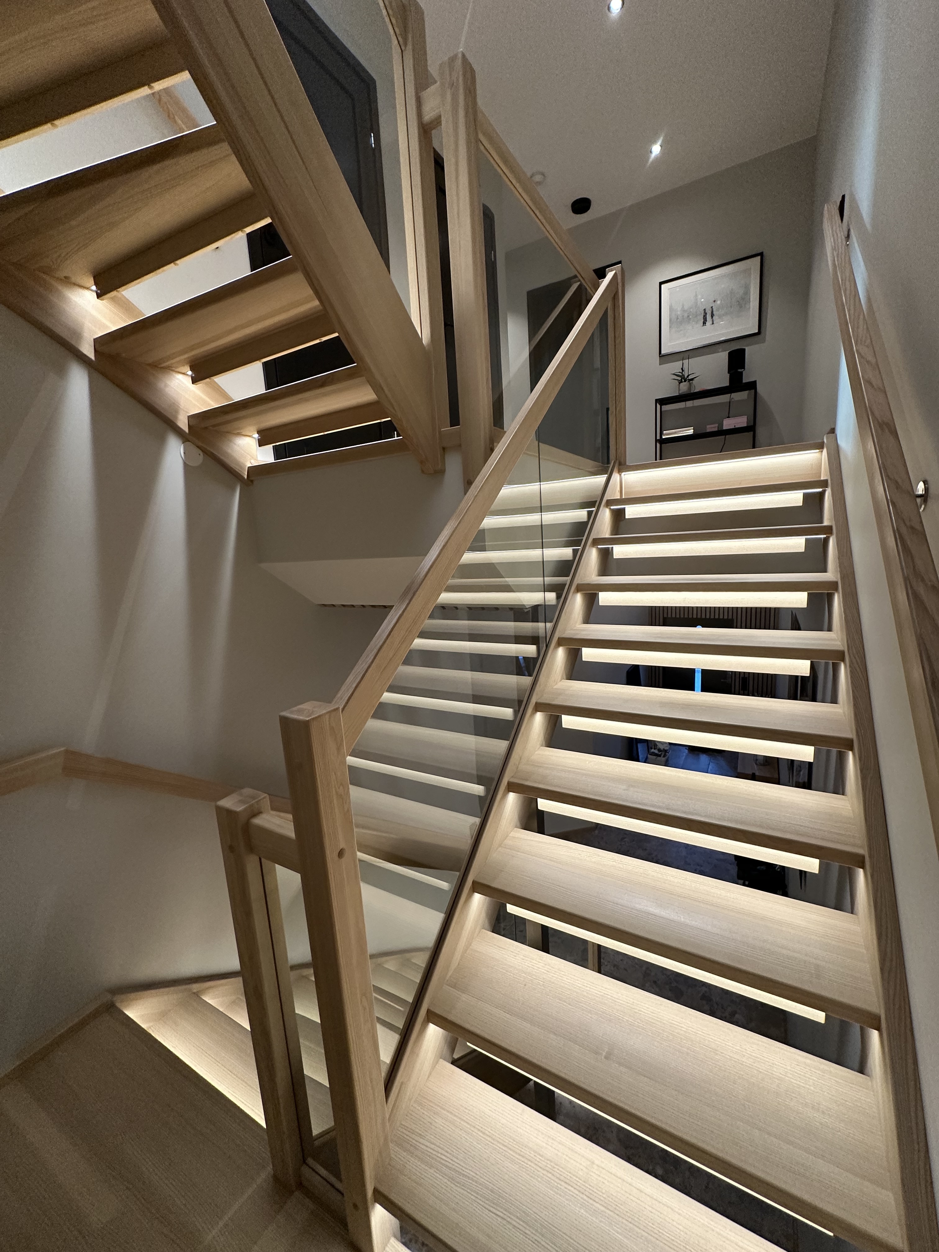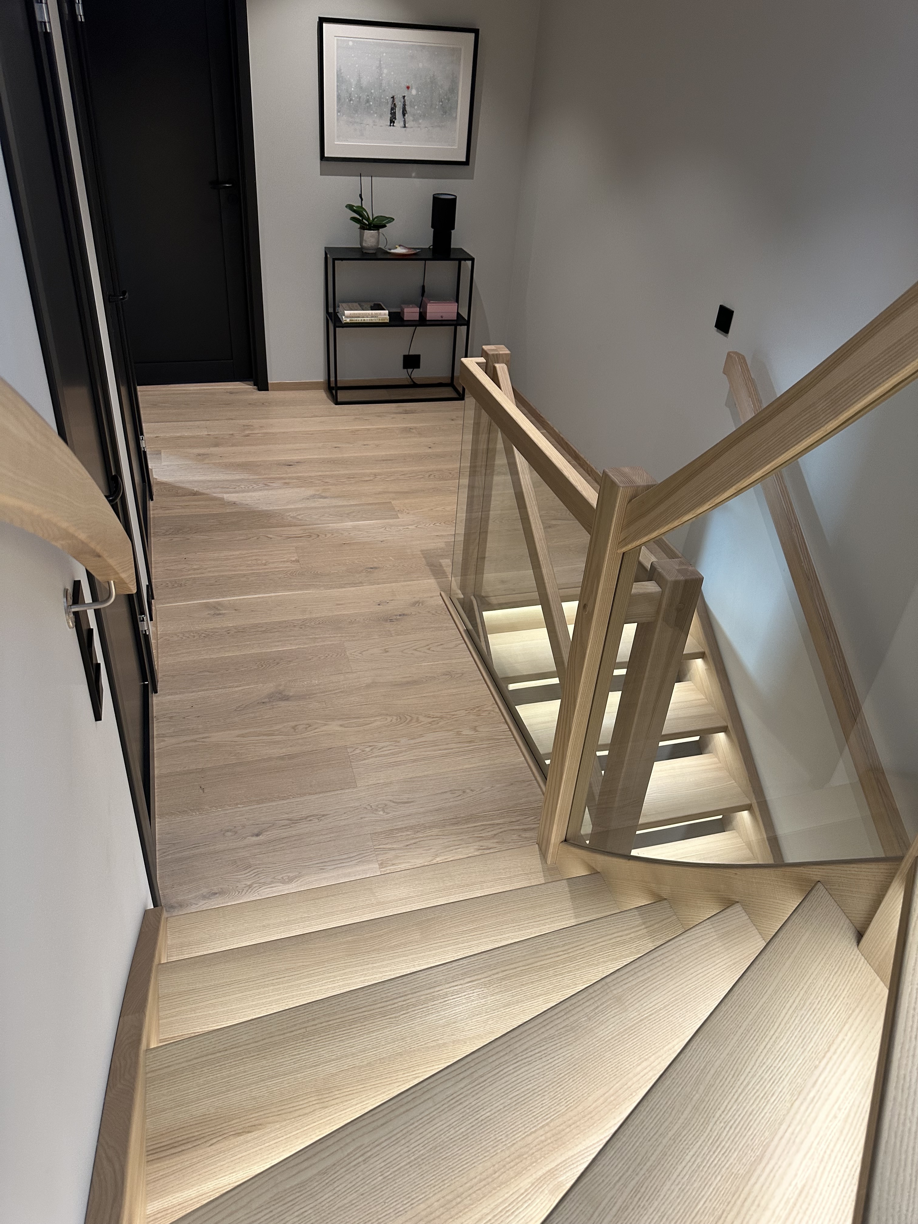Exclusive and airy modern staircase in solid ash – everything from the stringers and open steps to the glass railing and continuous handrail is crafted from the same light, solid ash, creating a seamless and harmonious overall impression. The open steps allow light to pass freely through, adding extra depth to the space, while warm integrated LED lighting under each step provides safety, atmosphere, and a beautiful play of light in the evening. The glass railing keeps the design minimalist and open, perfectly matched with the ceiling’s fine paneling and the upper-floor flooring.