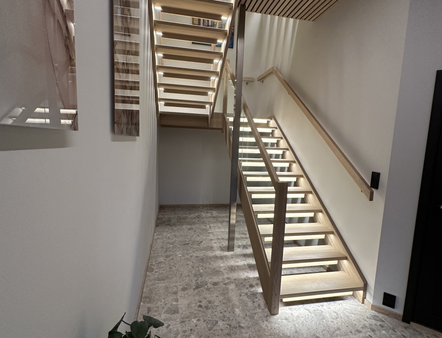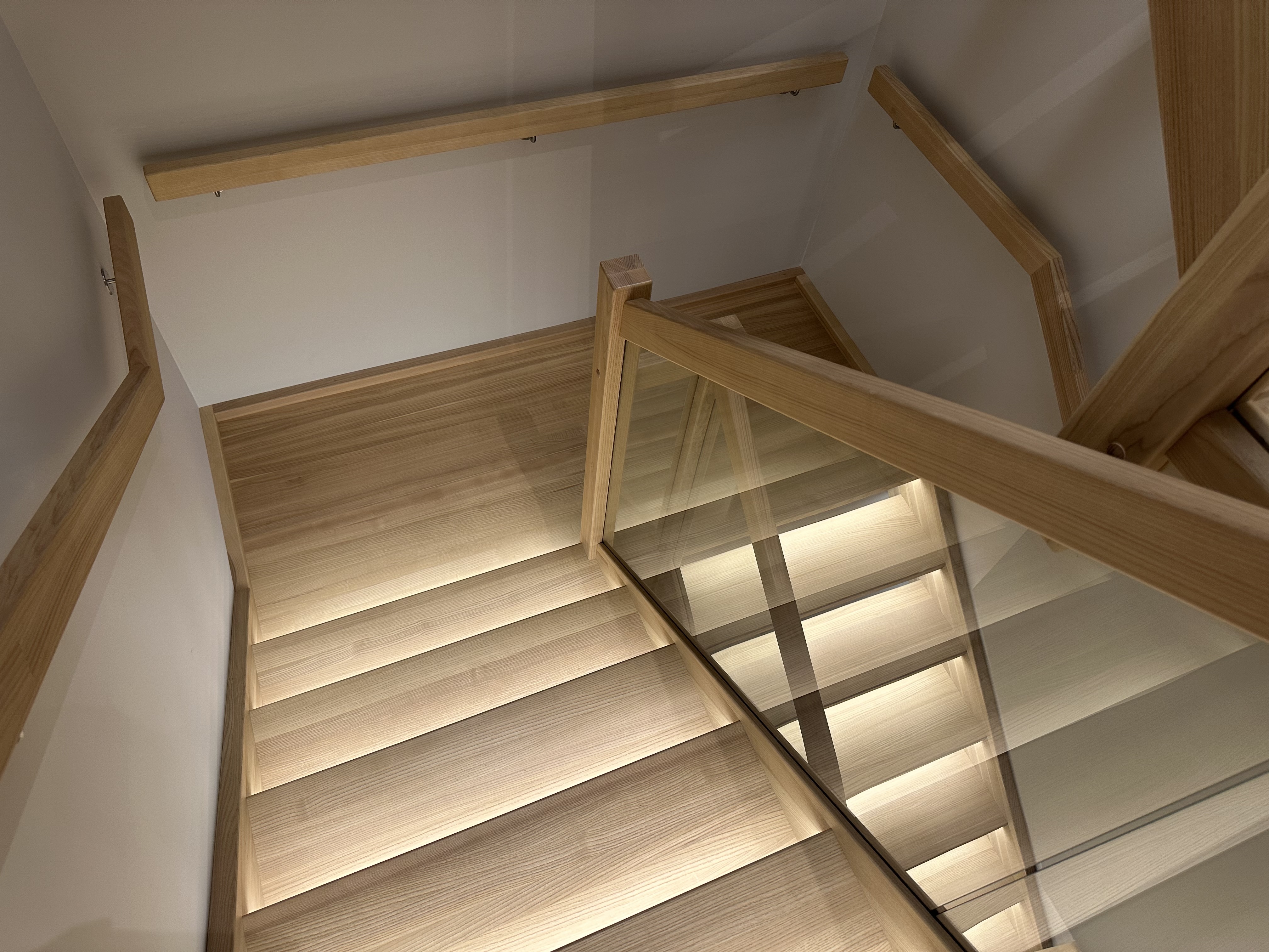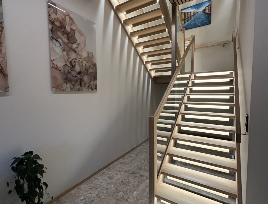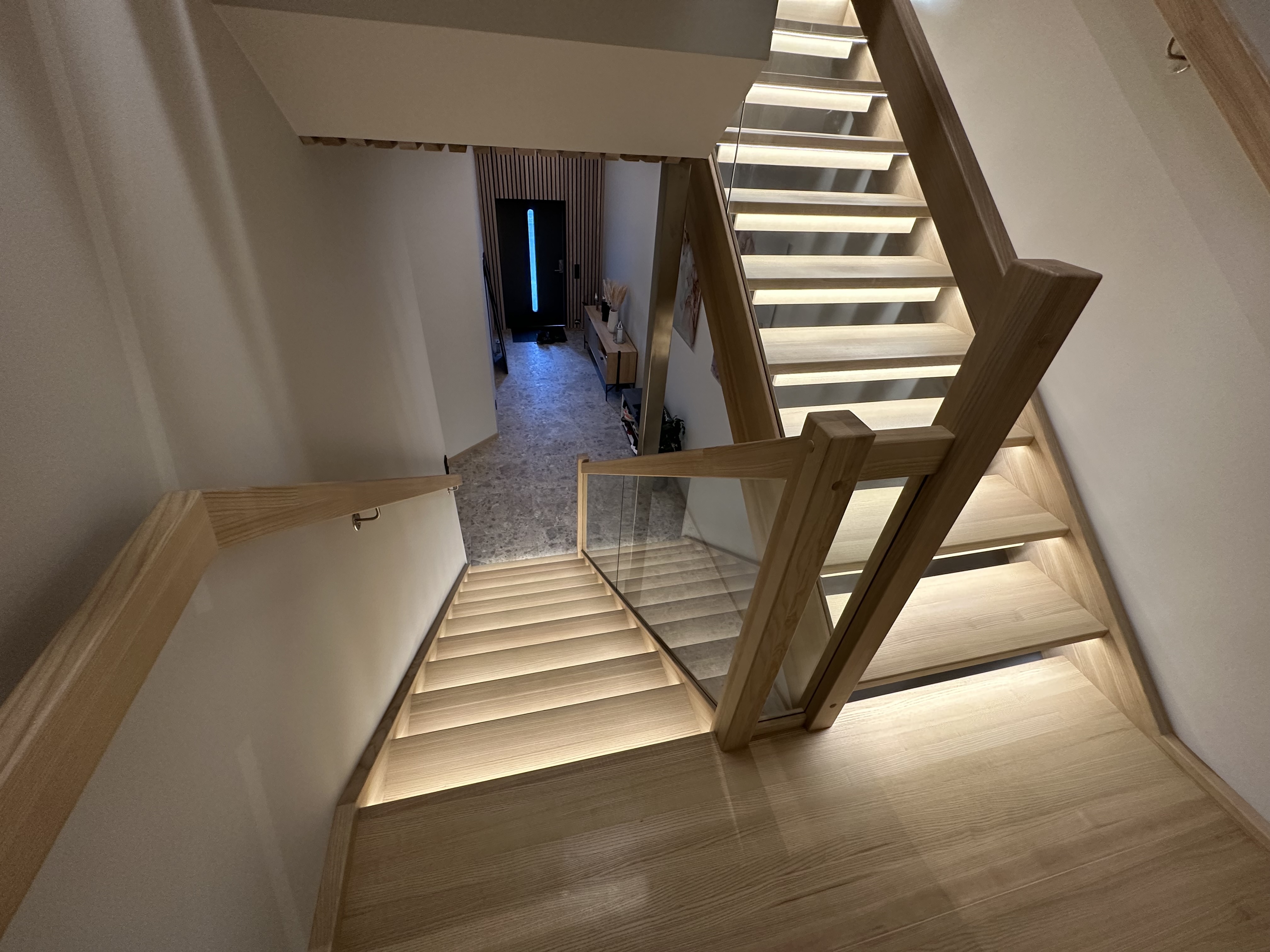 Exclusive and airy modern staircase in solid ash – everything from the stringers and open steps to the glass railing and continuous handrail is crafted from the same light, solid ash, creating a seamless and harmonious overall impression. The open steps allow light to pass freely through, adding extra depth to the space, while warm integrated LED lighting under each step provides safety, atmosphere, and a beautiful play of light in the evening. The glass railing keeps the design minimalist and open, perfectly matched with the ceiling’s fine paneling and the upper-floor flooring.