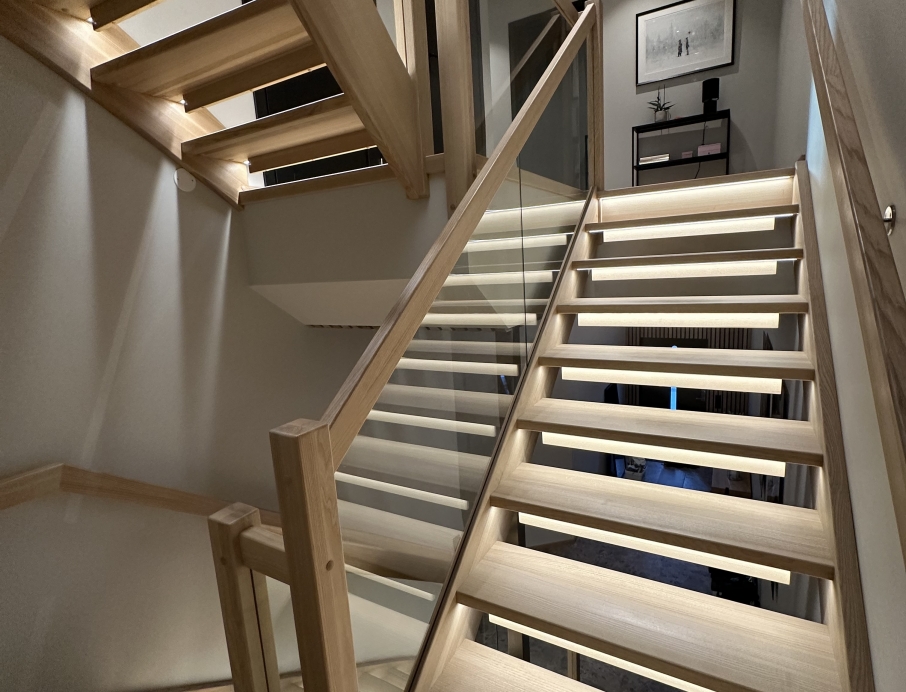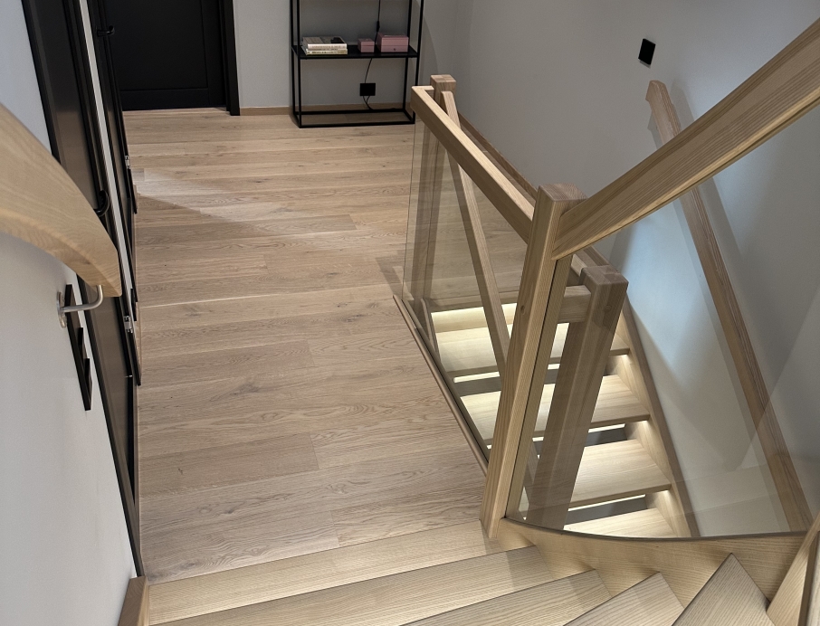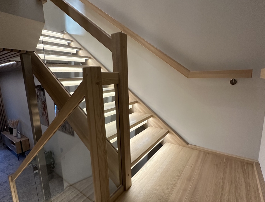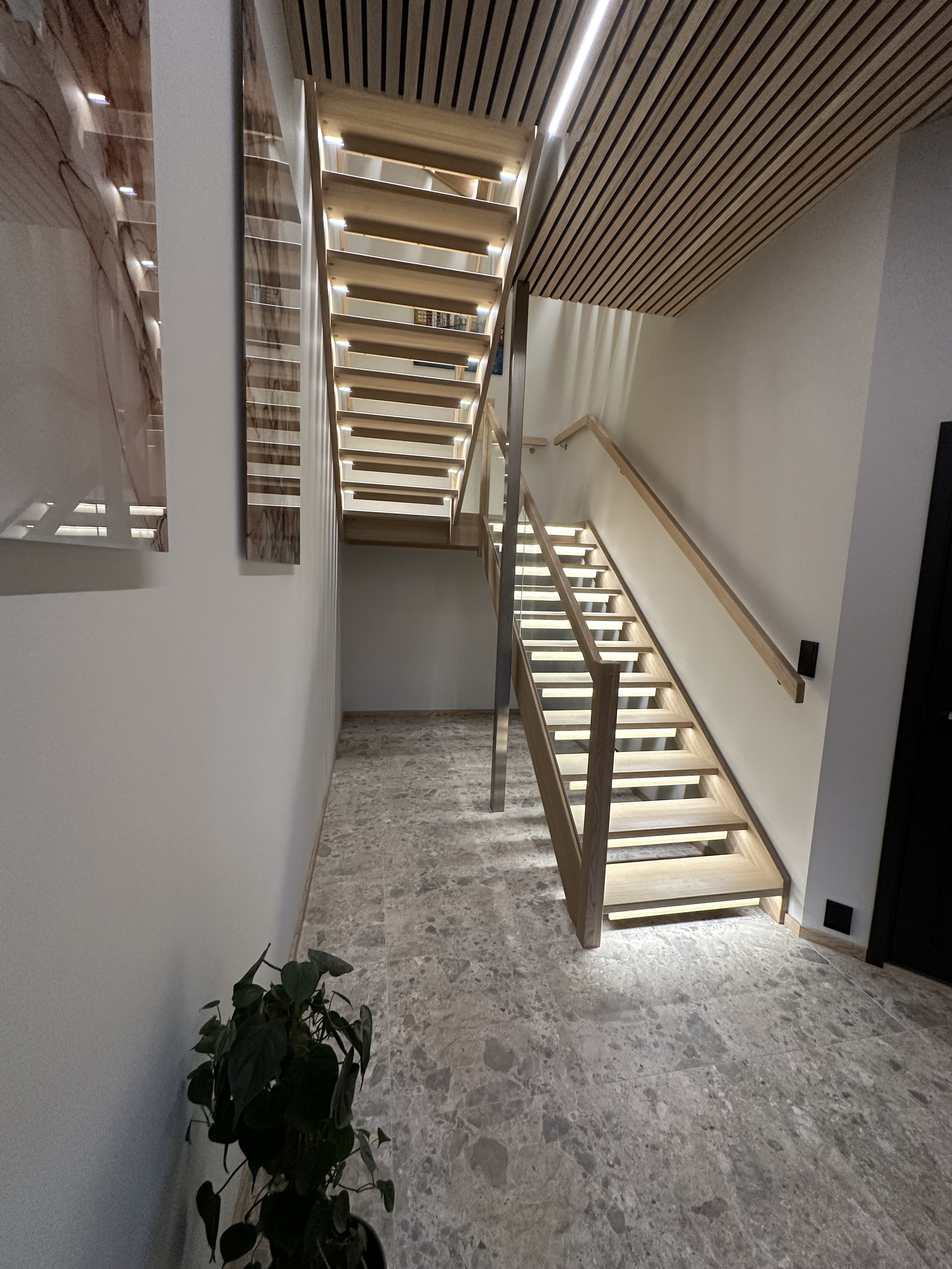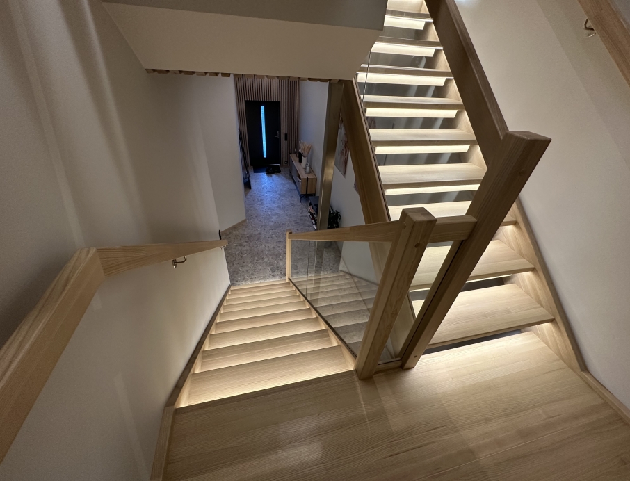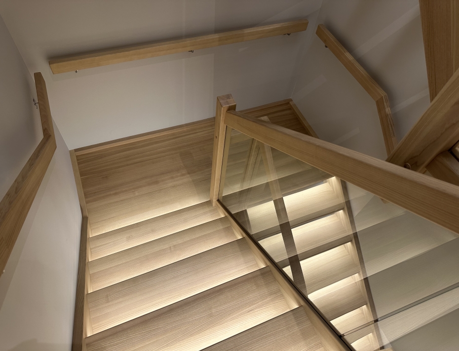 Exclusive and airy modern staircase in solid ash – everything from the stringers and open steps to the glass railing and continuous handrail is crafted from the same light, solid ash, creating a seamless and harmonious overall impression. The open steps allow light to pass freely through, adding extra depth to the space, while warm integrated LED lighting under each step provides safety, atmosphere, and a beautiful play of light in the evening. The glass railing keeps the design minimalist and open, perfectly matched with the ceiling’s fine paneling and the upper-floor flooring.