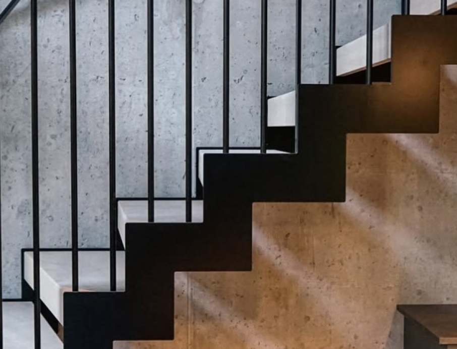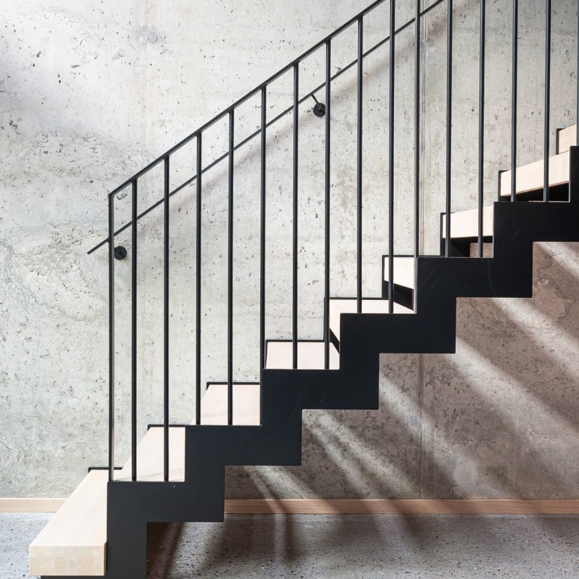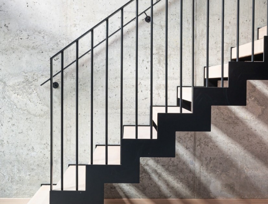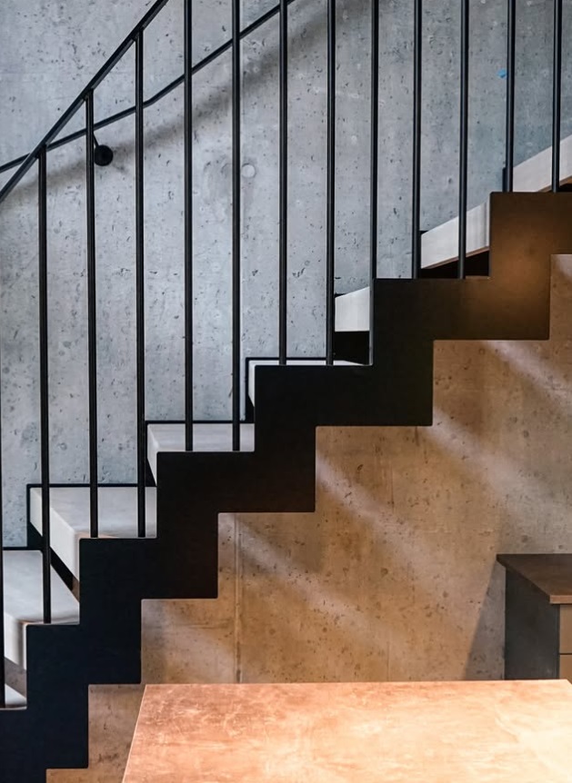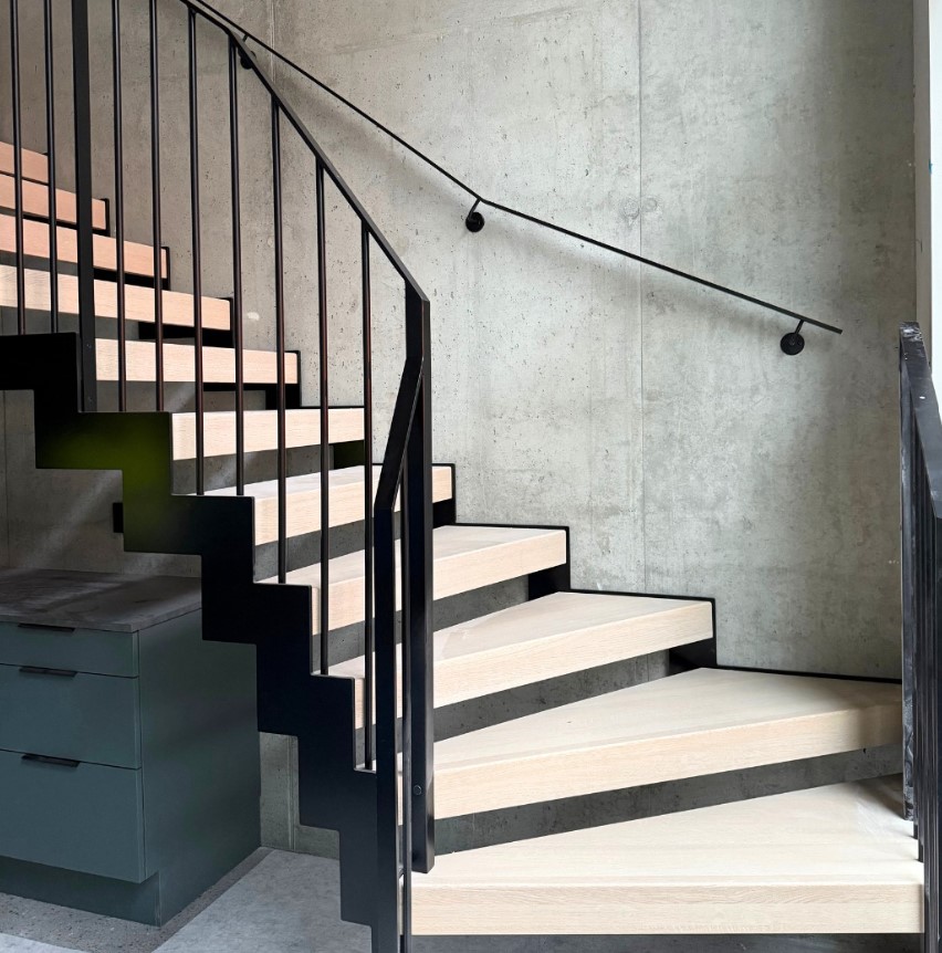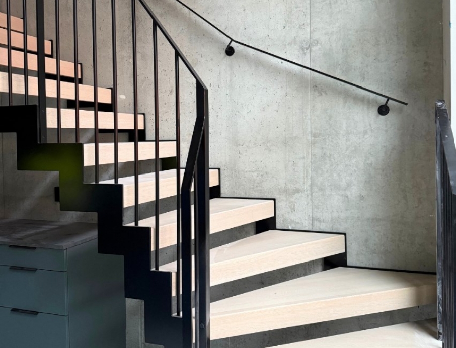 Raw and dramatic modern steel staircase delivered through close collaboration with Stø Entreprenør AS – a result of solid craftsmanship and precision. The jagged stringer in black-painted steel creates a powerful industrial contrast against the raw concrete wall, while the treads in warm solid oak add natural warmth and softness. The railing is made of slim 10x40 mm flat steel profiles, black-painted for a clean and minimalist look. The curved form sweeps elegantly up through the tall space with large windows, and the open construction allows light to flow freely for a maximum sense of space. Perfect for lofts, modern homes, or offices where the staircase becomes a strong architectural statement with industrial character and Scandinavian warmth.
