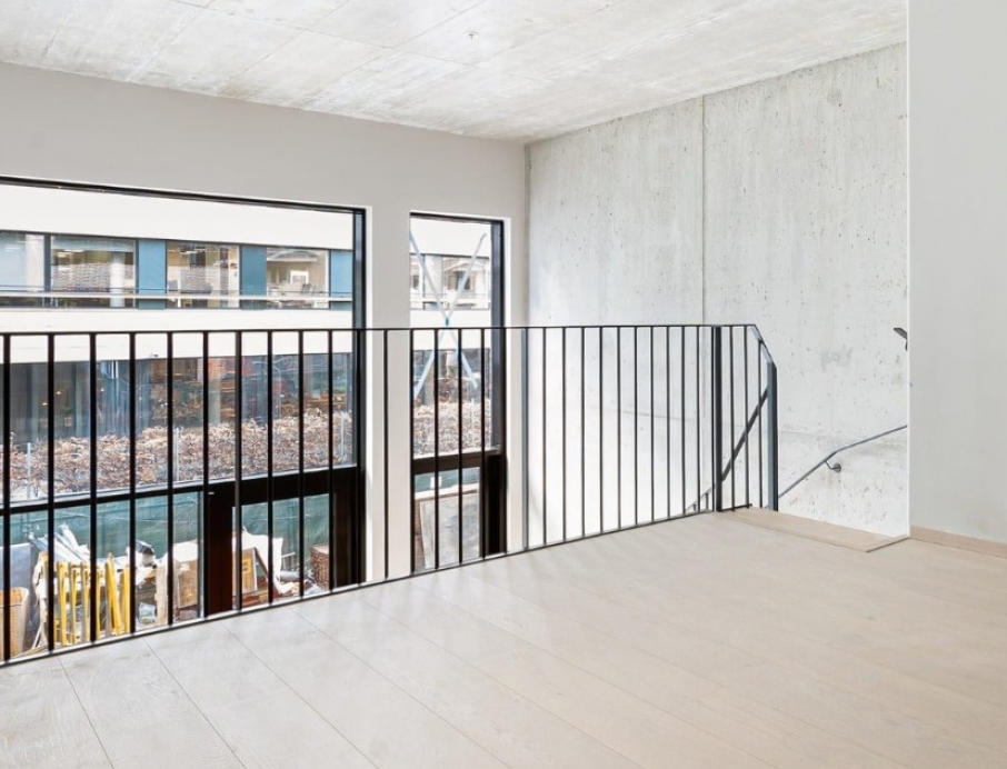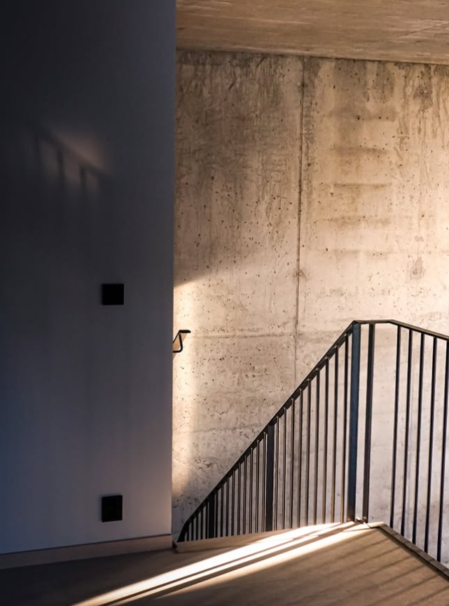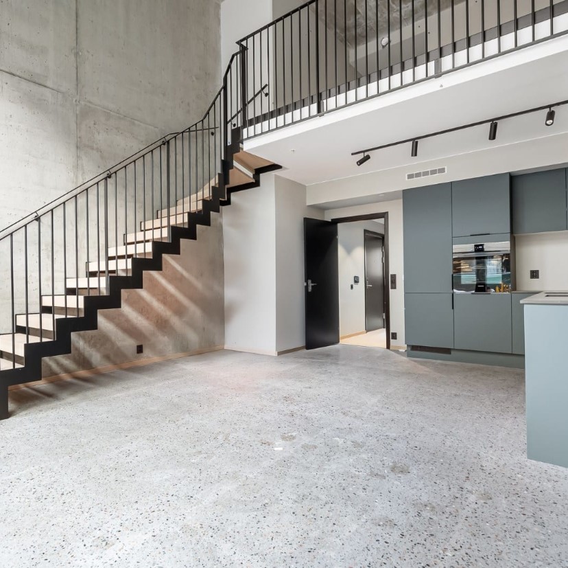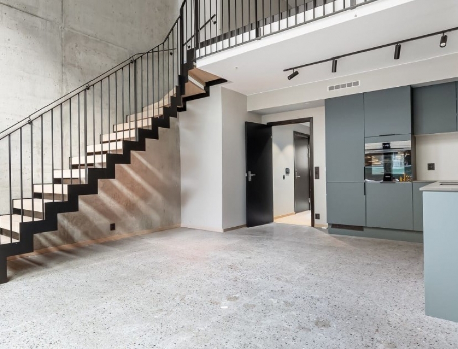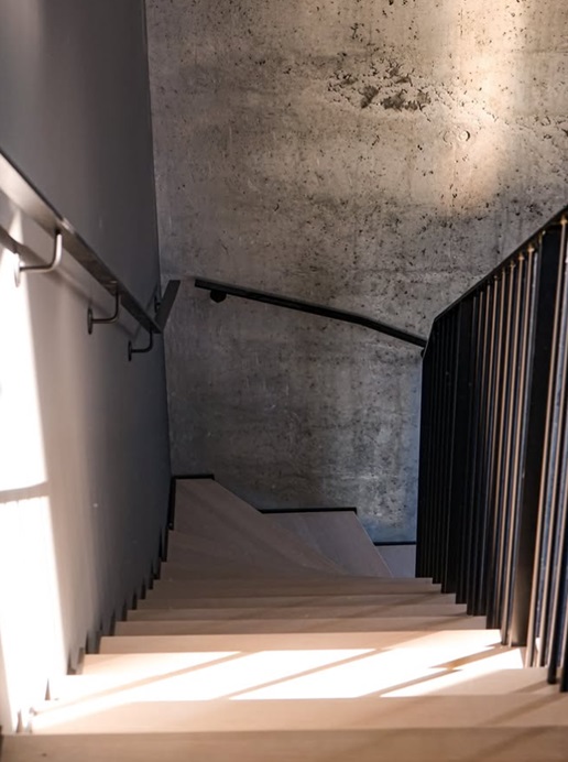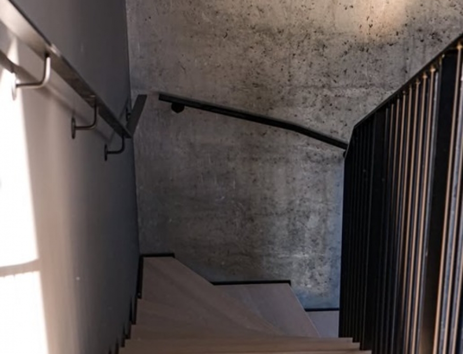 Raw and dramatic modern steel staircase delivered through close collaboration with Stø Entreprenør AS – a result of solid craftsmanship and precision. The jagged stringer in black-painted steel creates a powerful industrial contrast against the raw concrete wall, while the treads in warm solid oak add natural warmth and softness. The railing is made of slim 10x40 mm flat steel profiles, black-painted for a clean and minimalist look. The curved form sweeps elegantly up through the tall space with large windows, and the open construction allows light to flow freely for a maximum sense of space. Perfect for lofts, modern homes, or offices where the staircase becomes a strong architectural statement with industrial character and Scandinavian warmth.