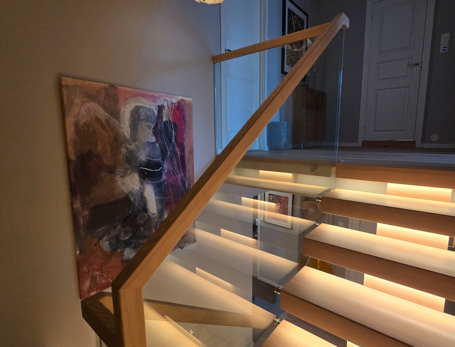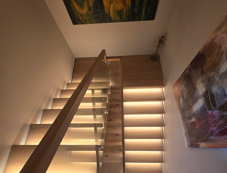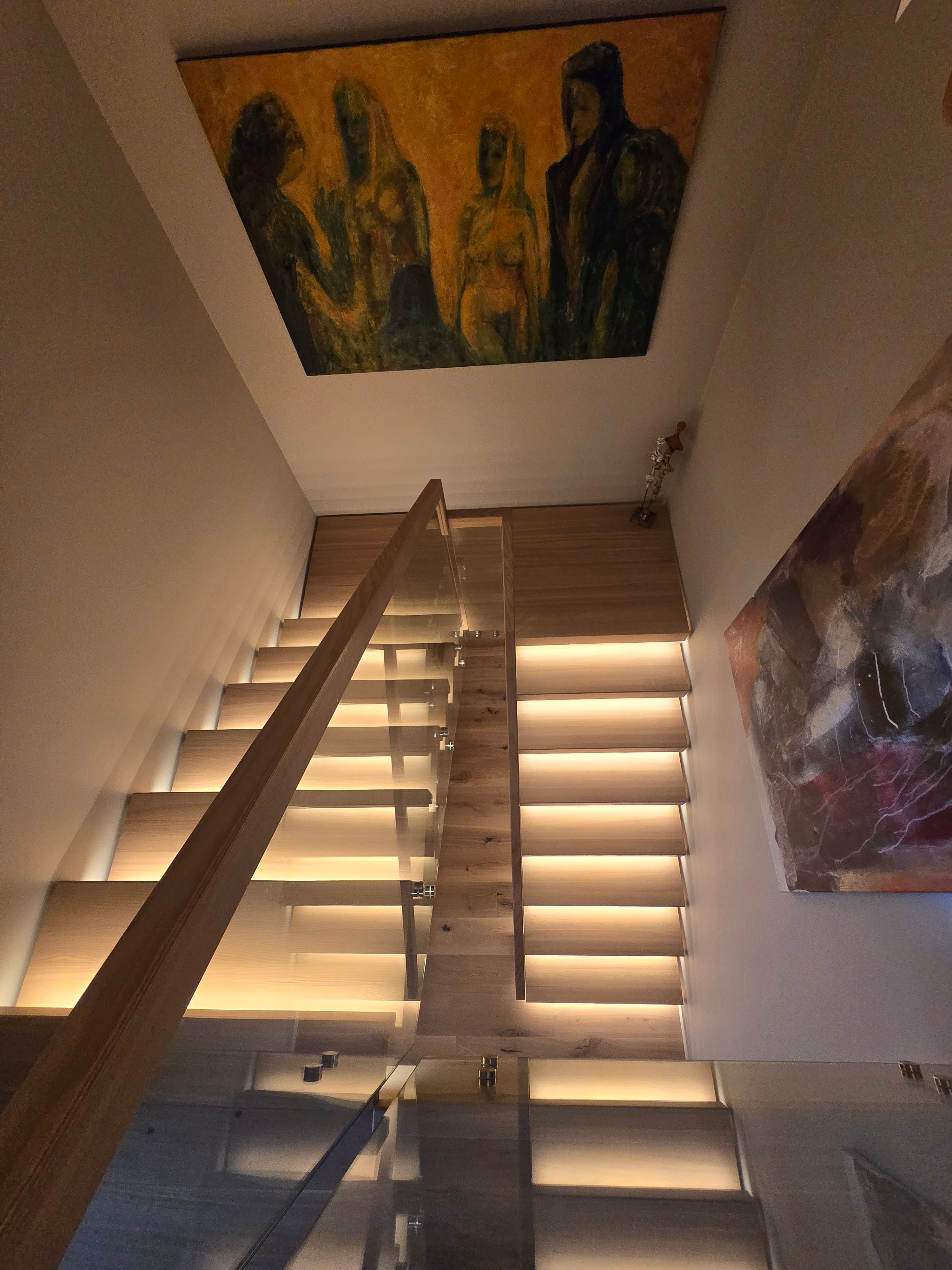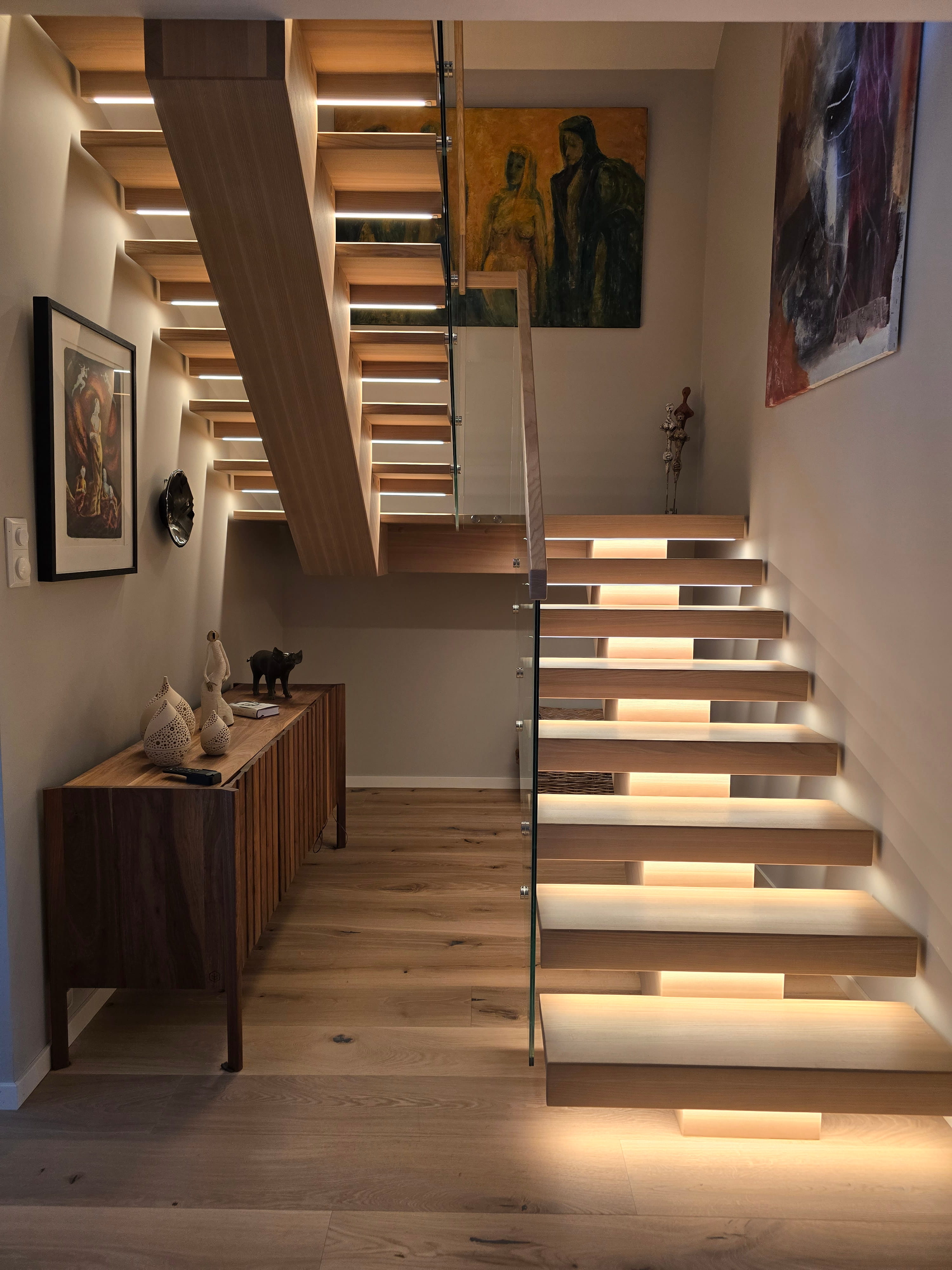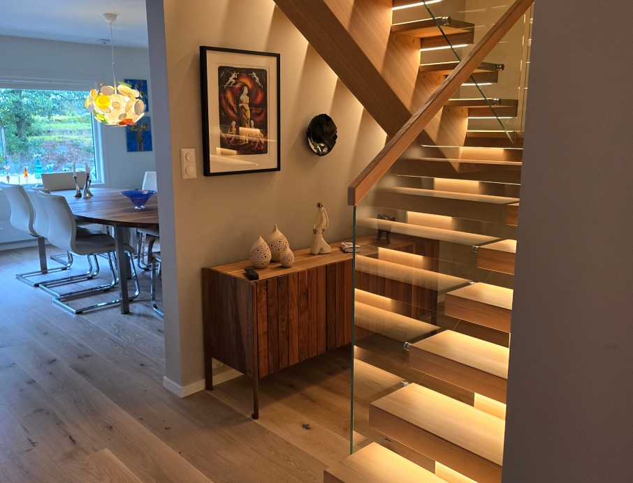 Интегрированная LED-подсветка под каждой ступенью превращает пространство в магическое впечатление – тёплое, атмосферное свечение подчёркивает произведения искусства на стенах и раскрывает естественную красоту дерева в вечернее время.