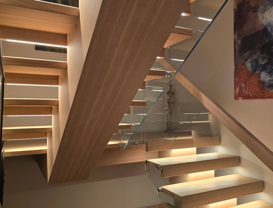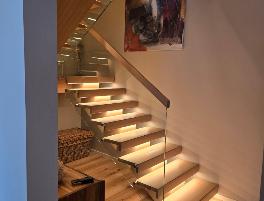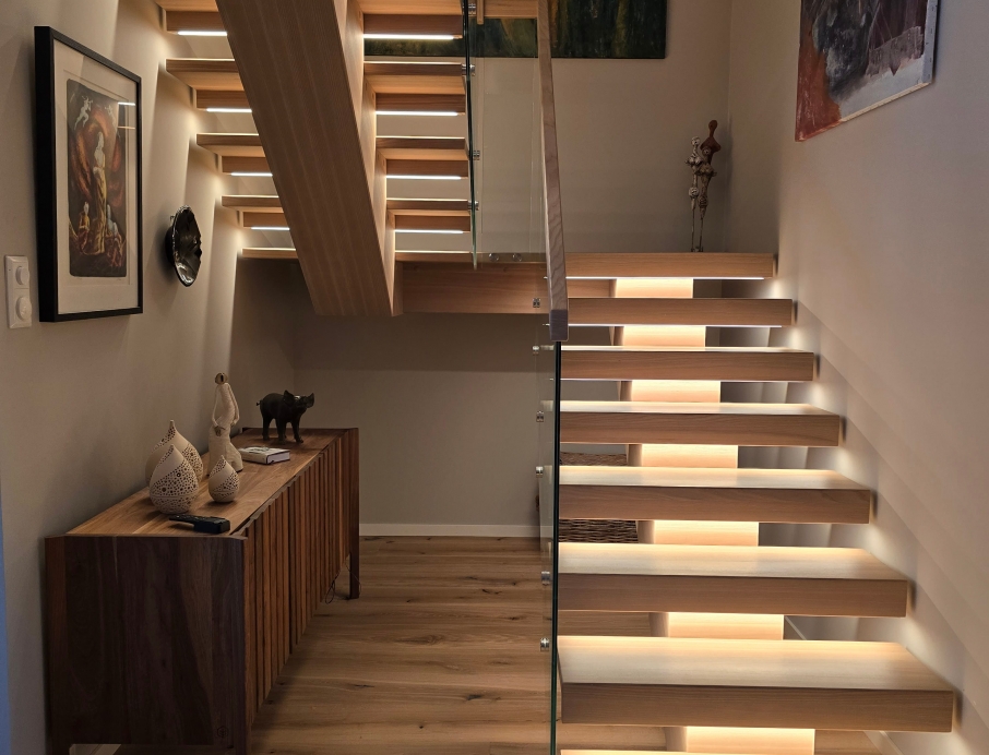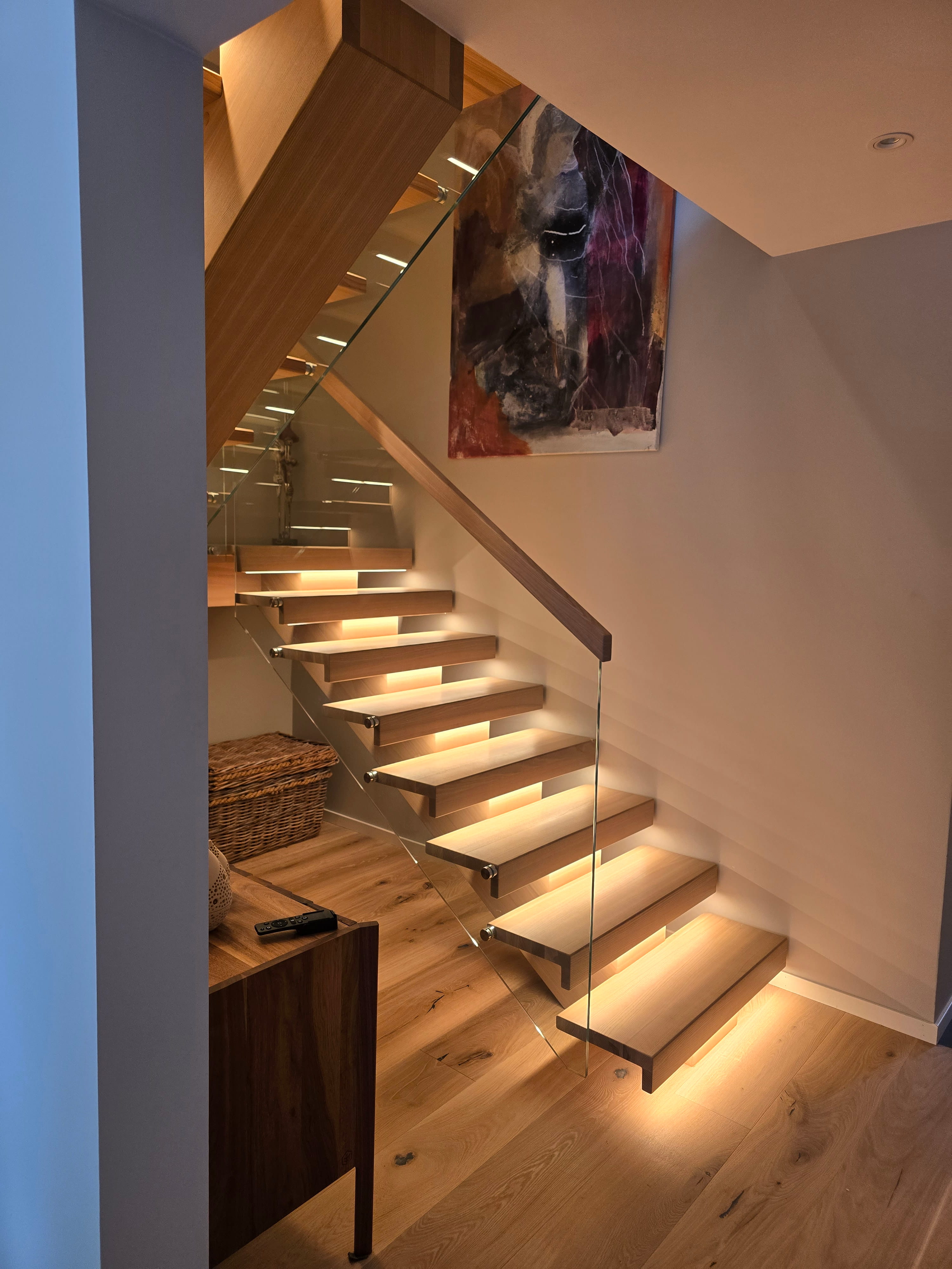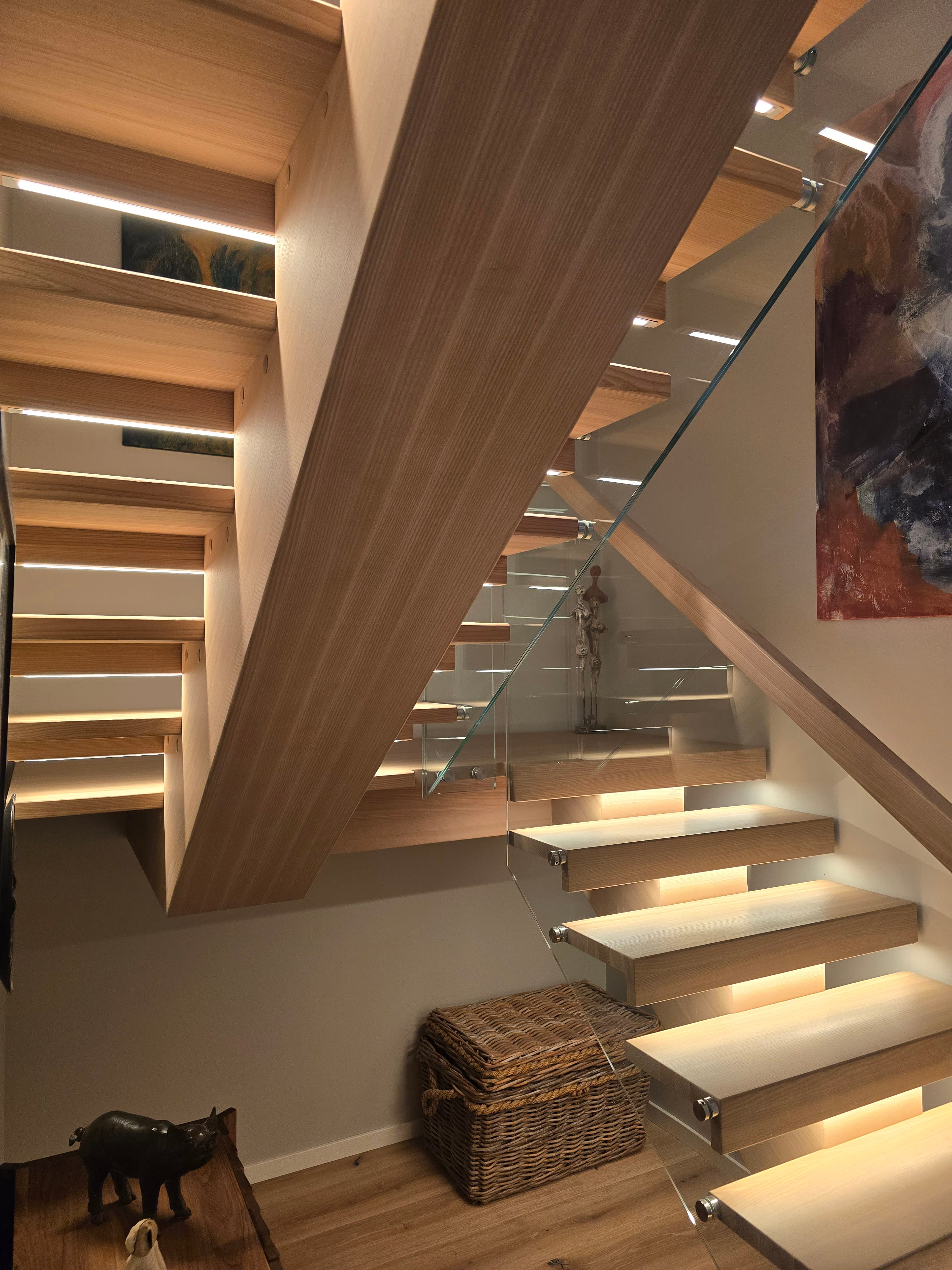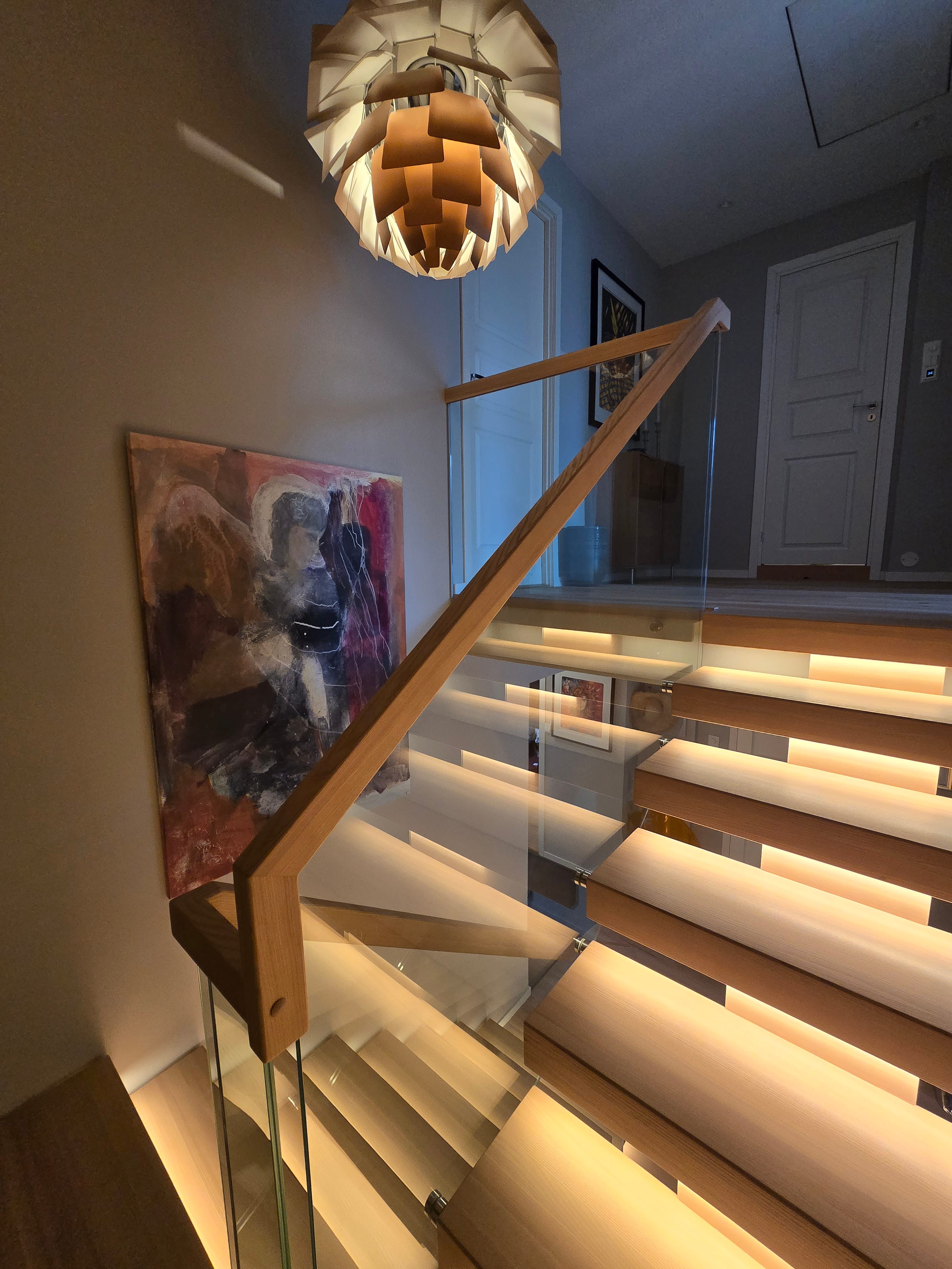Интегрированная LED-подсветка под каждой ступенью превращает пространство в магическое впечатление – тёплое, атмосферное свечение подчёркивает произведения искусства на стенах и раскрывает естественную красоту дерева в вечернее время.