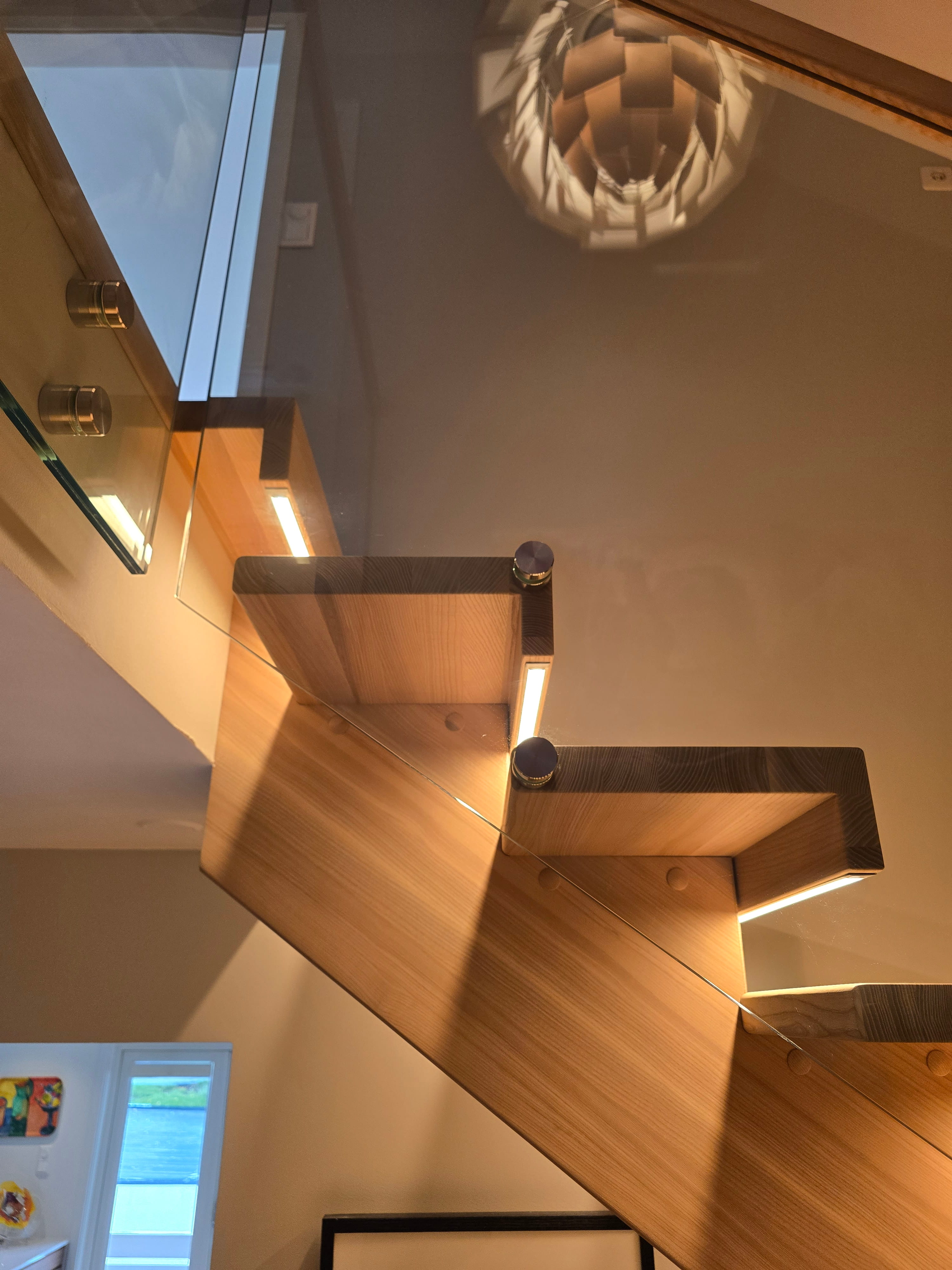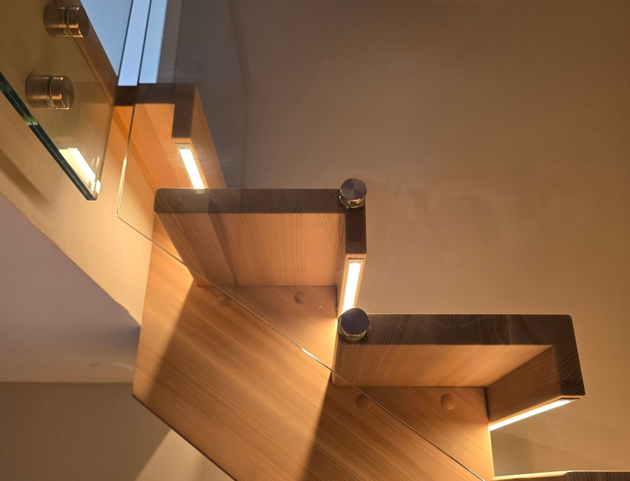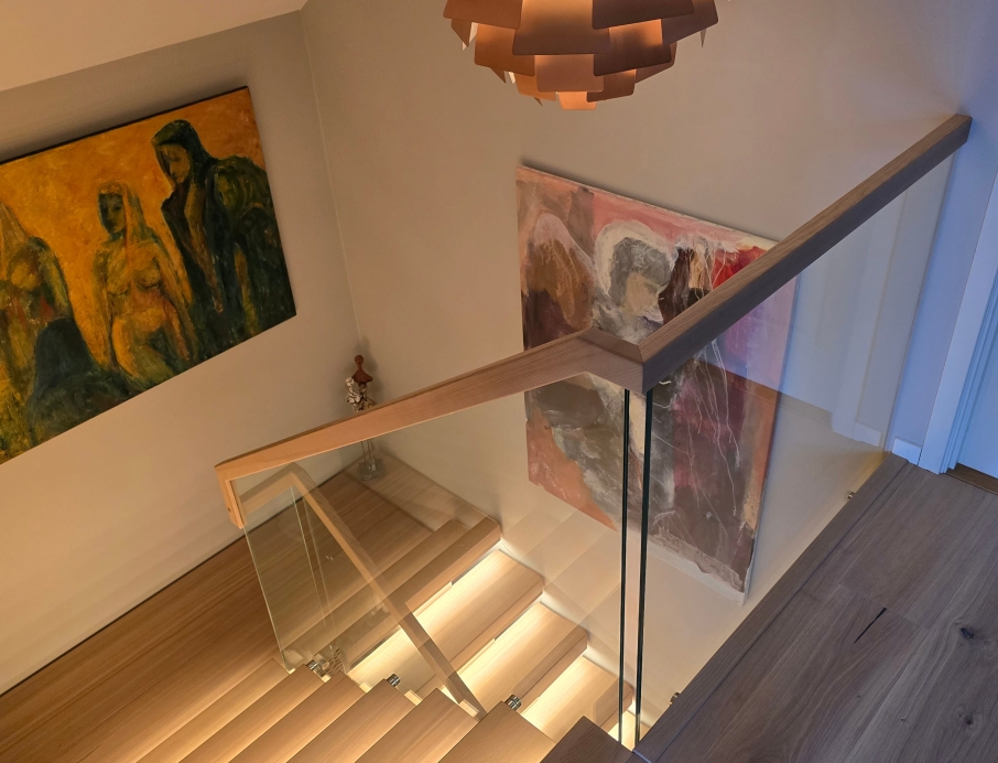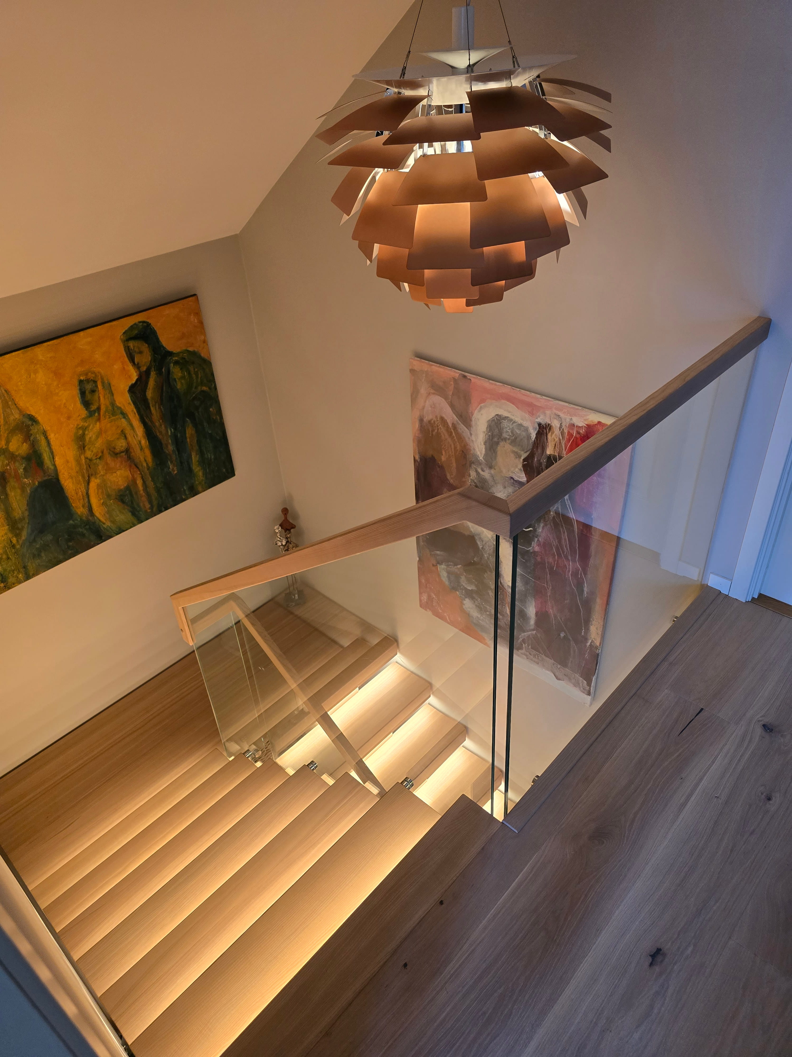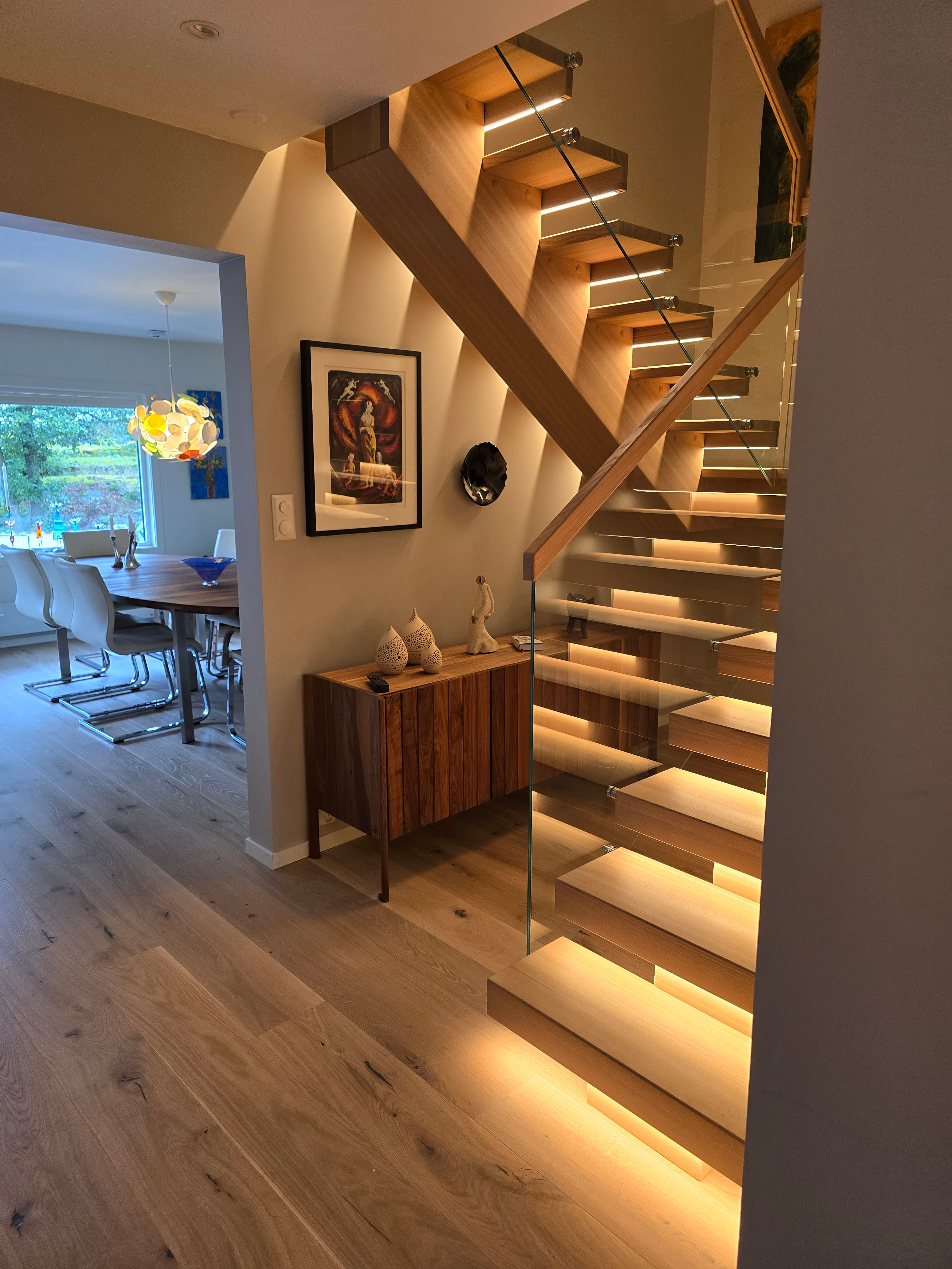 Интегрированная LED-подсветка под каждой ступенью превращает пространство в магическое впечатление – тёплое, атмосферное свечение подчёркивает произведения искусства на стенах и раскрывает естественную красоту дерева в вечернее время.