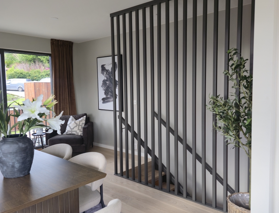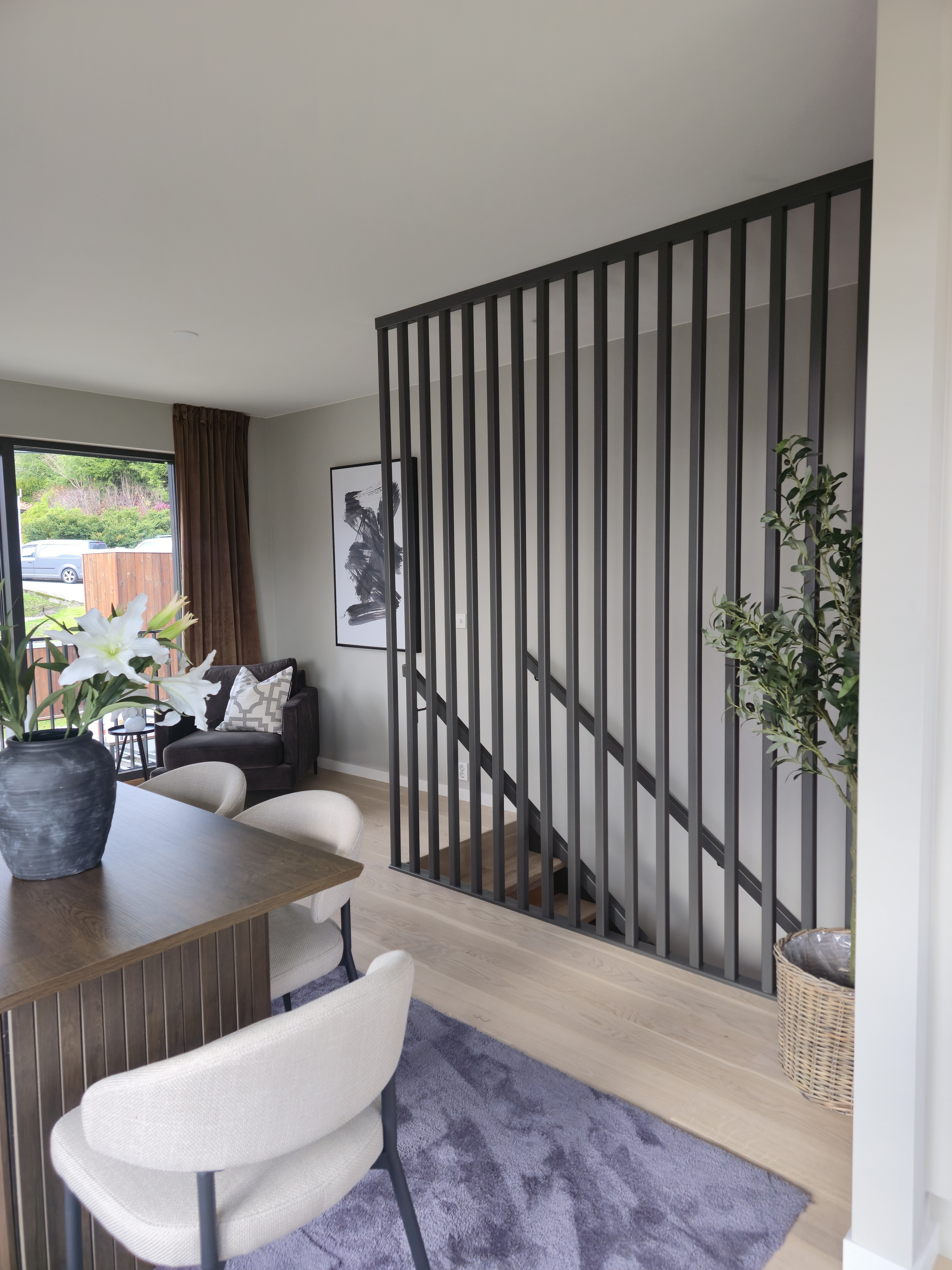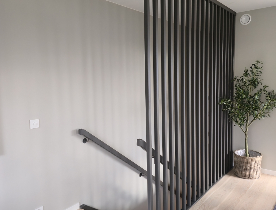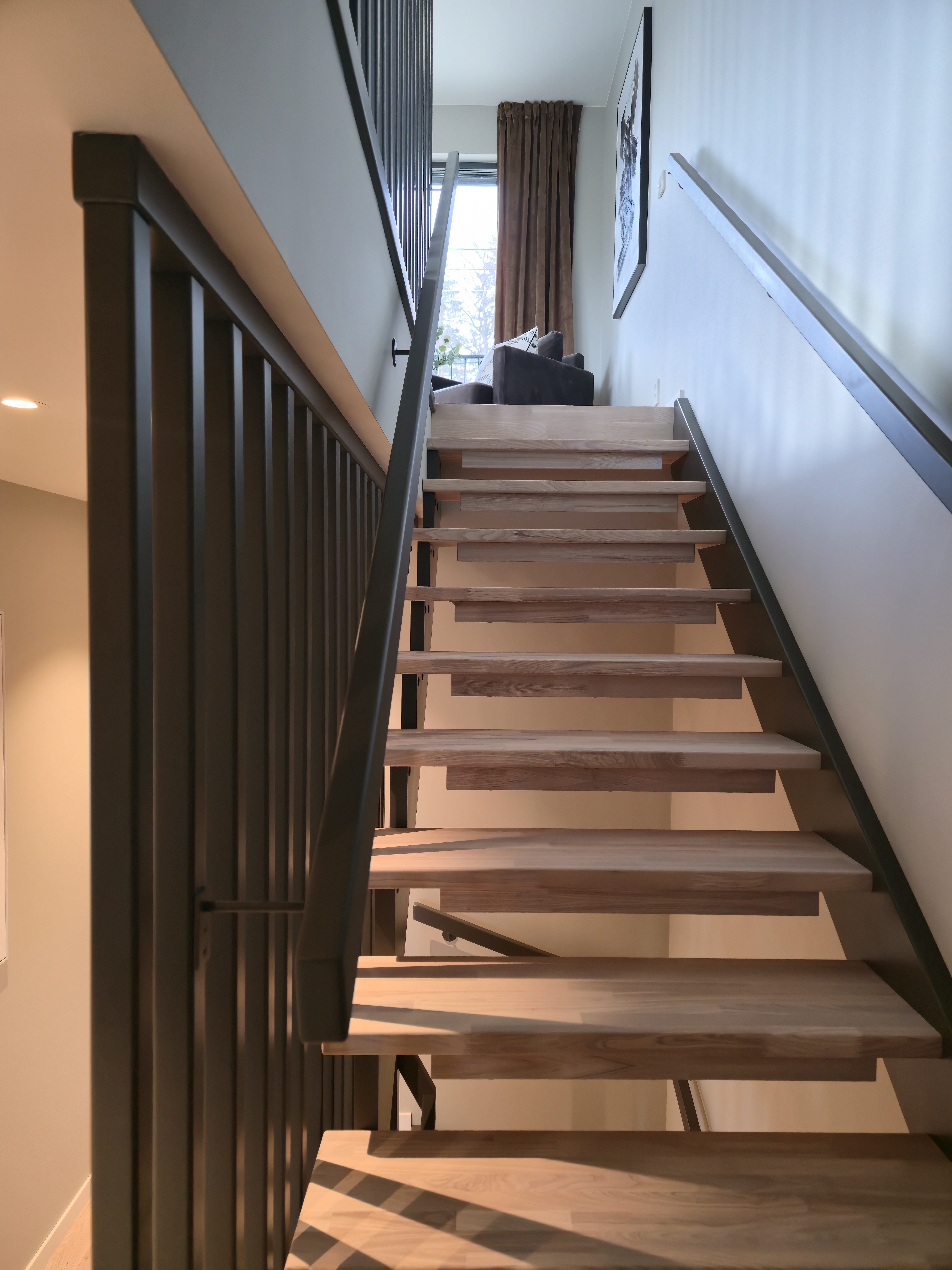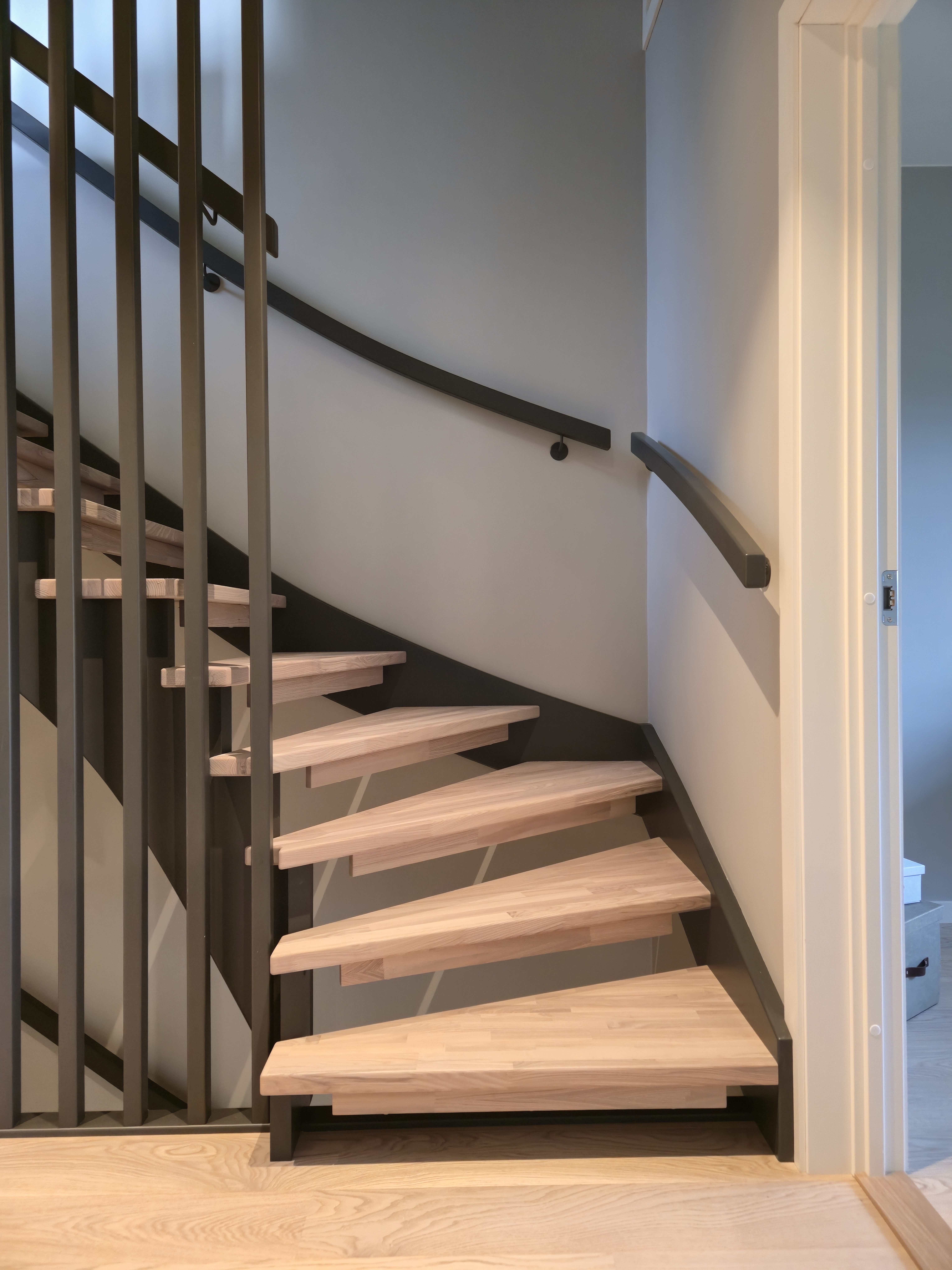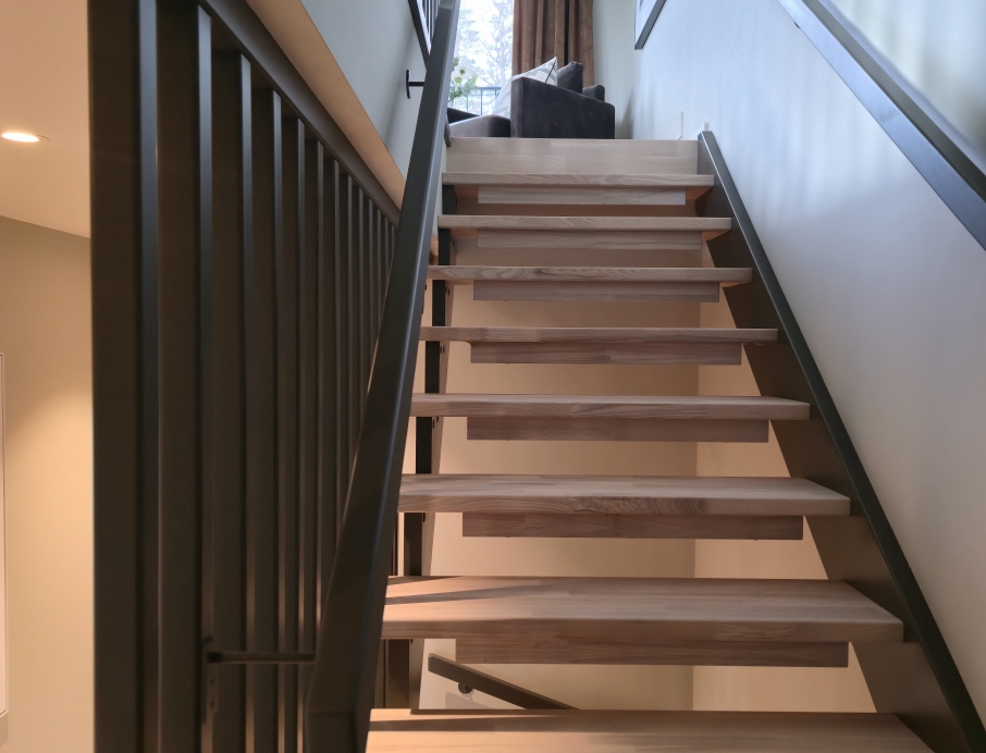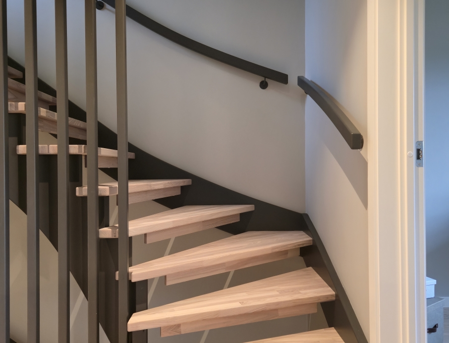 Красивая современная лестница из светлого трёхполосного ясеня и дерева, окрашенного в чёрный цвет — одна из самых доступных в своём классе без ущерба для дизайна и качества. Элегантные ступени из ясеня плавно поднимаются по изгибу, а высокая стена из чёрных деревянных реек создаёт лёгкий и графичный образ. Реечная стена заменяет традиционное ограждение сбоку лестницы, освобождая пространство на ступенях и делая лестницу более безопасной и удобной для передвижения. Непрерывный изогнутый деревянный поручень идеально сочетается с тёмным косоуром и создаёт строгий индустриально-скандинавский стиль. Доступная по цене современная лестница, сочетающая эстетику, функциональность и эффективное использование пространства — идеальный выбор для домов, где ценят высокий уровень дизайна по разумной цене.