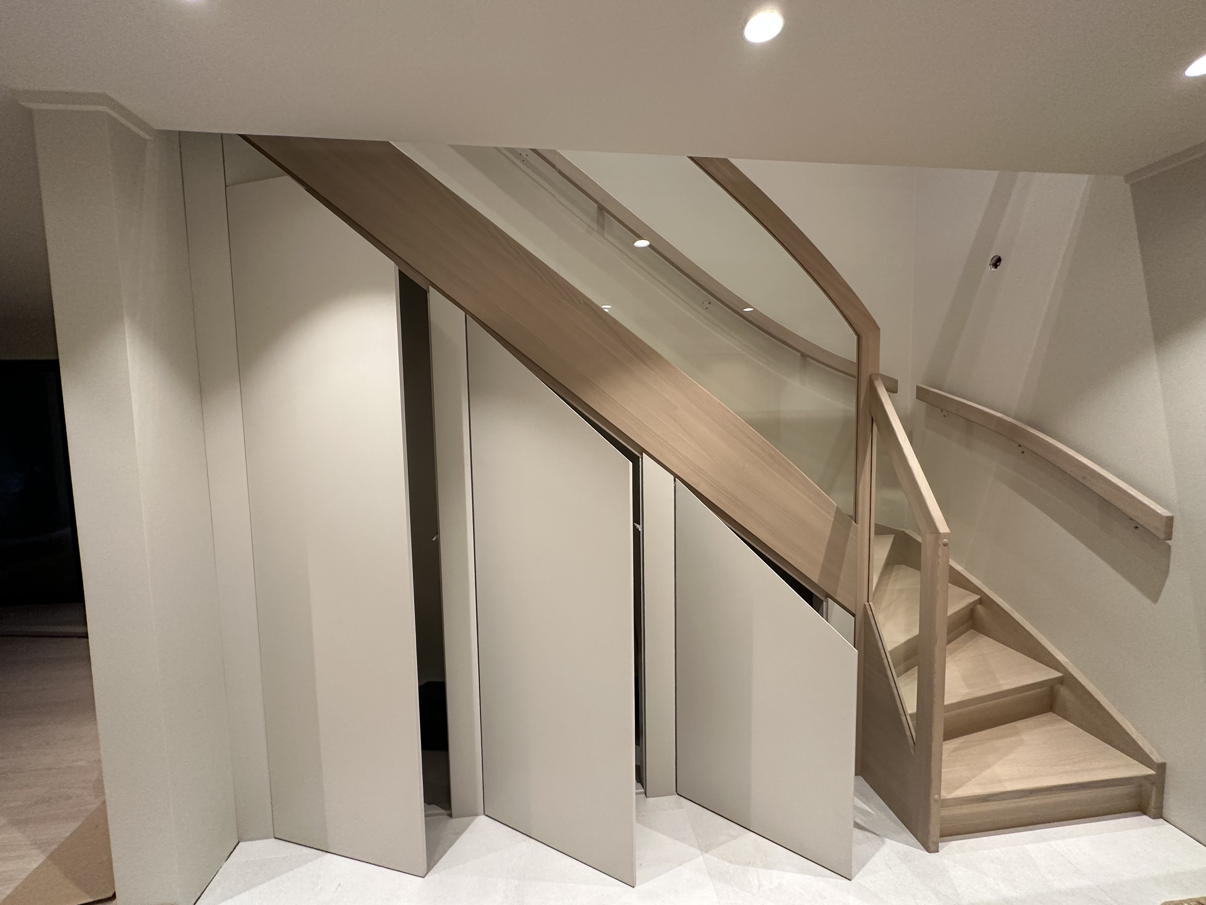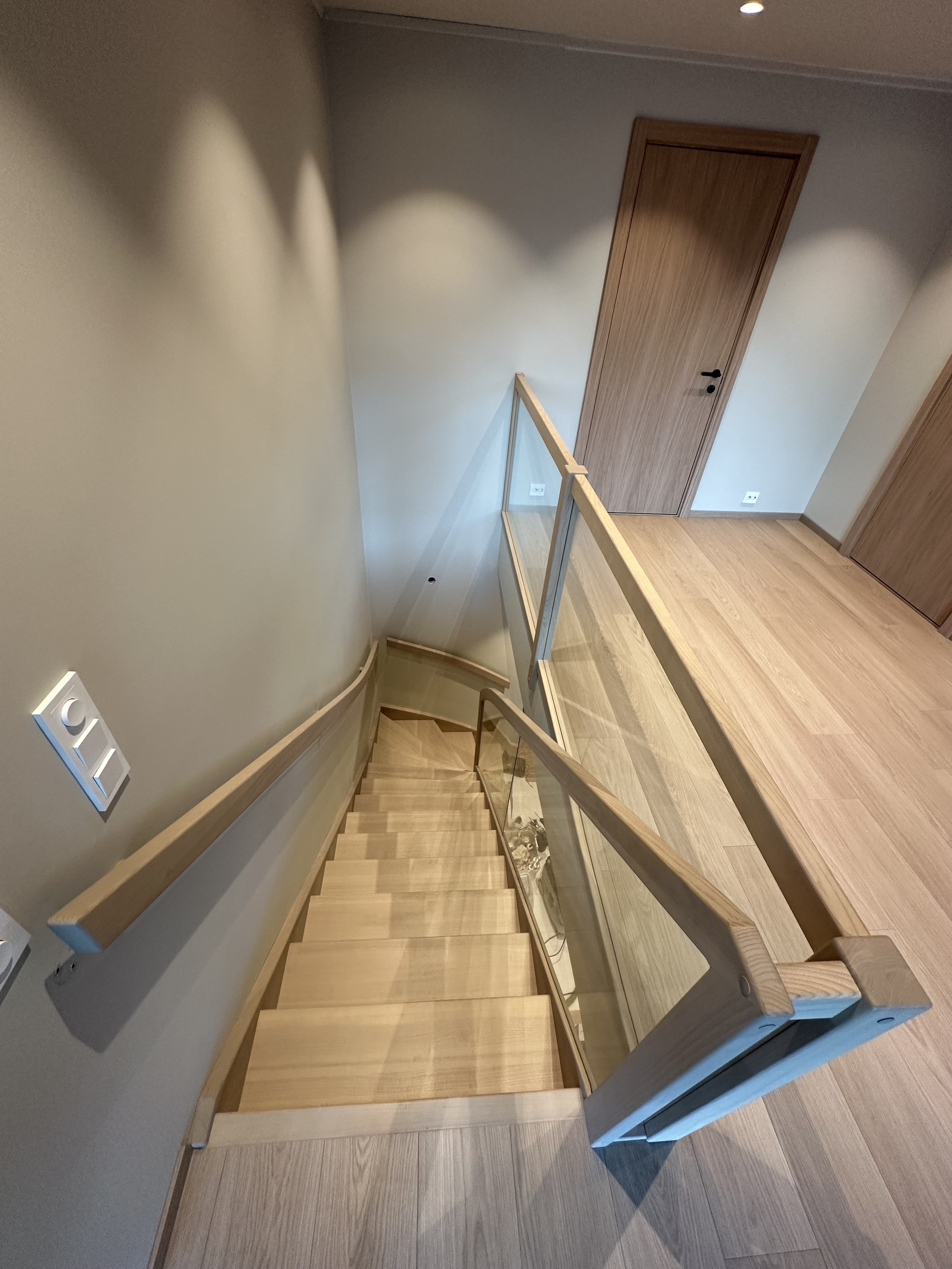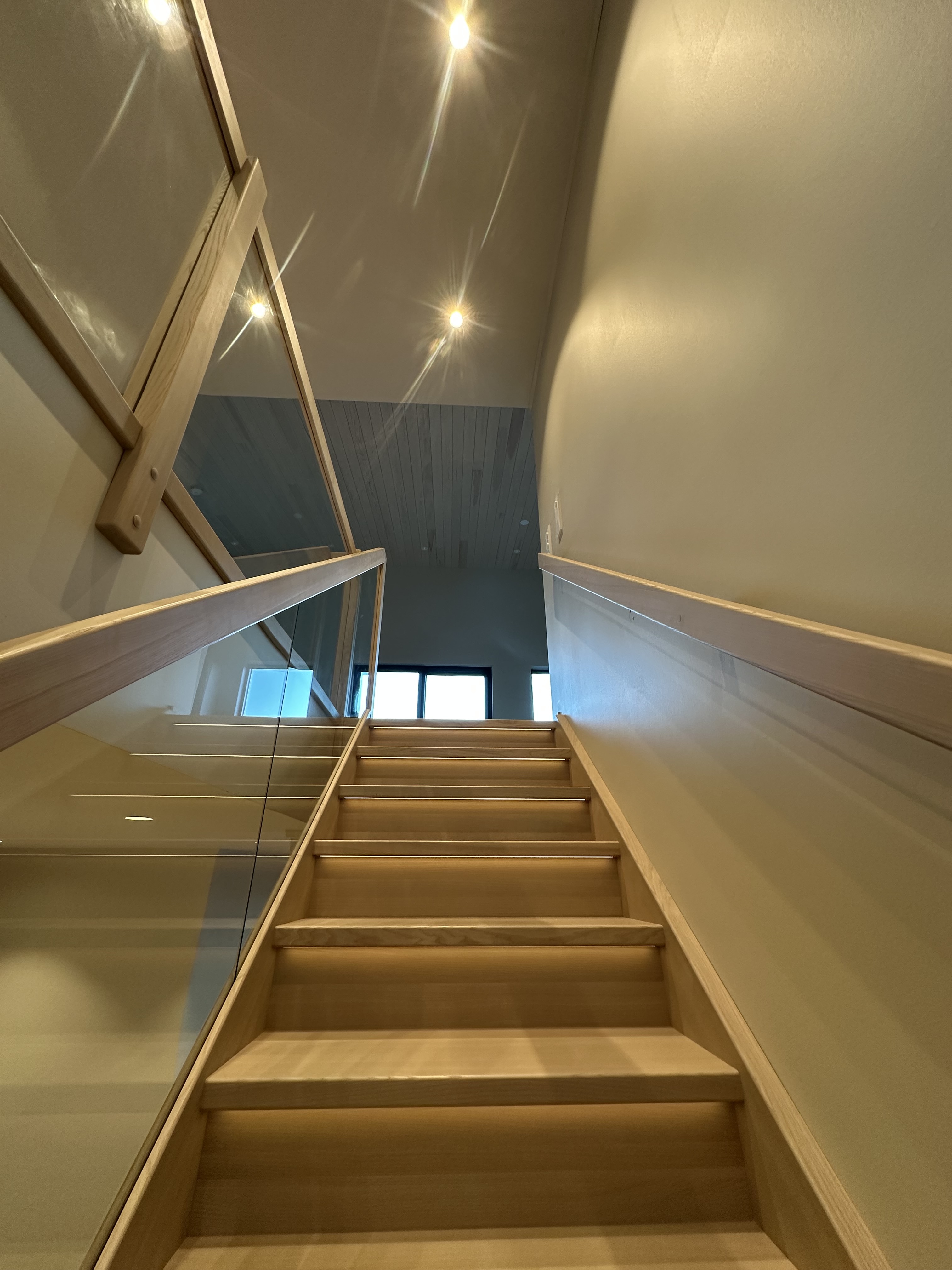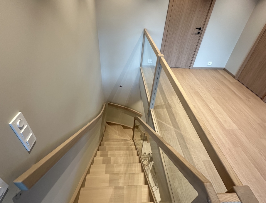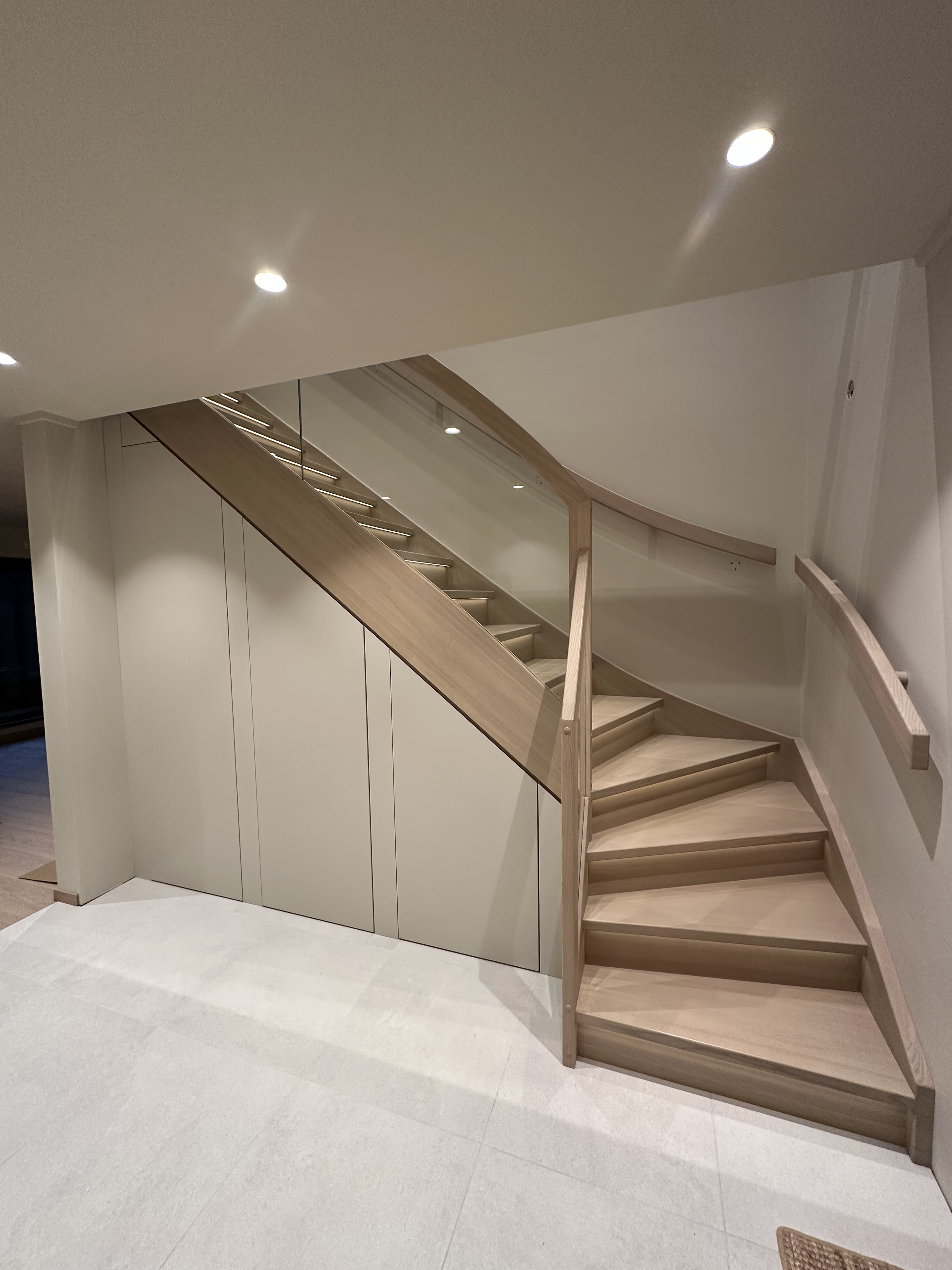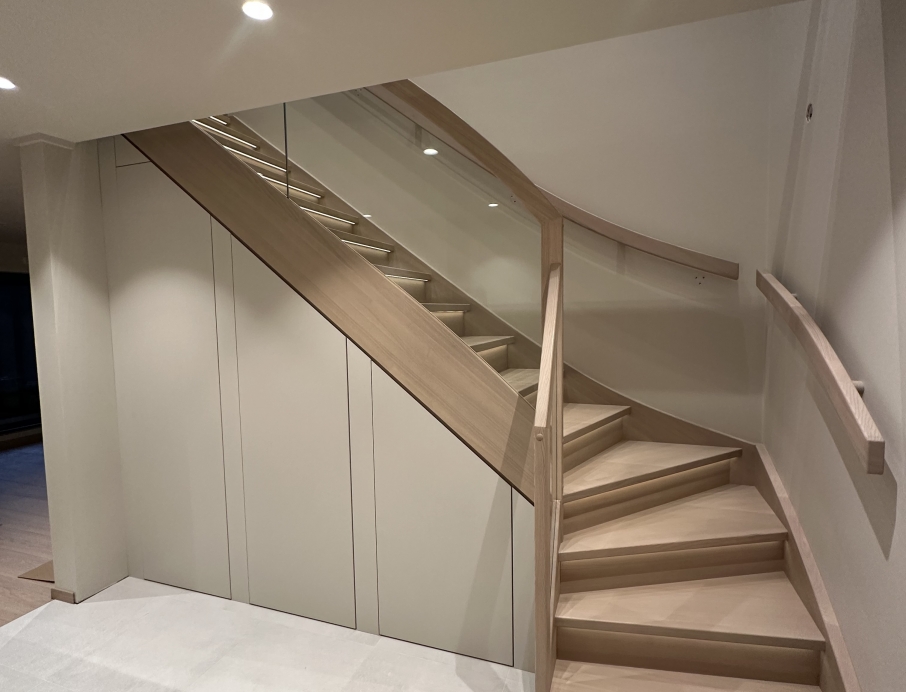 Элегантная и воздушная лестница из массива ясеня — все компоненты (ступени, тетивы, изогнутые ограждения и поручни) выполнены из одного и того же высококачественного светлого ясеня, создавая цельный, тёплый и неподвластный времени образ. Мягкая, плавная линия придаёт пространству скульптурный и гармоничный характер, а встроенная LED-подсветка под каждой ступенью создаёт мягкое, атмосферное свечение, подчёркивающее красивую текстуру древесины и обеспечивающее безопасность и эстетичность в вечернее время. Под лестницей расположена практичная кладовая, окрашенная в белый цвет, с дверцами шкафов, позволяющая рационально использовать пространство и поддерживать порядок. Современная лестница из ясеня со стеклянными элементами, высоким качеством исполнения и идеальным освещением — идеальный выбор для домов, сочетающих скандинавский минимализм, функциональность и роскошную отделку.