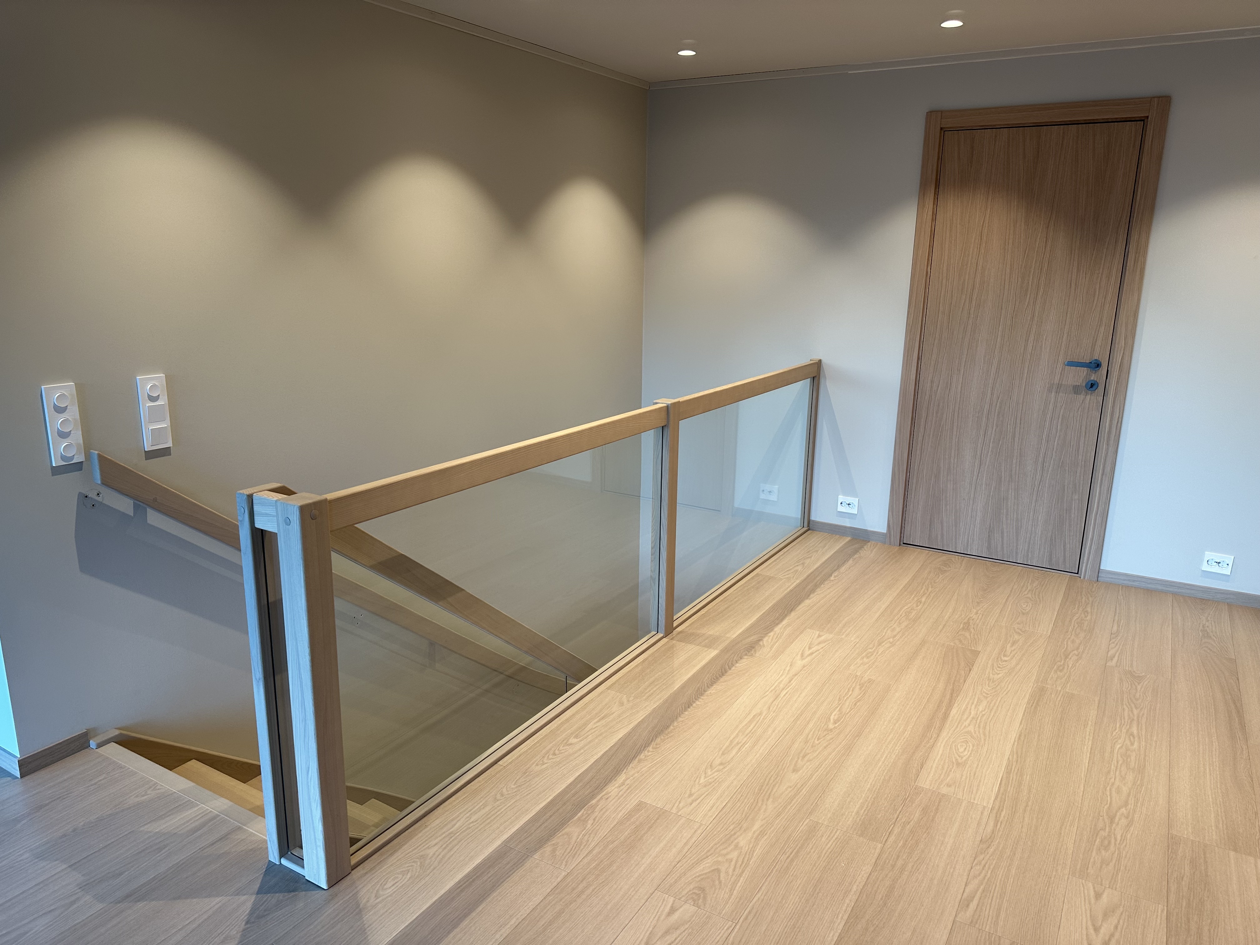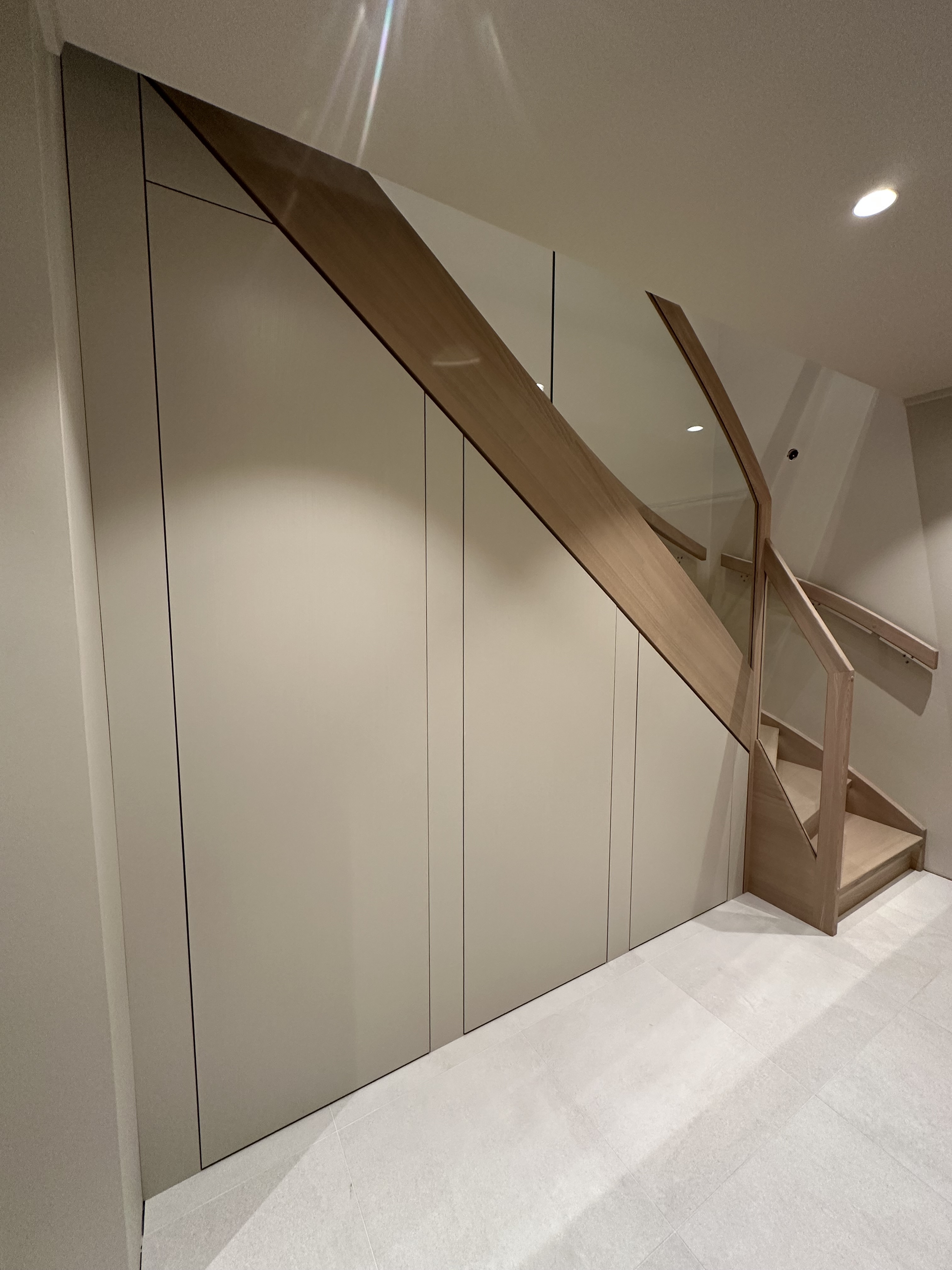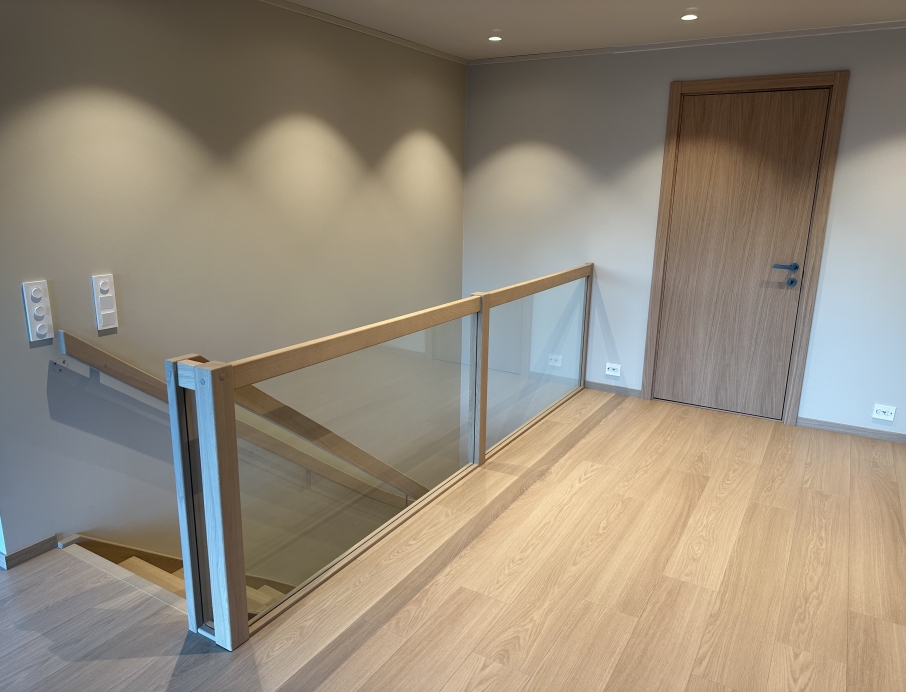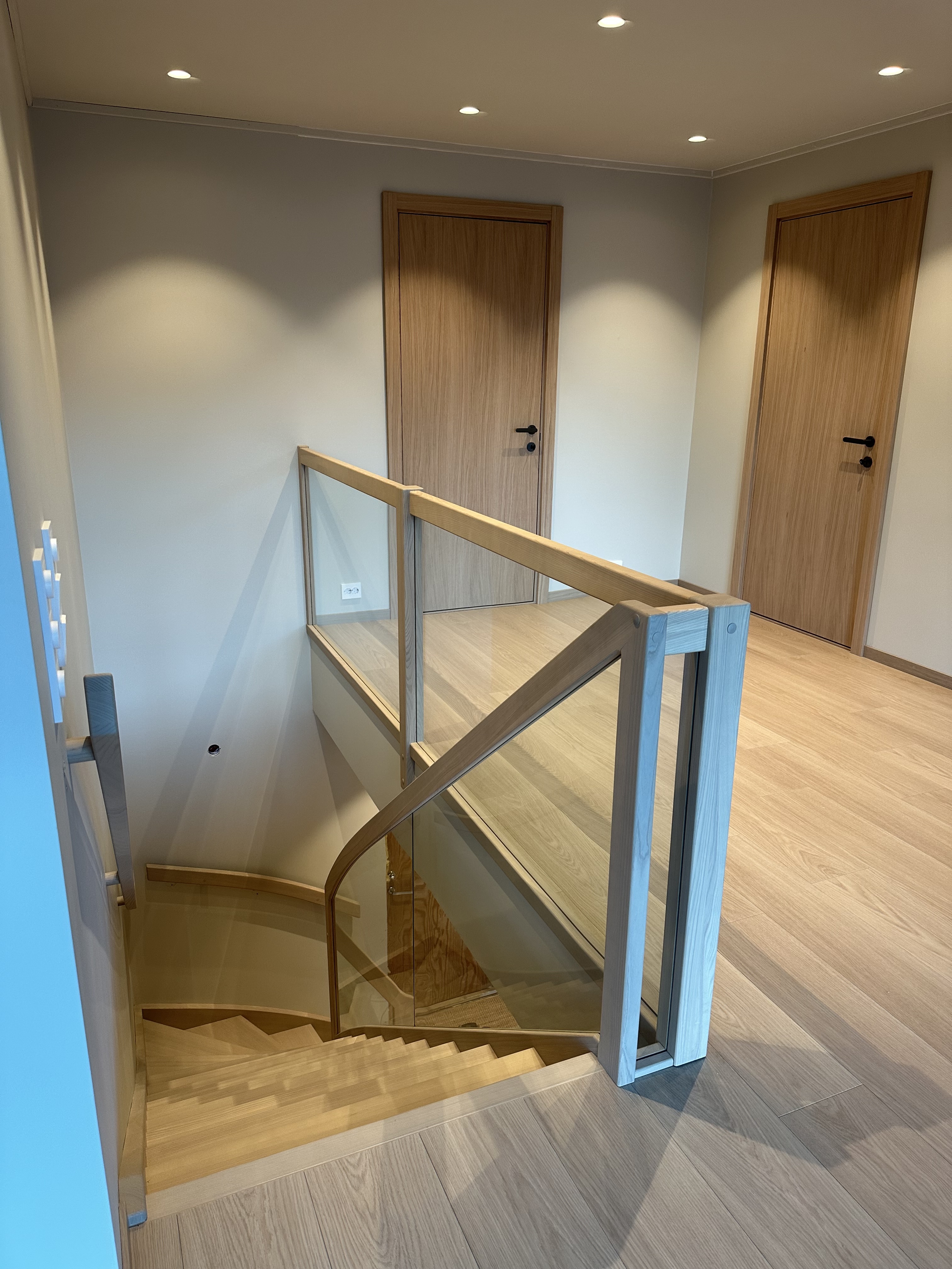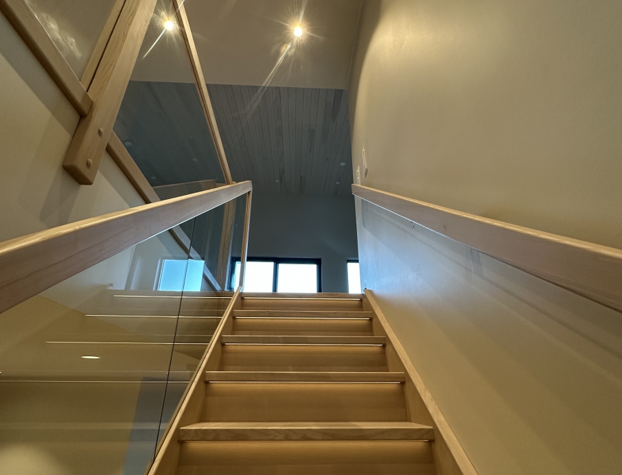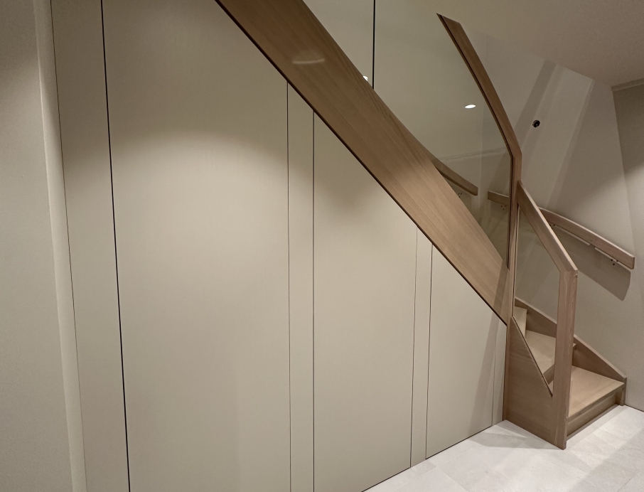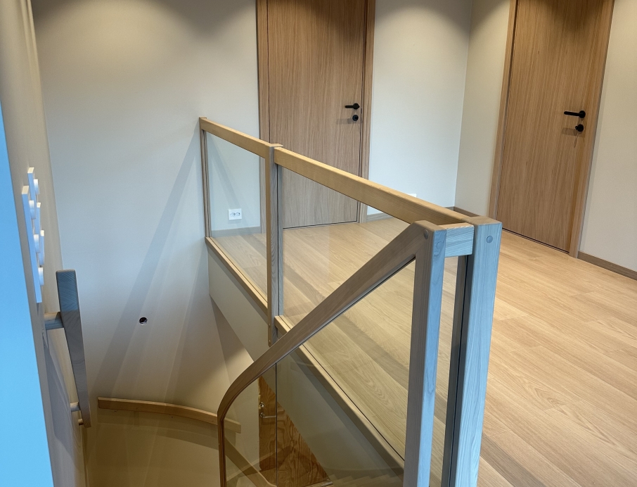 Элегантная и воздушная лестница из массива ясеня — все компоненты (ступени, тетивы, изогнутые ограждения и поручни) выполнены из одного и того же высококачественного светлого ясеня, создавая цельный, тёплый и неподвластный времени образ. Мягкая, плавная линия придаёт пространству скульптурный и гармоничный характер, а встроенная LED-подсветка под каждой ступенью создаёт мягкое, атмосферное свечение, подчёркивающее красивую текстуру древесины и обеспечивающее безопасность и эстетичность в вечернее время. Под лестницей расположена практичная кладовая, окрашенная в белый цвет, с дверцами шкафов, позволяющая рационально использовать пространство и поддерживать порядок. Современная лестница из ясеня со стеклянными элементами, высоким качеством исполнения и идеальным освещением — идеальный выбор для домов, сочетающих скандинавский минимализм, функциональность и роскошную отделку.