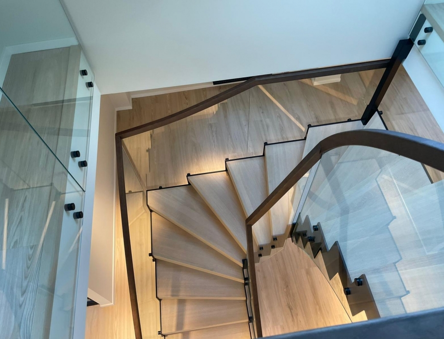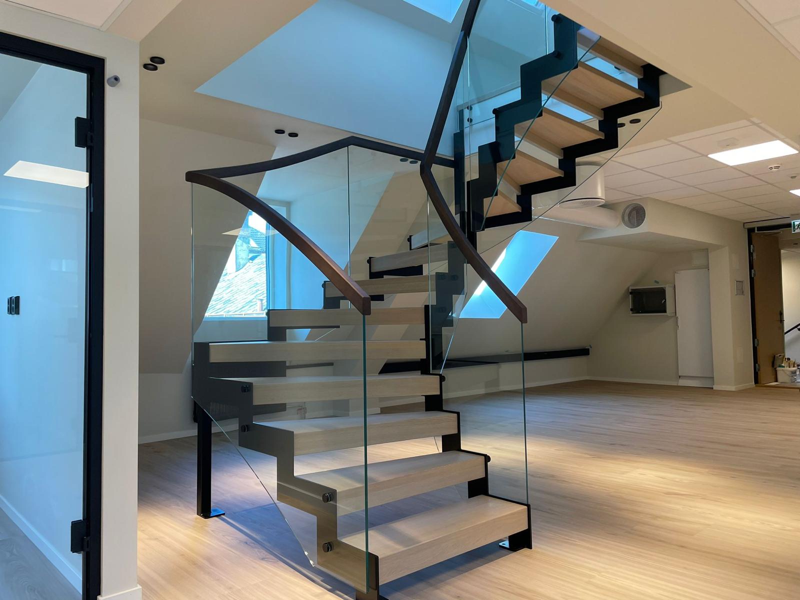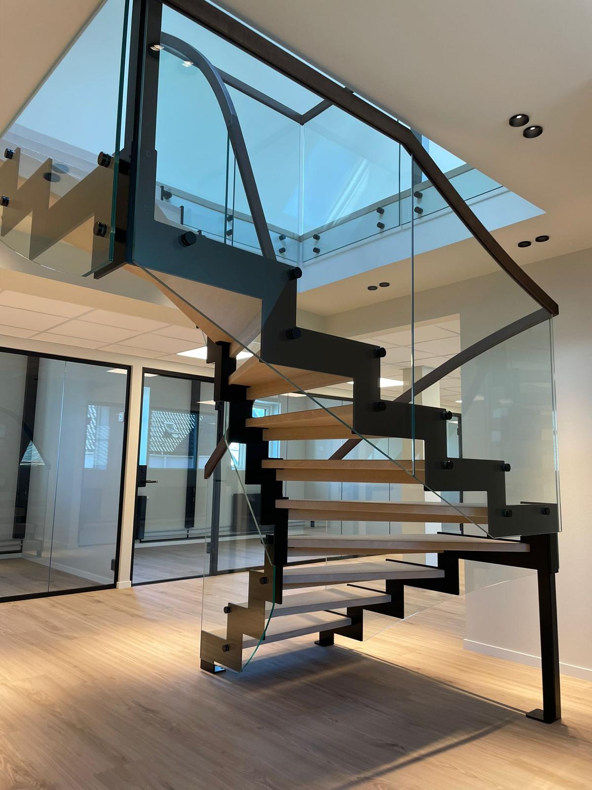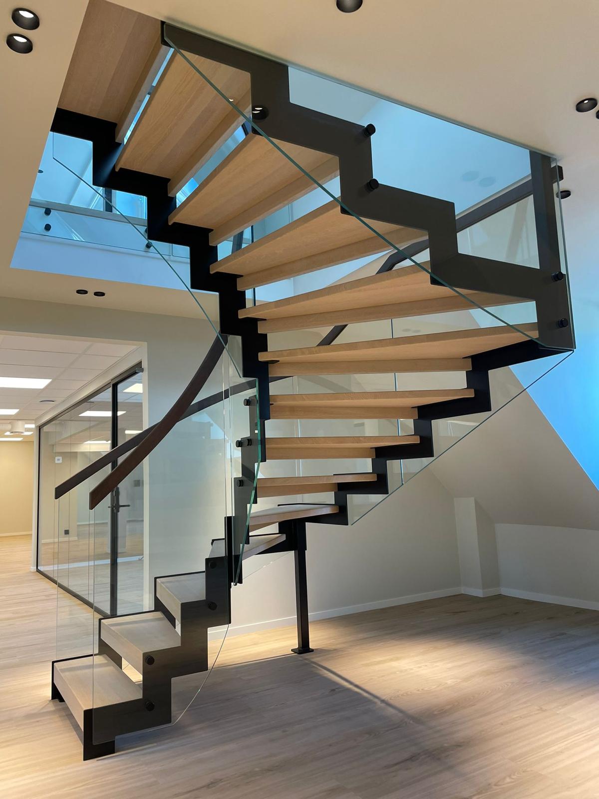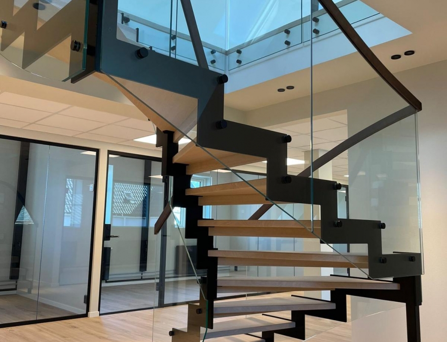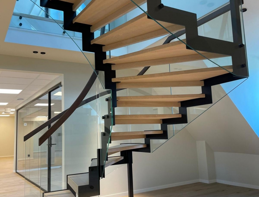 Эффектная современная стальная лестница из черной окрашенной стали с зубчатым косоуром, создающим брутальный, индустриальный и уникальный образ. L-образные ступени из светлого дуба образуют теплый контраст с темной сталью и придают естественное скандинавское очарование. Стеклянное ограждение лаконичного дизайна сохраняет ощущение простора и легкости, а парящая конструкция — установленная без соприкосновения со стенами — превращает лестницу в настоящий дизайнерский акцент. Один угол элегантно опирается на колонну, другой свободно подвешен к балке, обеспечивая максимальную визуальную легкость и эффект «вау». Идеально подходит для офиса, дома или лофта, где дизайн сочетается с прочным качеством — лестница, становящаяся центром интерьера.