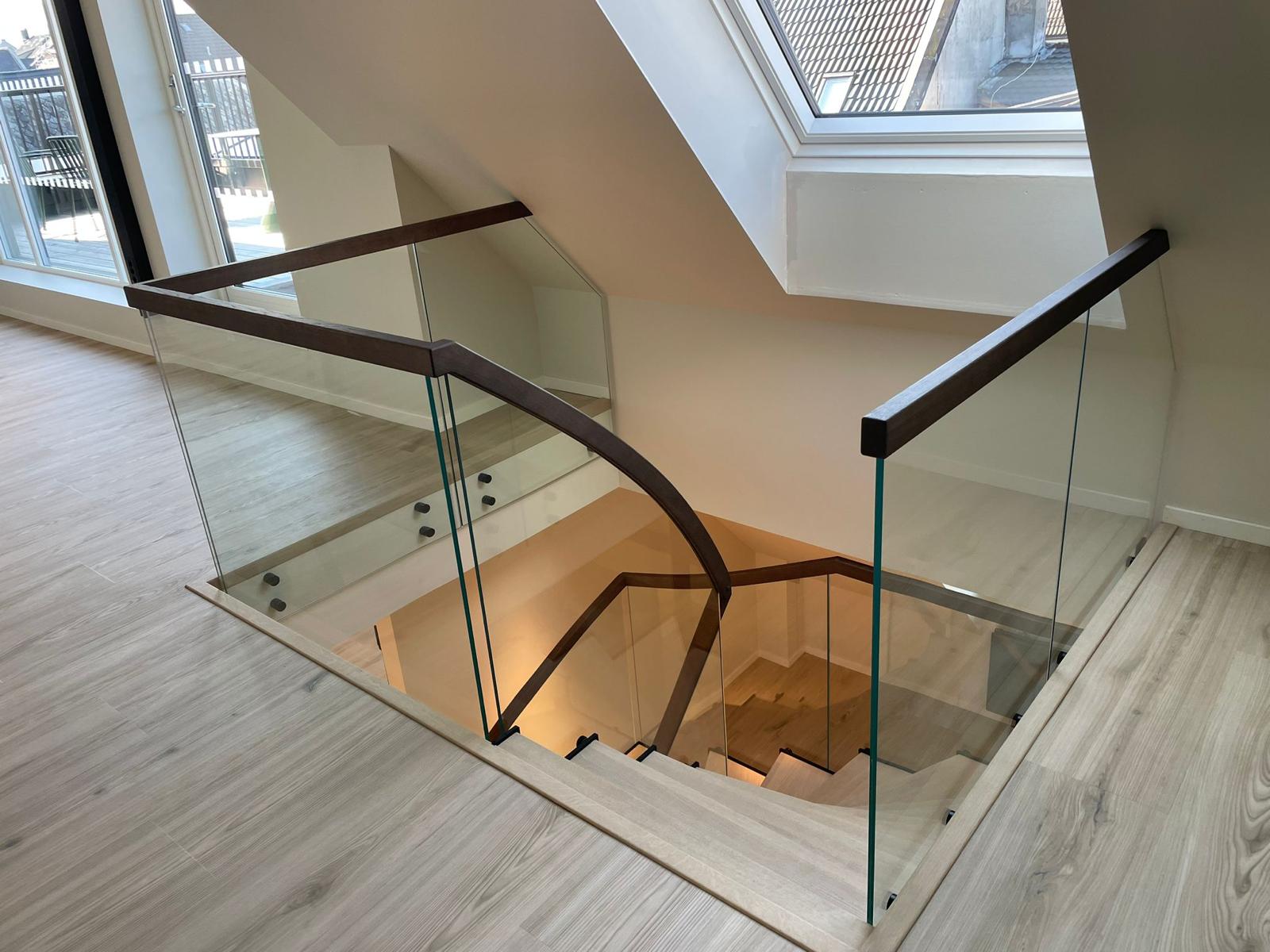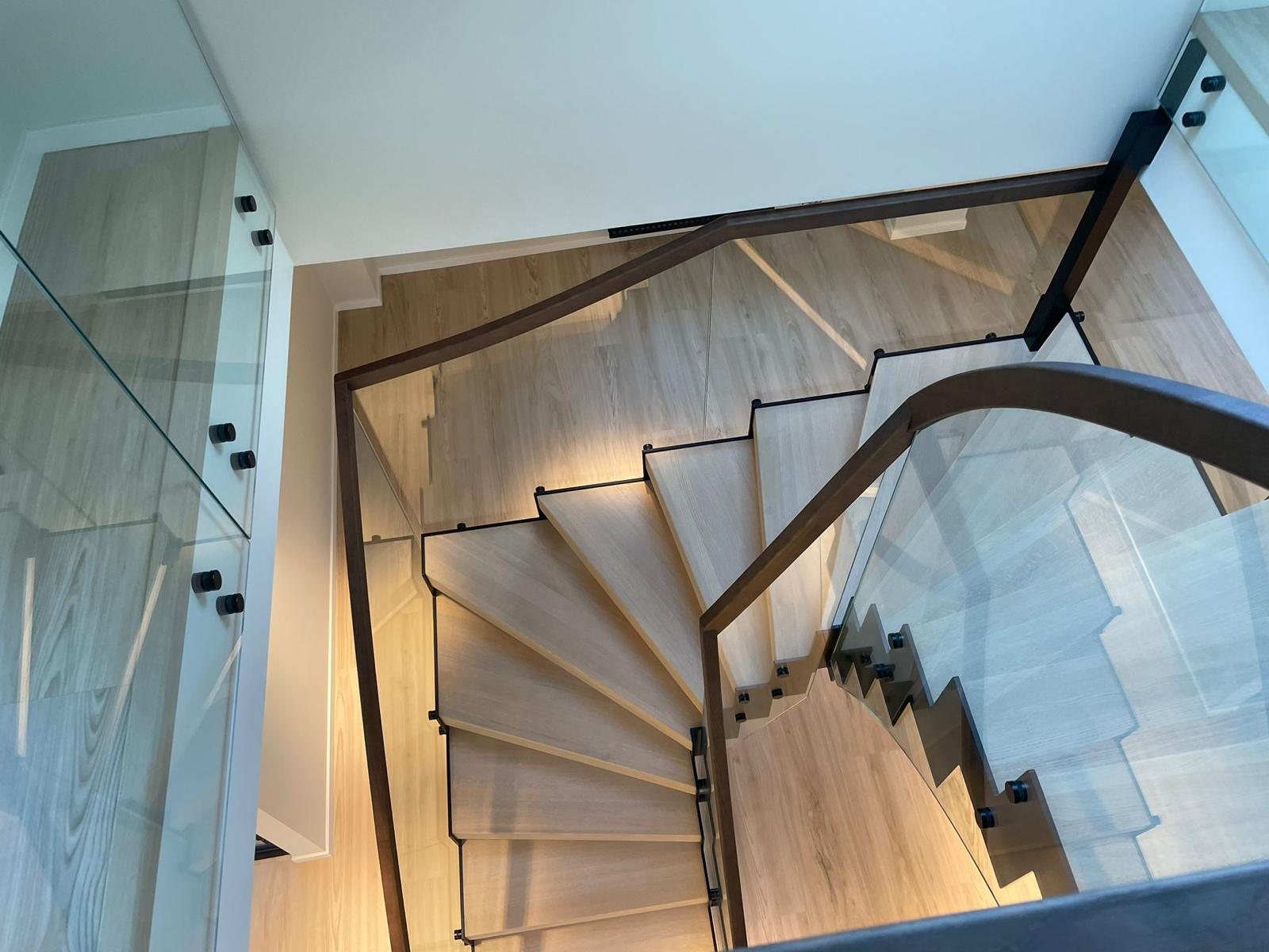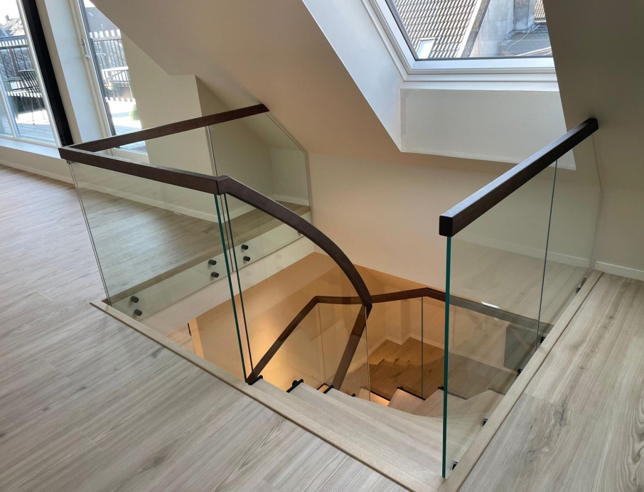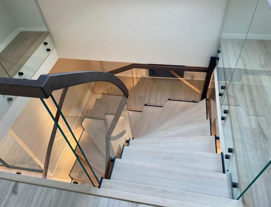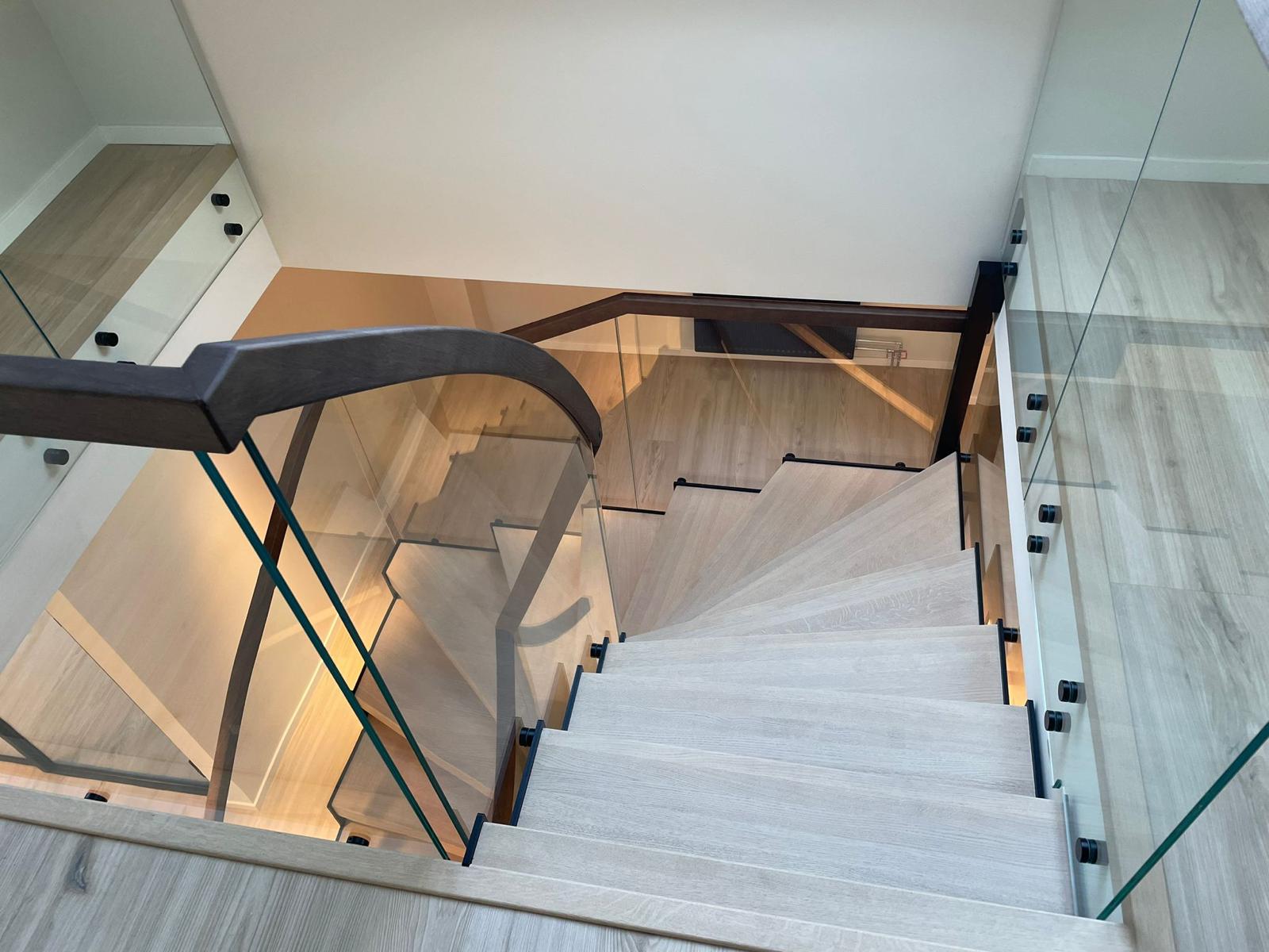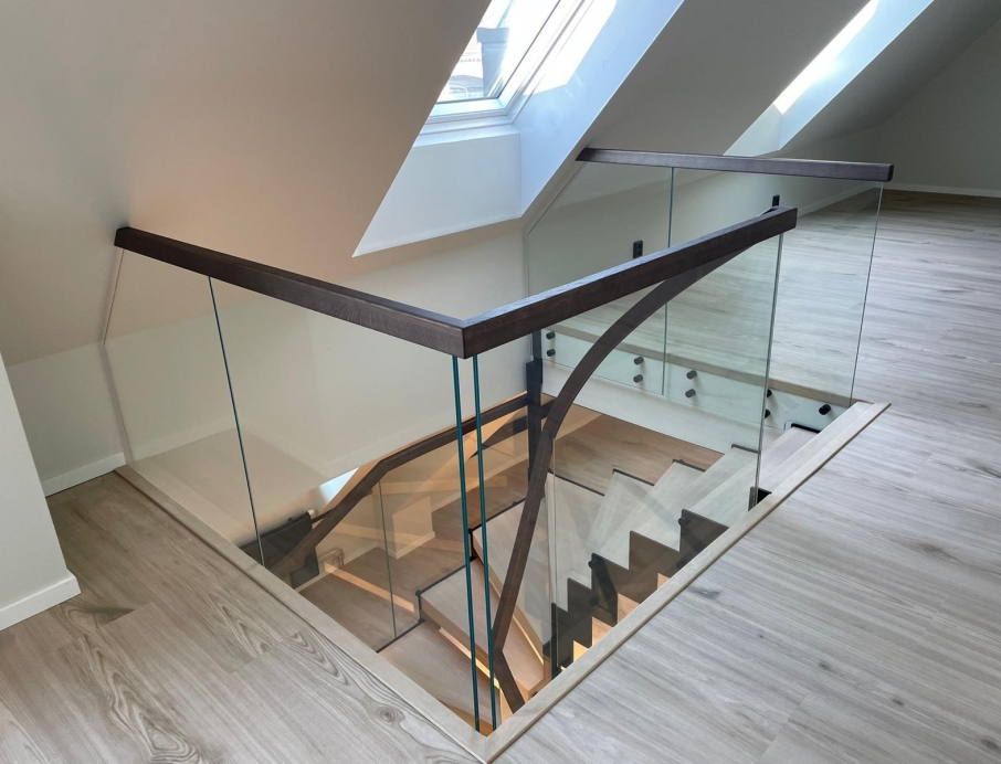 Эффектная современная стальная лестница из черной окрашенной стали с зубчатым косоуром, создающим брутальный, индустриальный и уникальный образ. L-образные ступени из светлого дуба образуют теплый контраст с темной сталью и придают естественное скандинавское очарование. Стеклянное ограждение лаконичного дизайна сохраняет ощущение простора и легкости, а парящая конструкция — установленная без соприкосновения со стенами — превращает лестницу в настоящий дизайнерский акцент. Один угол элегантно опирается на колонну, другой свободно подвешен к балке, обеспечивая максимальную визуальную легкость и эффект «вау». Идеально подходит для офиса, дома или лофта, где дизайн сочетается с прочным качеством — лестница, становящаяся центром интерьера.