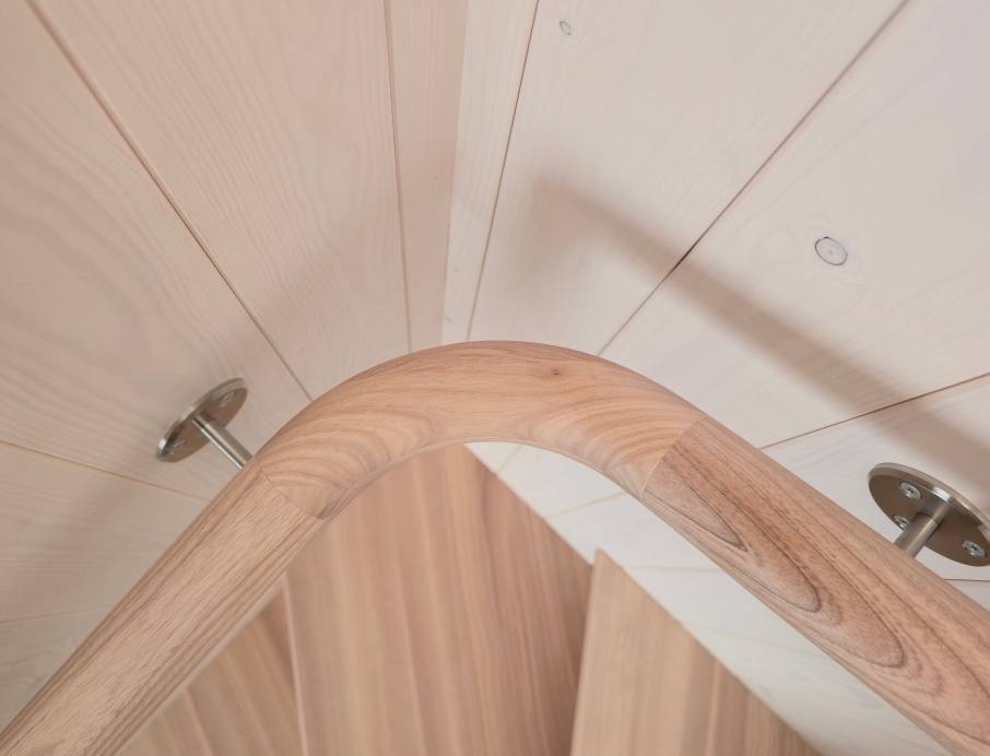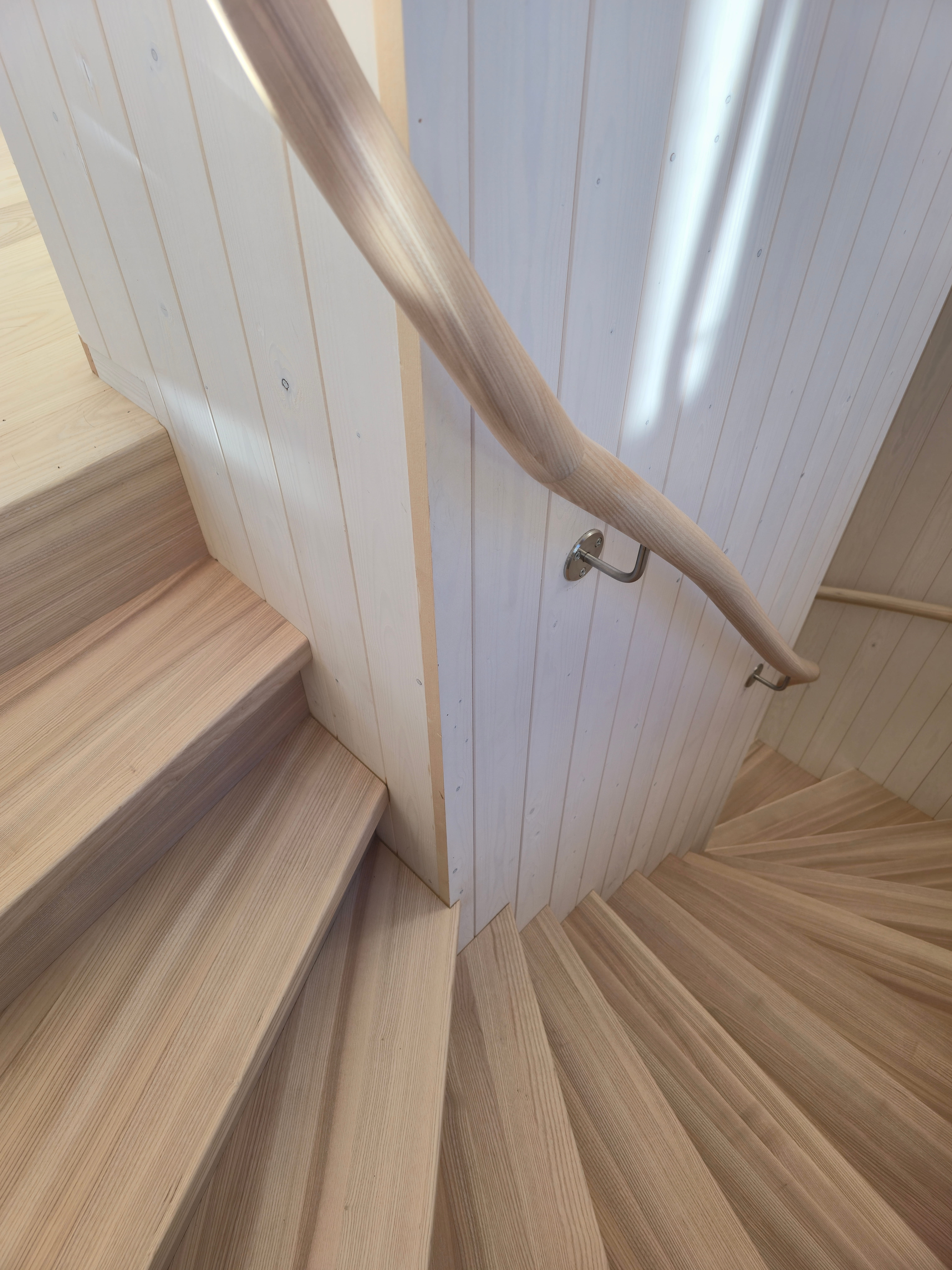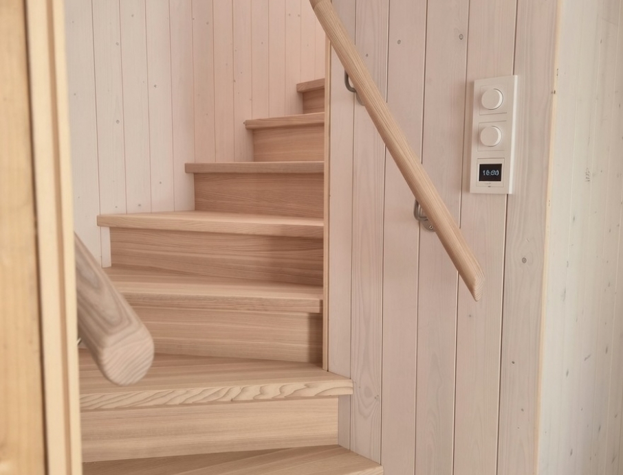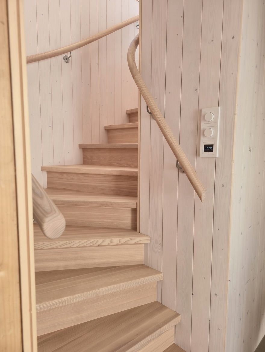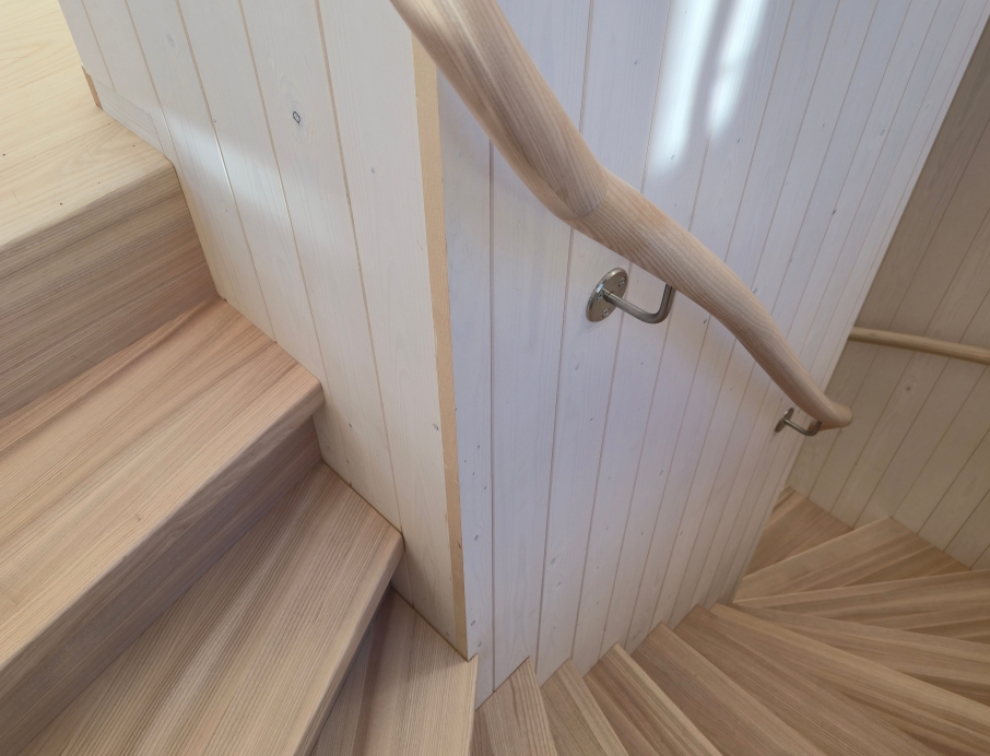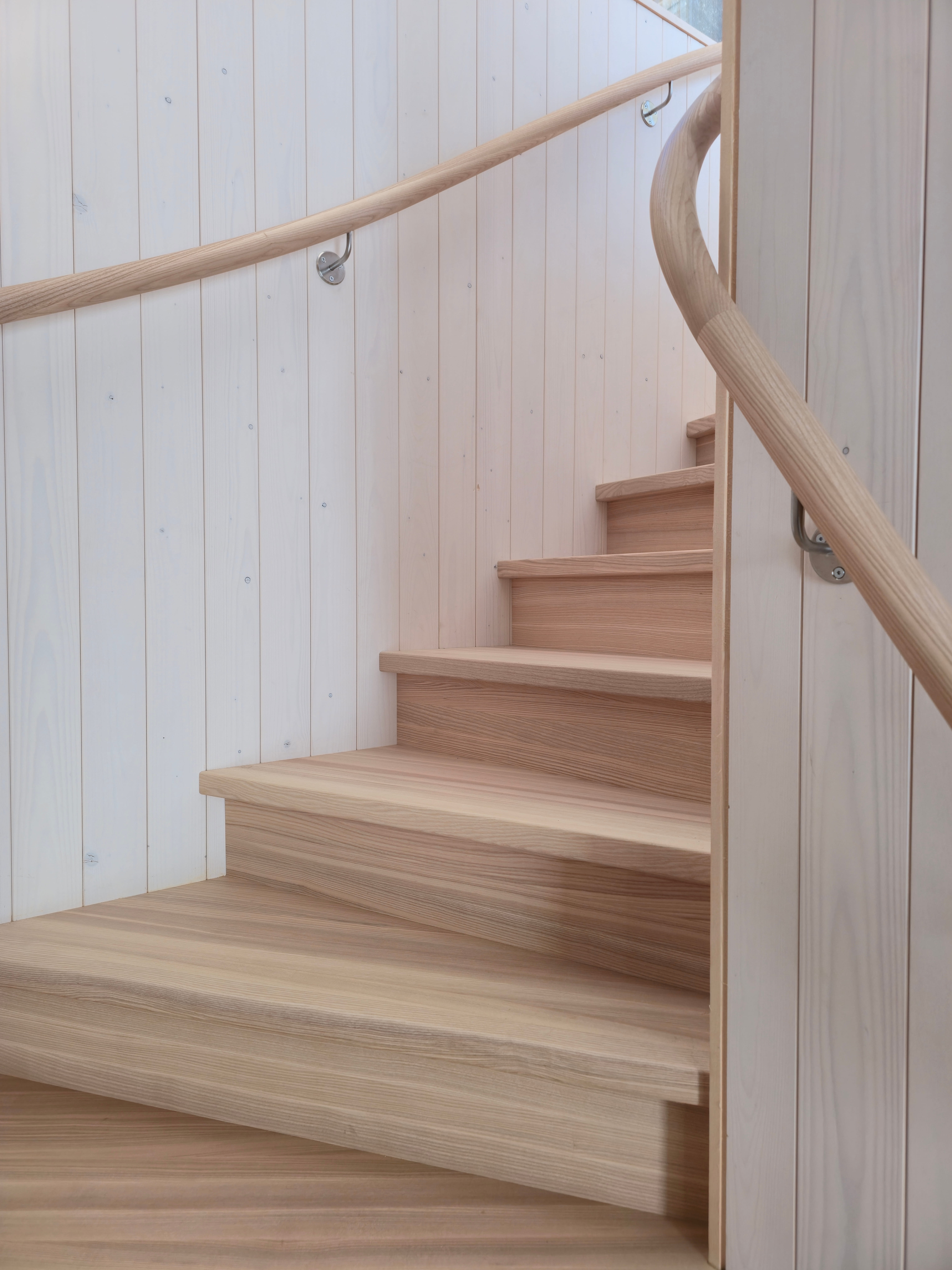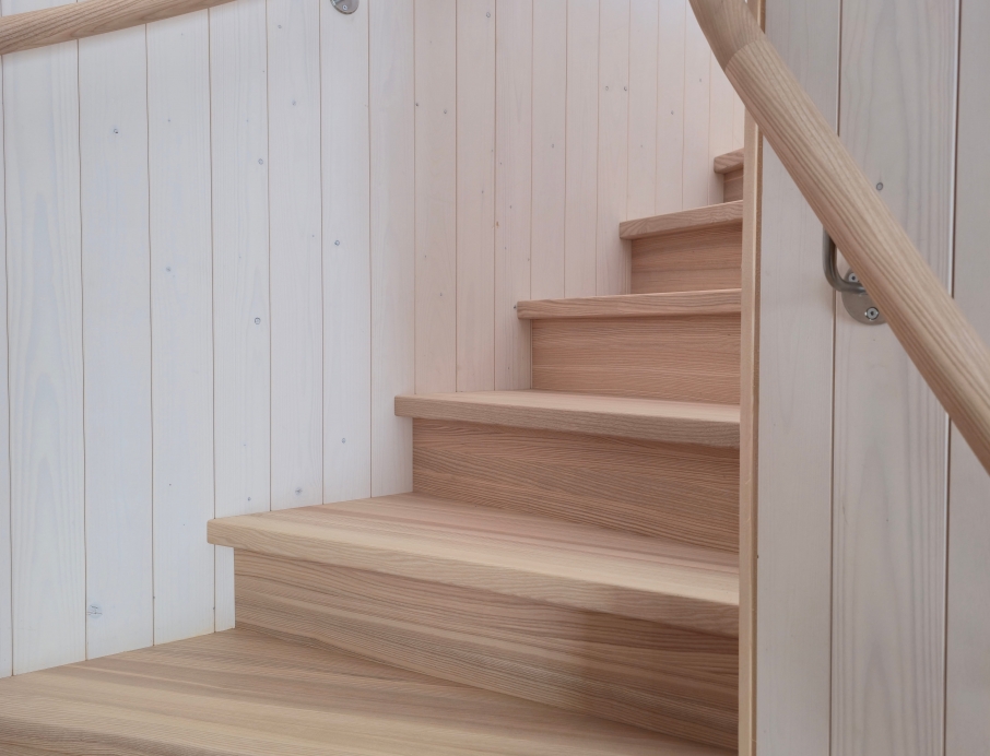 Элегантная минималистичная лестница из светлого ясеня — это вневременной скандинавский дизайн со скрытыми тетивами, прочными ступенями и непрерывным круглым поручнем из того же материала. Поручень плавно поднимается вверх и идеально совпадает по цвету с полом верхнего этажа. Светлые, тёплые поверхности из ясеня создают лёгкое и гармоничное впечатление в сочетании с панельными стенами. Идеальный выбор для современного скандинавского интерьера, где качество, функциональность и эстетика идут рука об руку. Лестница, которая ощущается одновременно безопасной и гостеприимной.