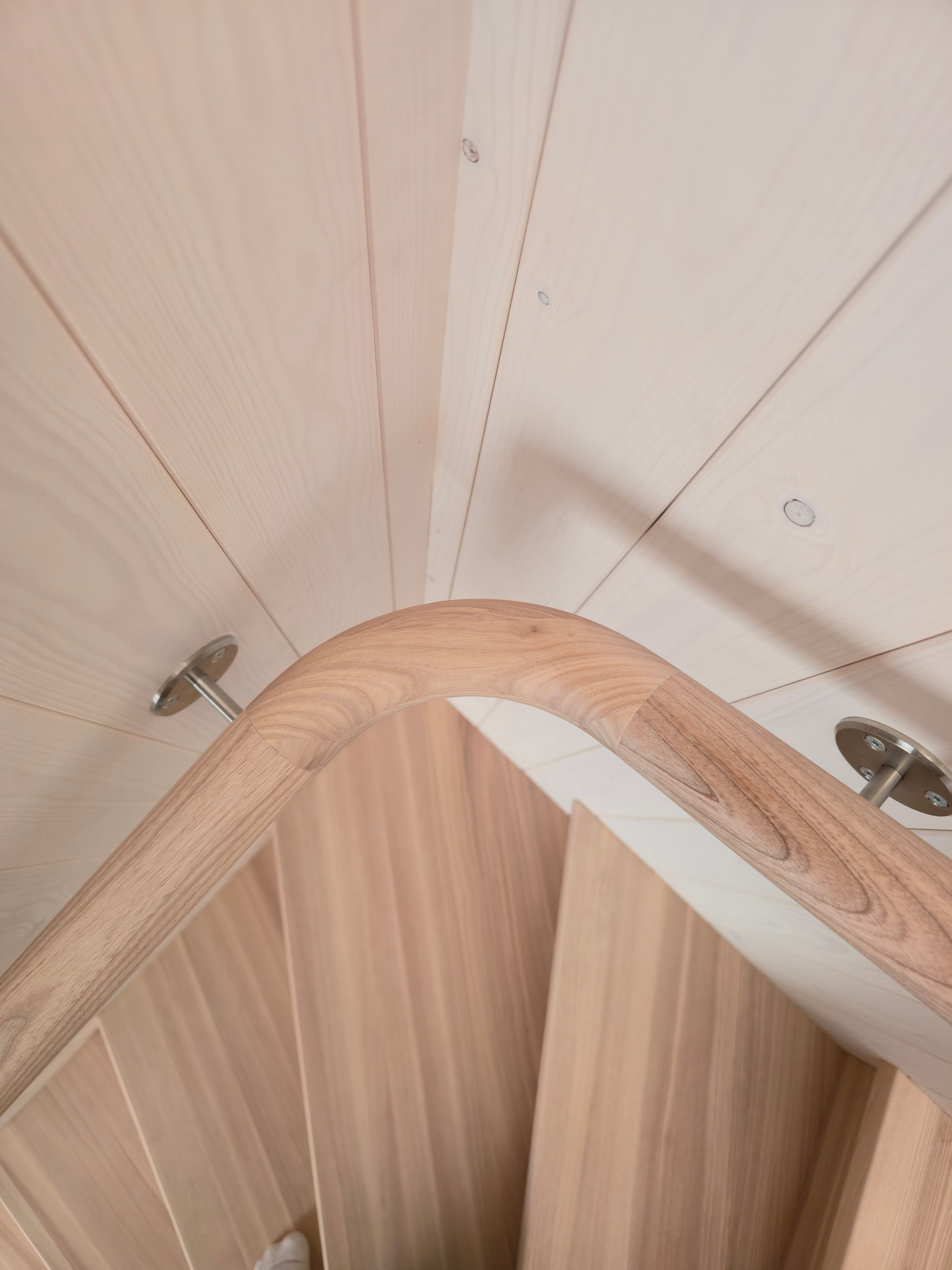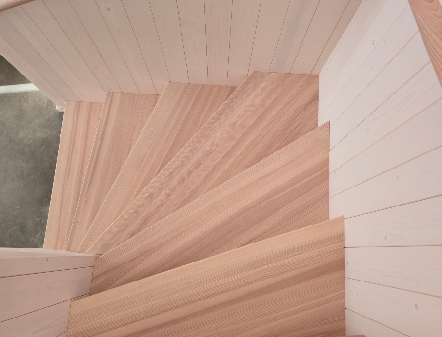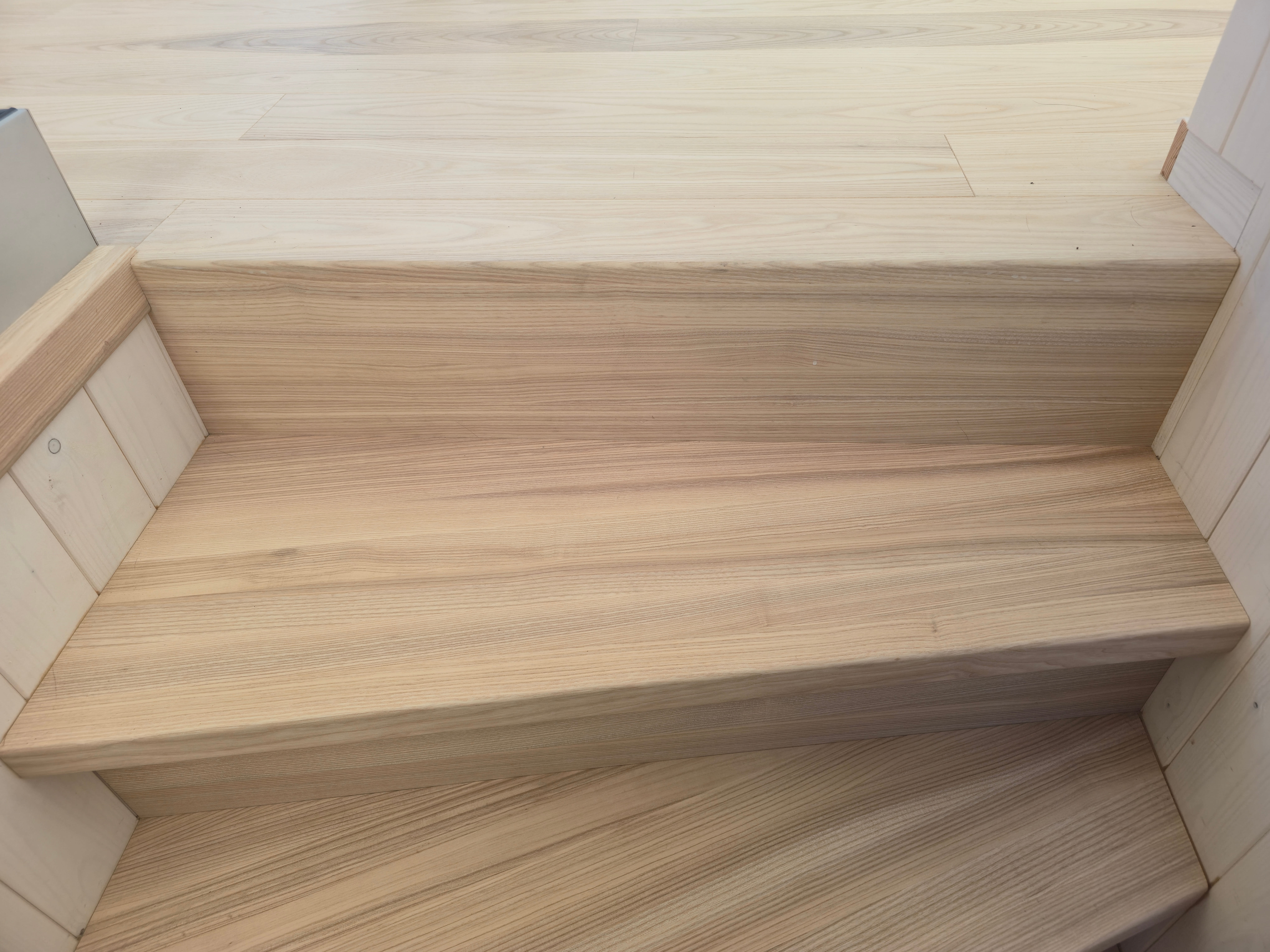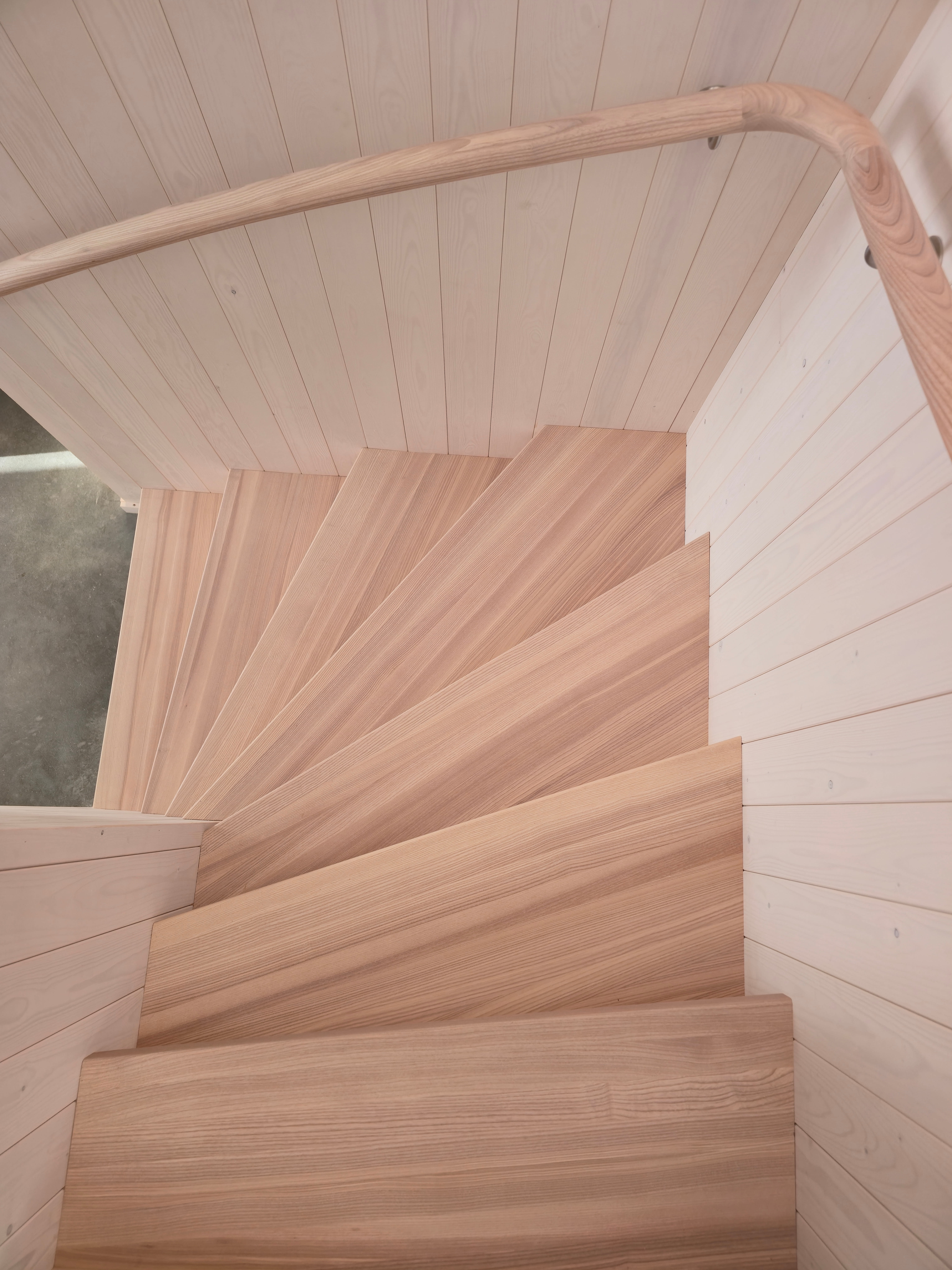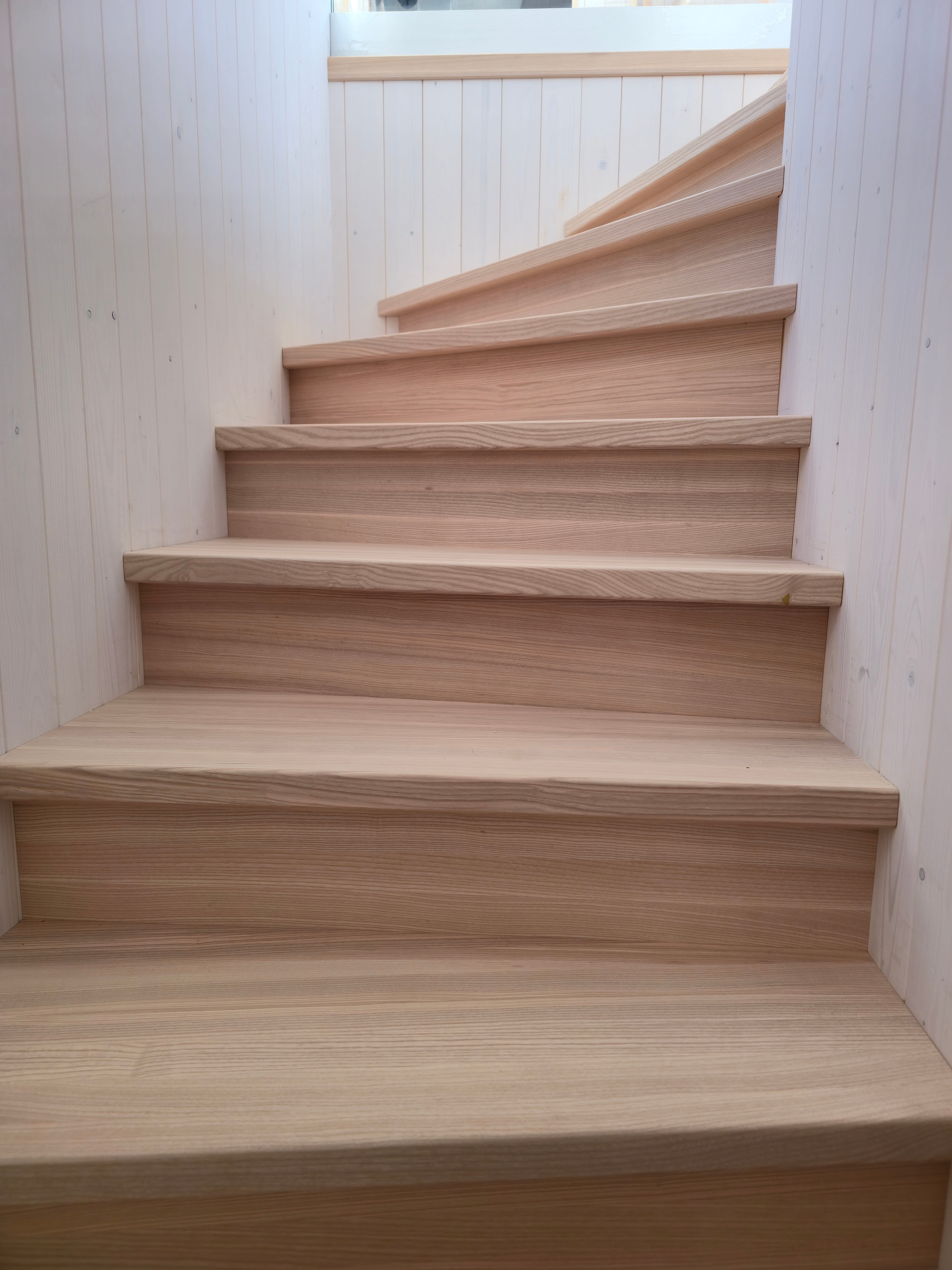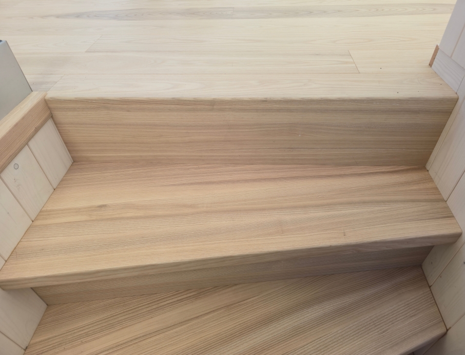 Элегантная минималистичная лестница из светлого ясеня — это вневременной скандинавский дизайн со скрытыми тетивами, прочными ступенями и непрерывным круглым поручнем из того же материала. Поручень плавно поднимается вверх и идеально совпадает по цвету с полом верхнего этажа. Светлые, тёплые поверхности из ясеня создают лёгкое и гармоничное впечатление в сочетании с панельными стенами. Идеальный выбор для современного скандинавского интерьера, где качество, функциональность и эстетика идут рука об руку. Лестница, которая ощущается одновременно безопасной и гостеприимной.