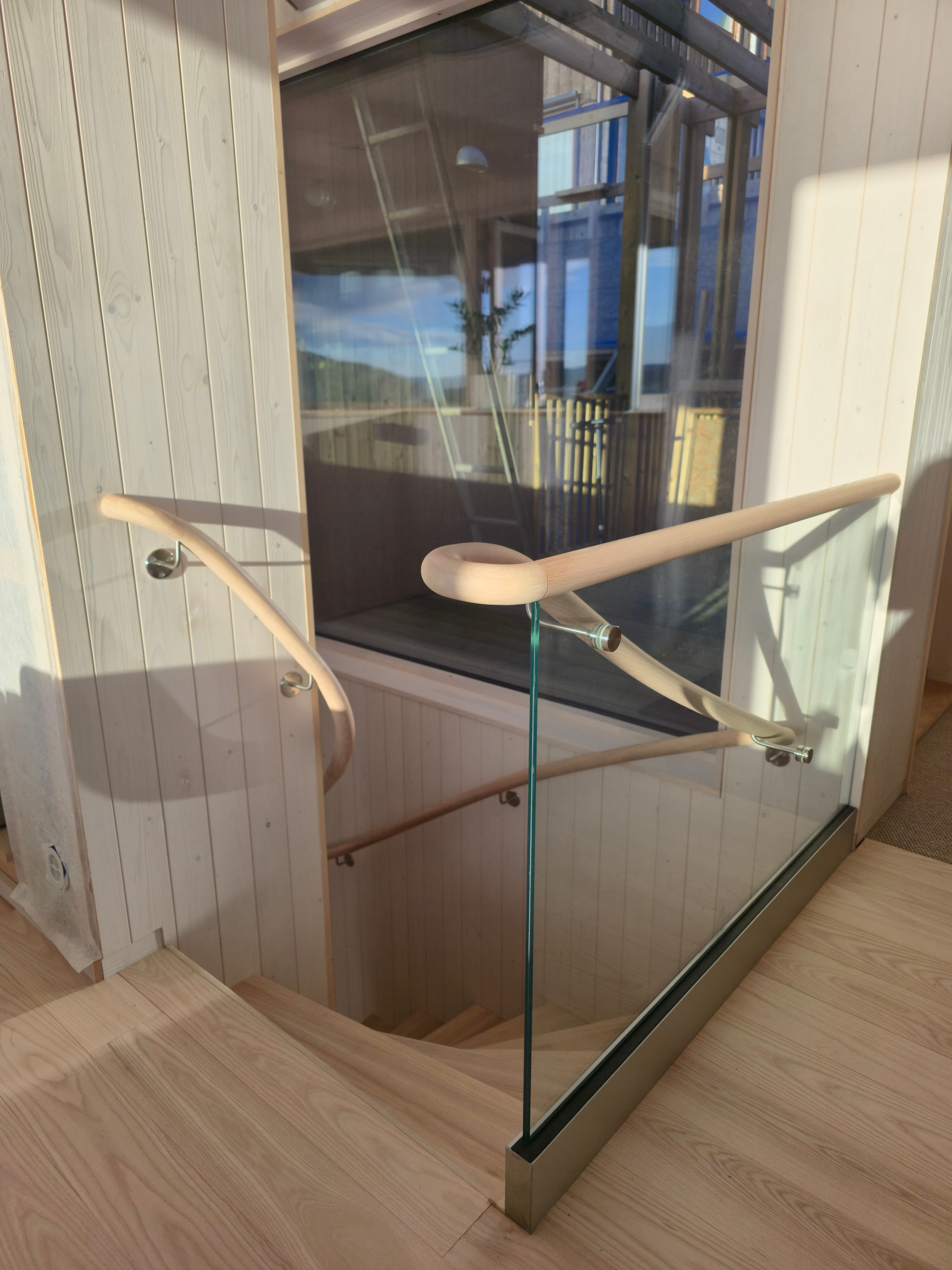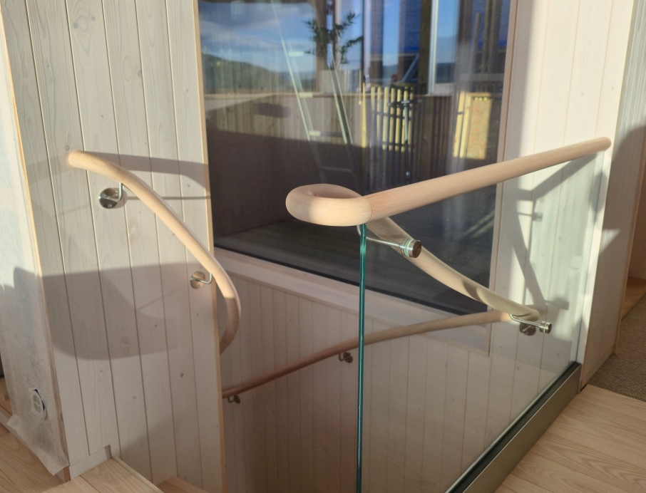 Ограждение: Круглый деревянный поручень, наверху — стеклянное ограждение