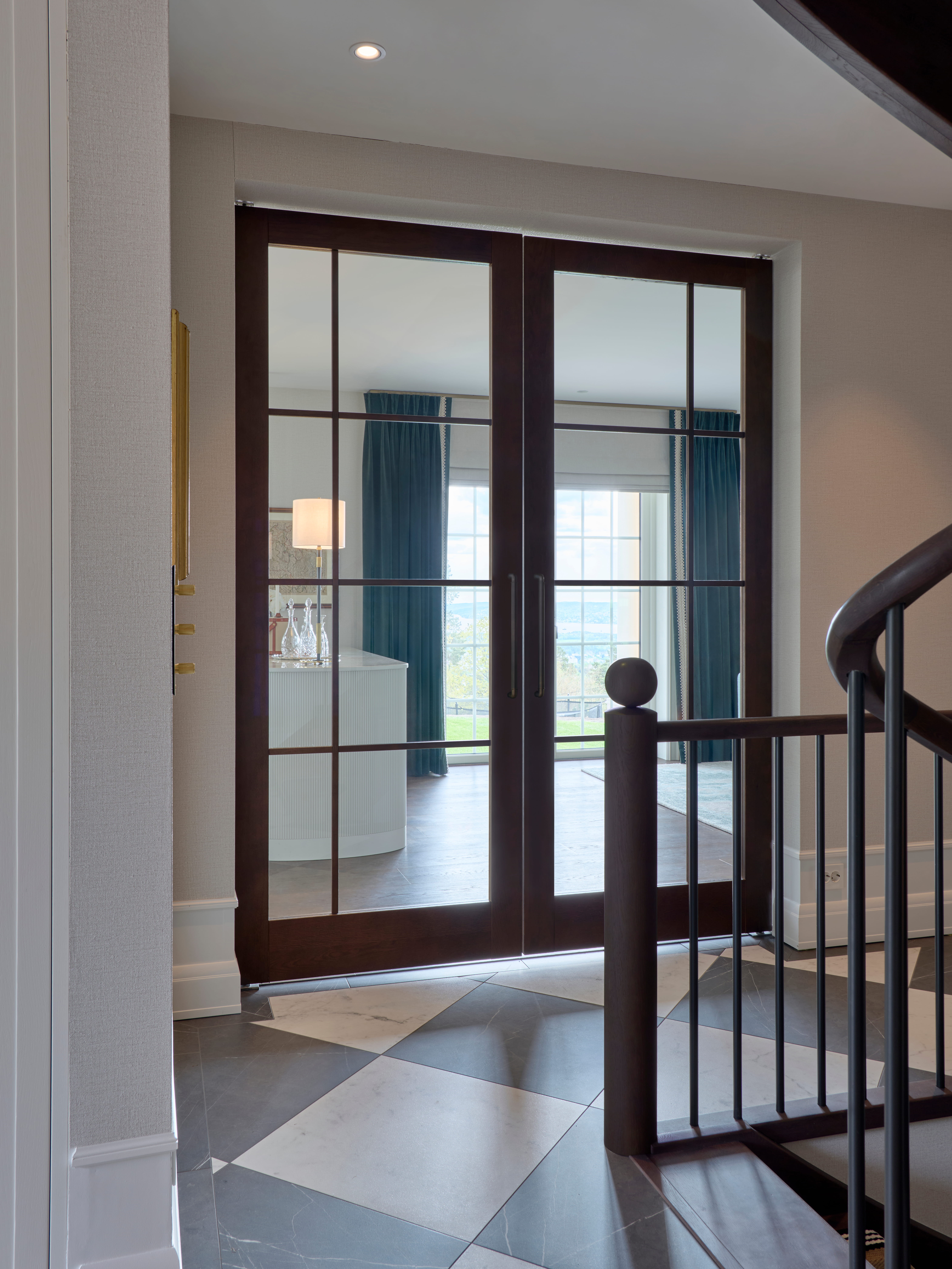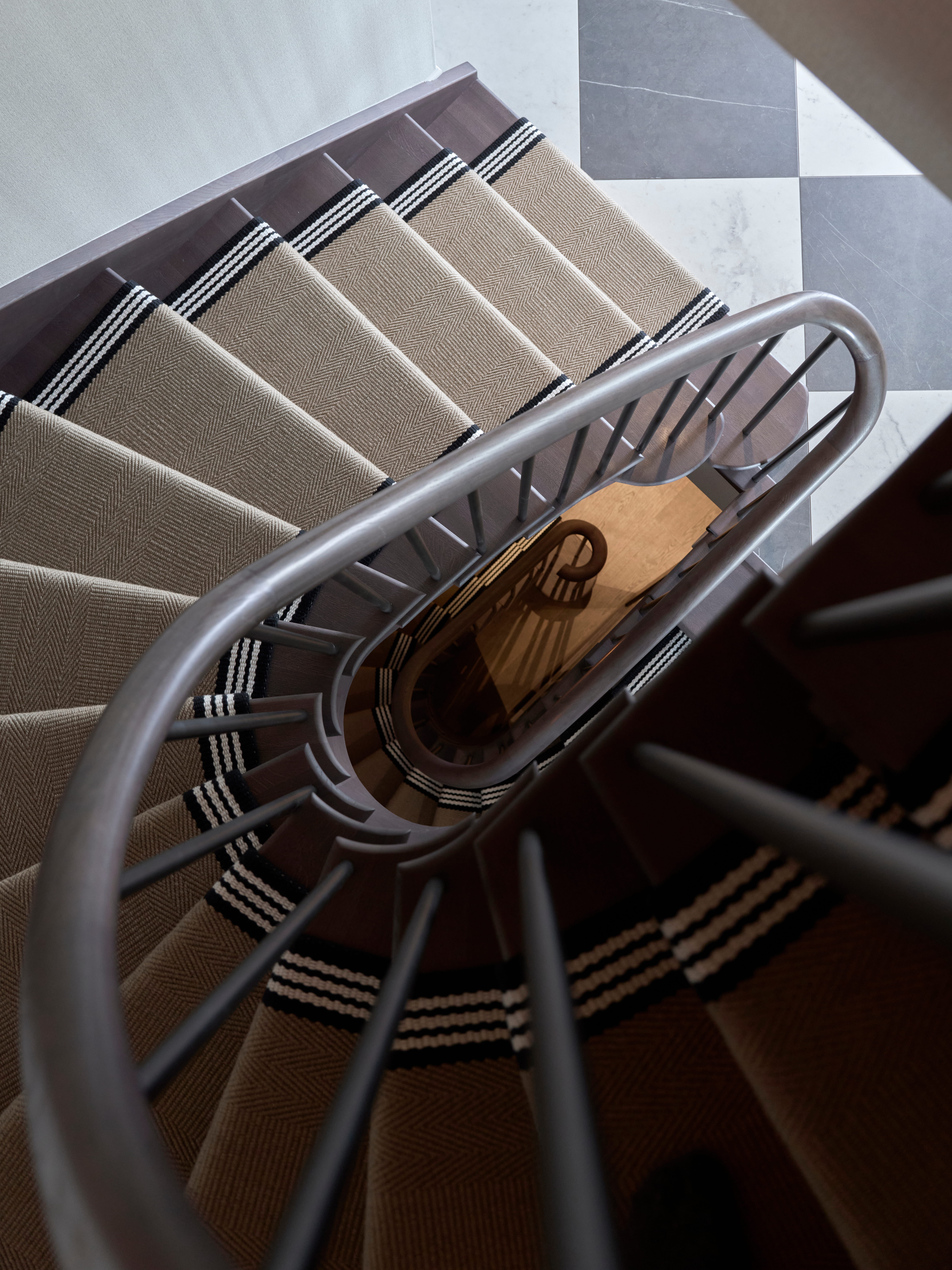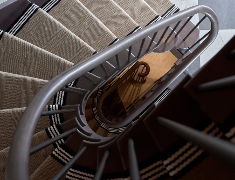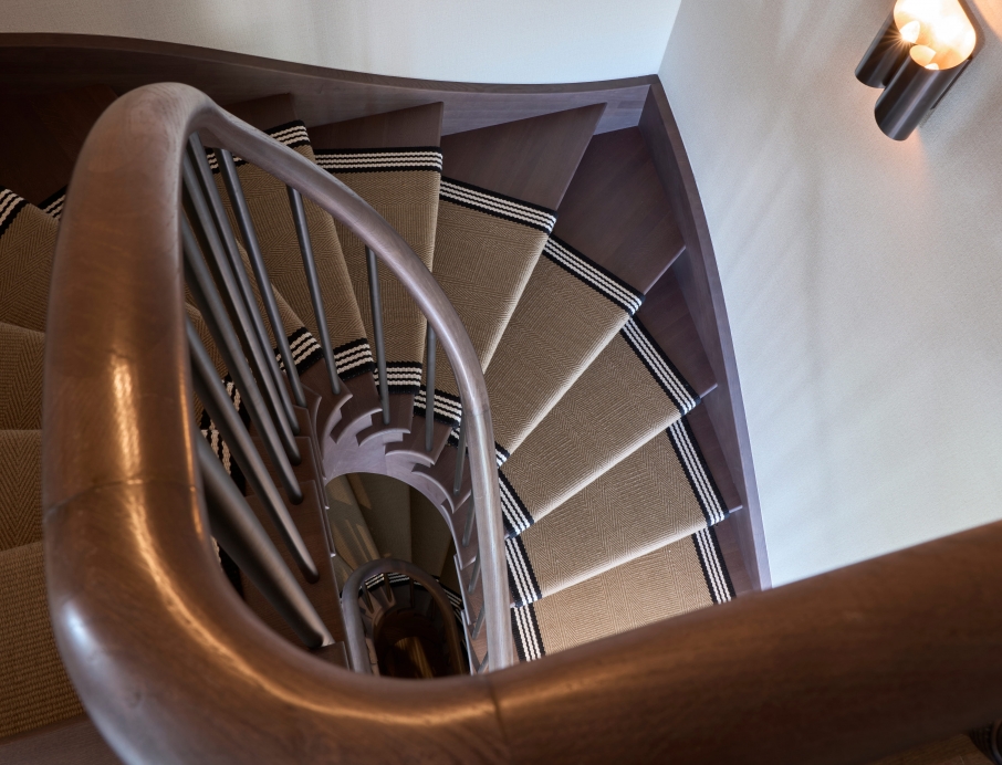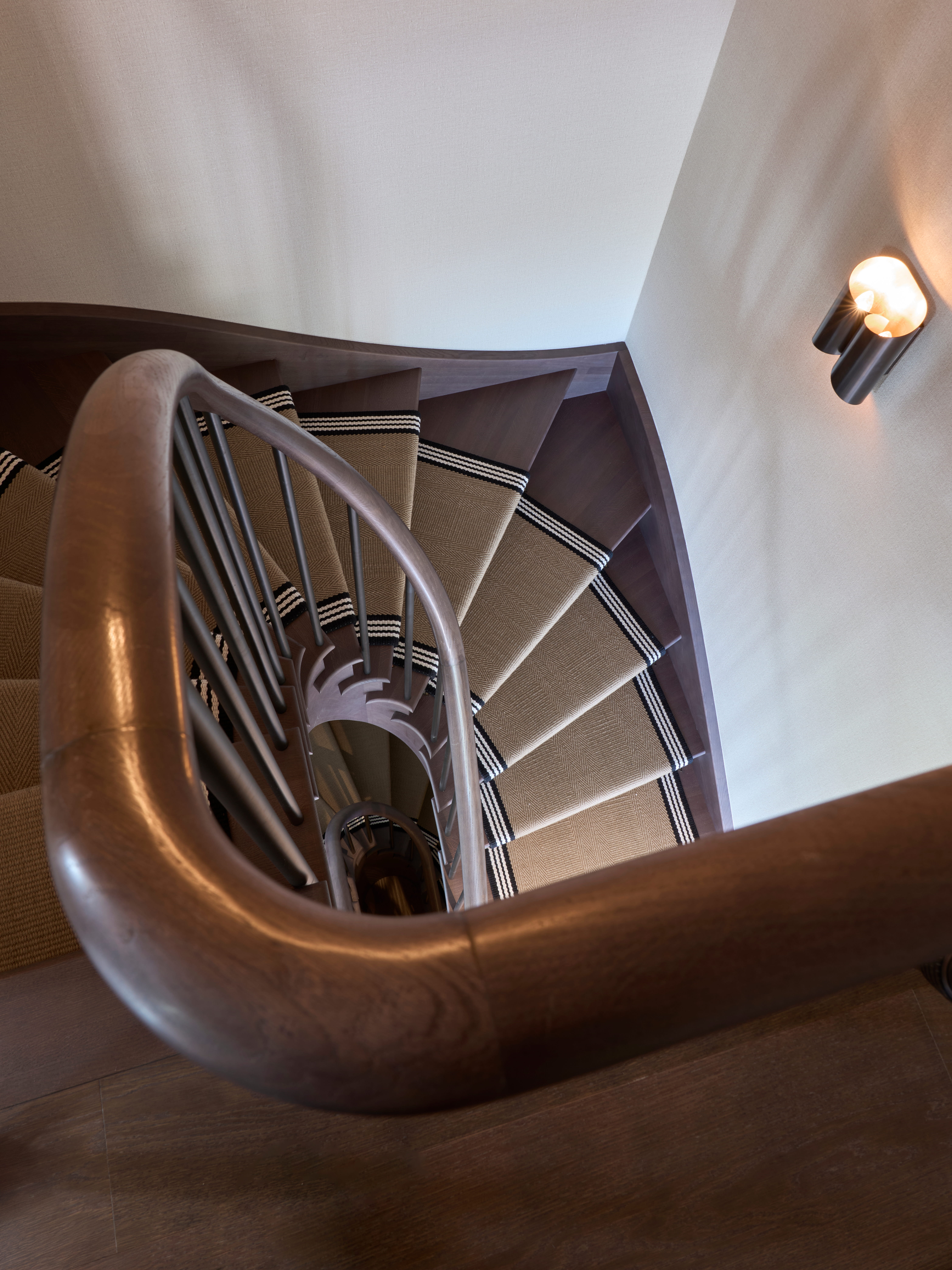 Prabangi ąžuolo masyvo laiptų konstrukcija, sukurta Linn Aamodt iš „Caiax Interiør Design AS“ – tikras skandinaviškos elegancijos šedevras. Visi komponentai (pakopos, laiptasija ir vientisas lenktas turėklas) pagaminti iš to paties šilto ąžuolo masyvo, sukuriant vientisą ir laikui nepavaldų įvaizdį. Lenkta laiptasija grakščiai kyla palei tamsią, siaurą turėklų konstrukciją, o švelni turėklo kreivė sujungia visus laiptus į harmoningą visumą. Po laiptais paslėpta įspūdinga vyno patalpa už stiklinų durų su tamsaus ąžuolo rėmu – puikiai tinkanti kolekcininkams, su kontroliuojamu klimatu ir dramatišku apšvietimu. Nuotrauką padarė interjero fotografas Ragnar Hartvig. Tai dizaino laiptai, kuriuose dera funkcionalumas, prabanga ir „wow“ efektas – idealu išskirtiniams namams, vertinantiems vyną ir aukštą estetiką.