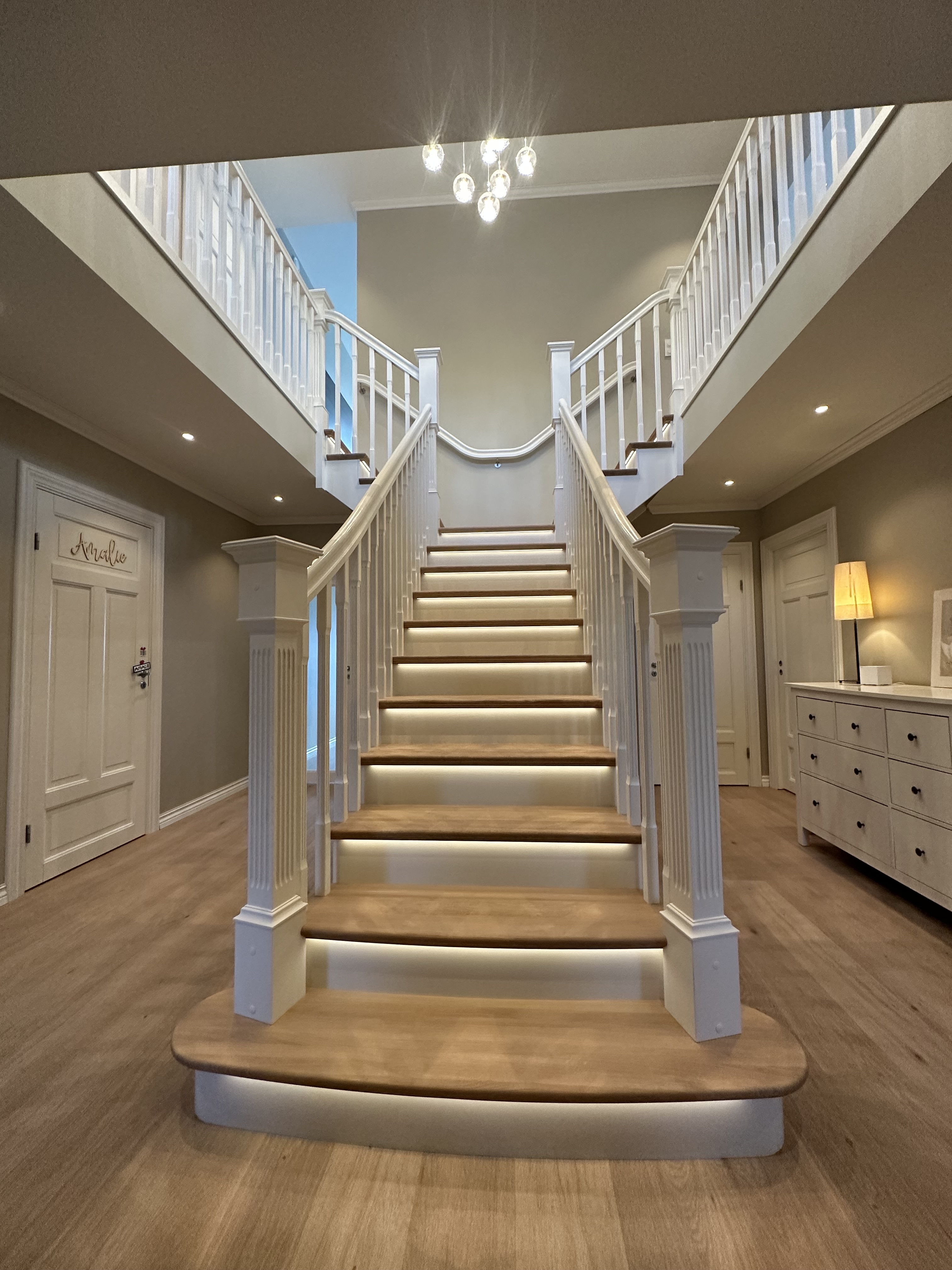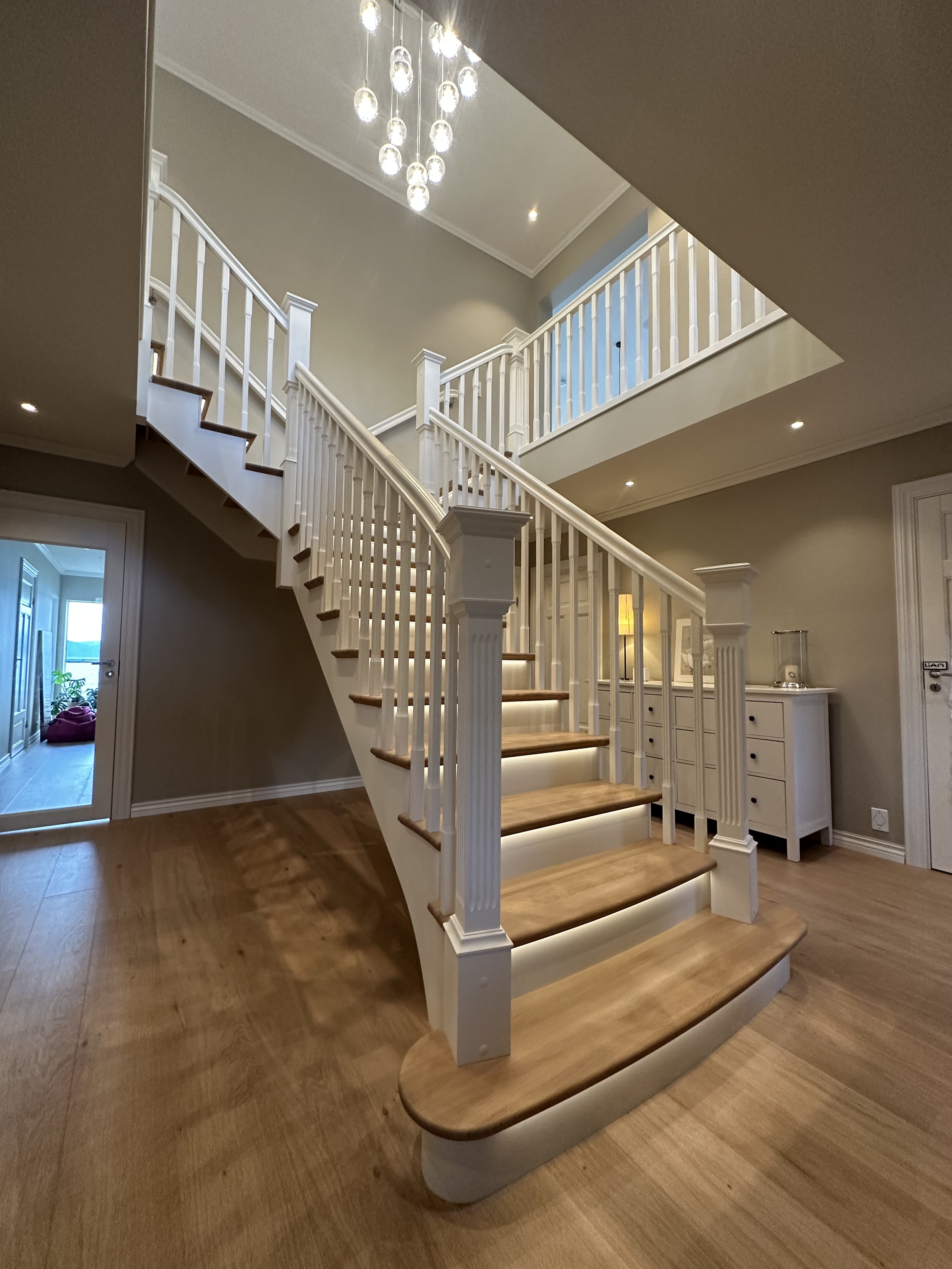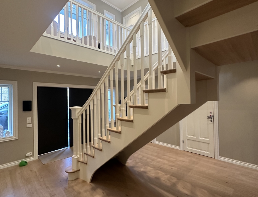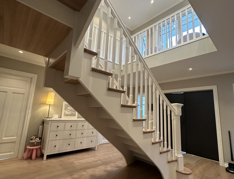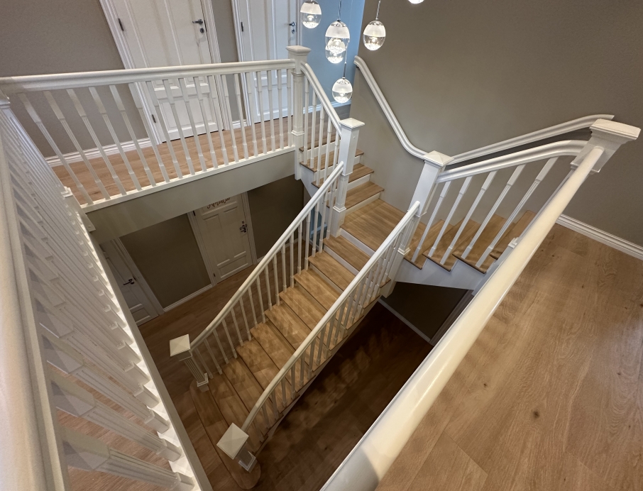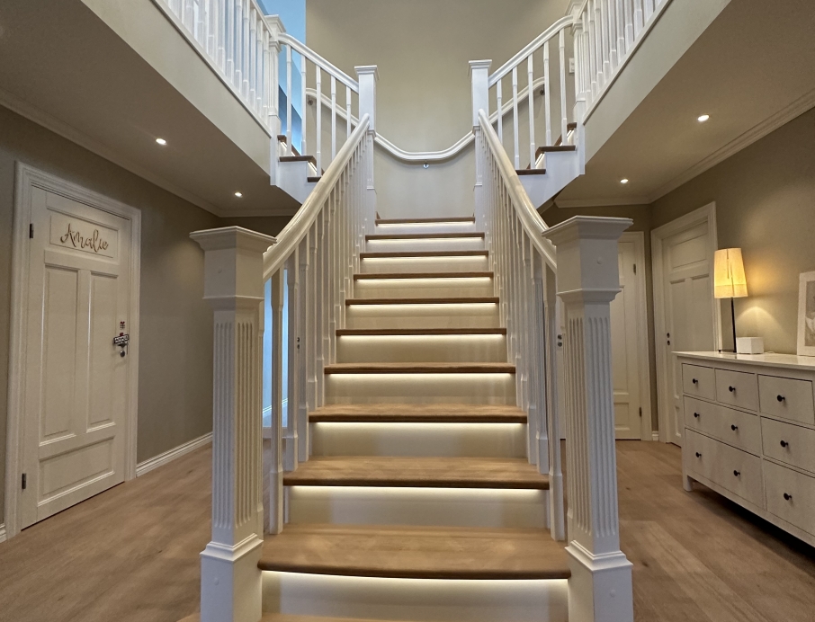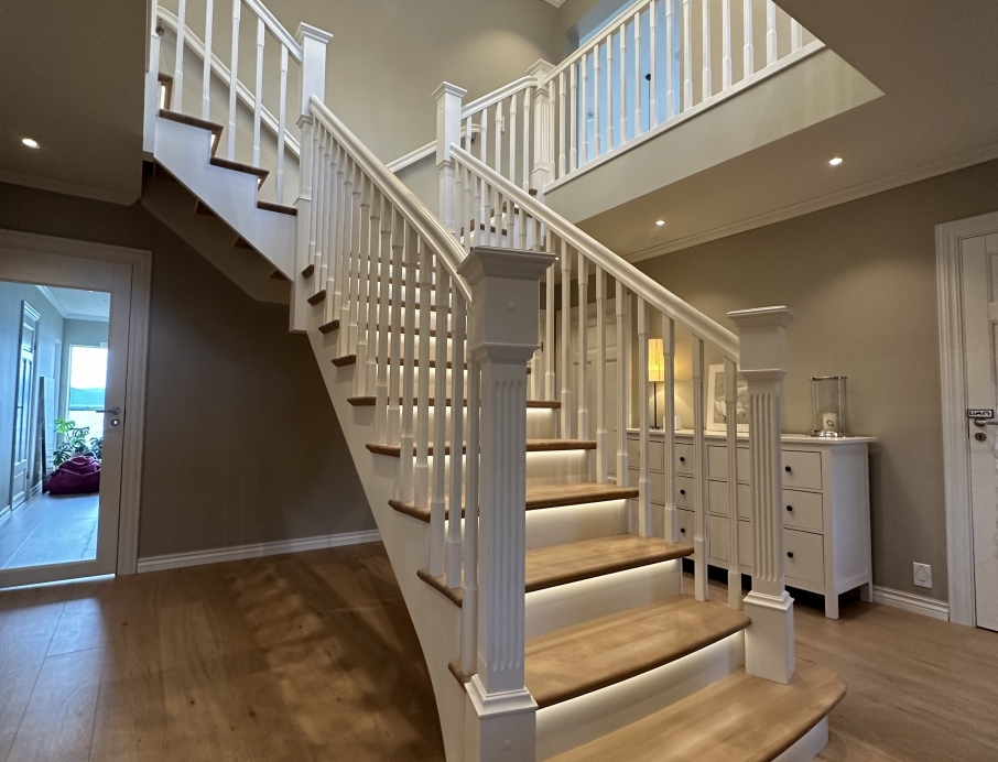 Elegantiški Y formos laiptai nesenstančio klasikinio stiliaus – įspūdingi centriniai laiptai, kurie gražiai išsišakoja link viršutinio aukšto ir sukuria didingą erdvės pojūtį hole. Pakopos ir turėklas pagaminti iš šilto vienjuosčio ąžuolo su dailiai profiliuota noselė ir subtiliu užapvalinimu, suteikiančiu klasikinės elegancijos ir aukštą komfortą. Visi kiti komponentai (laiptasijos, baliustrados, turėklai ir kolonos) pagaminti iš dažyto uosio, padengto švaria balta apdaila, kuri suteikia prabangų ir lengvą įspūdį. Integruotas LED apšvietimas po kiekviena pakopa sukuria švelnią, šiltą šviesą, pabrėžiančią pakopų formą ir užtikrinančią saugumą bei jaukią atmosferą vakare. Puikus pasirinkimas reprezentaciniams namams, ieškantiems klasikinės Y formos laiptų konstrukcijos su moderniomis detalėmis, aukšta kokybe ir „wow“ efektu prieškambaryje.