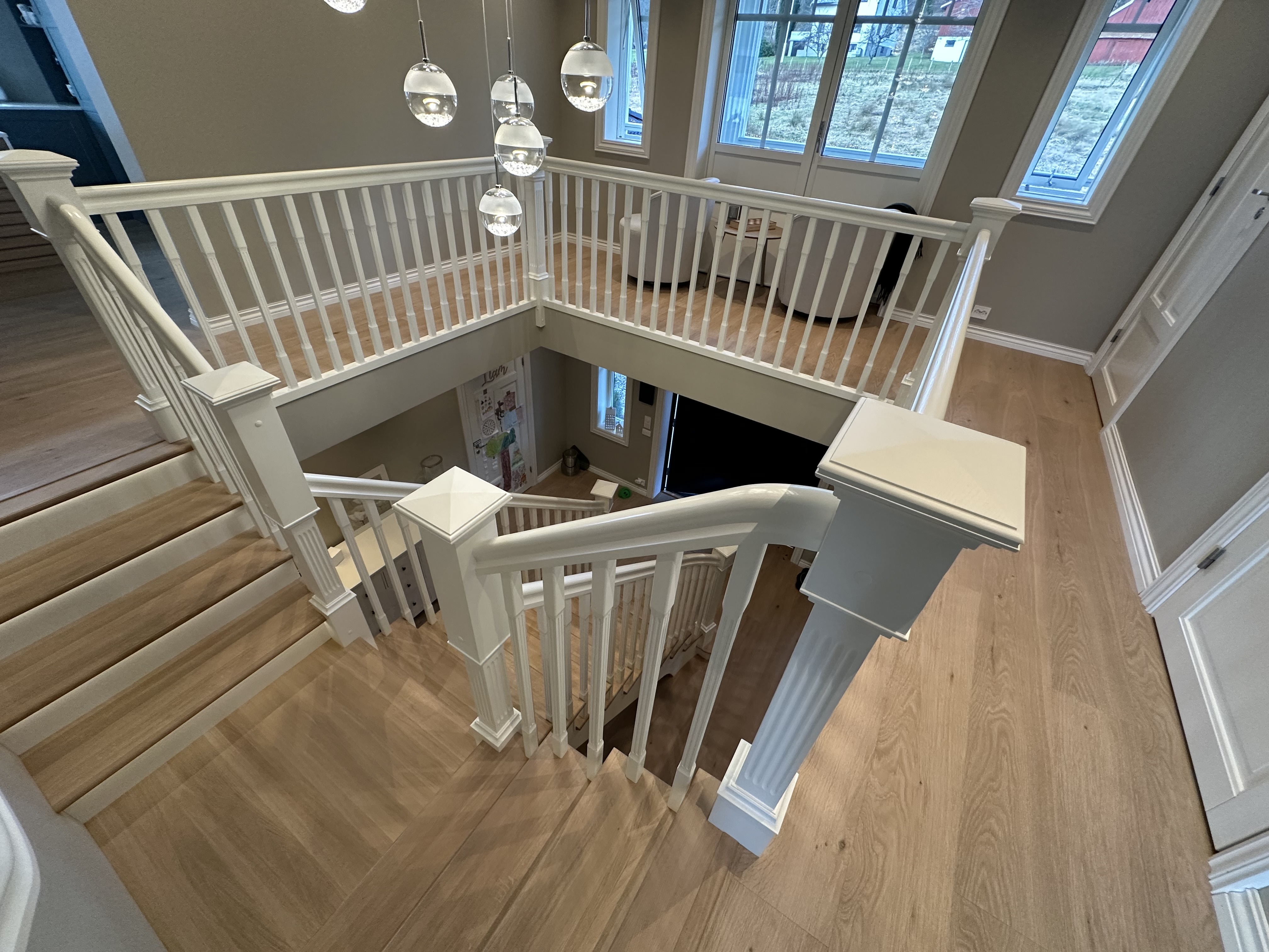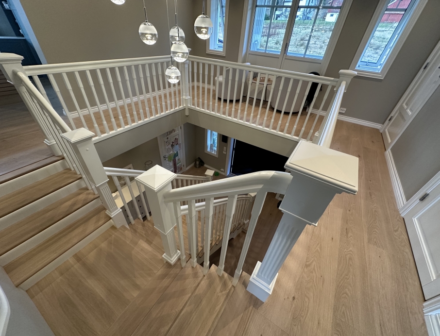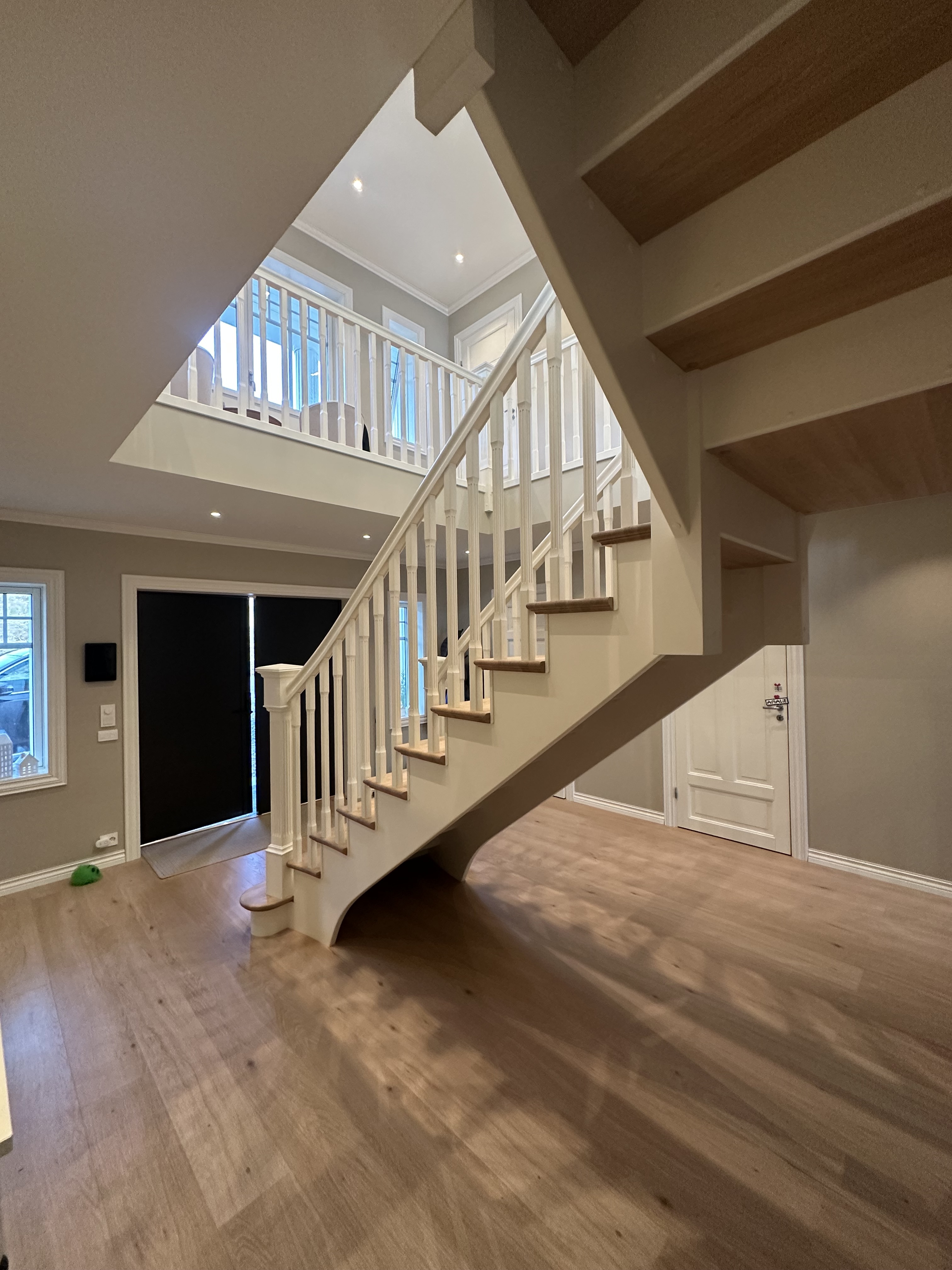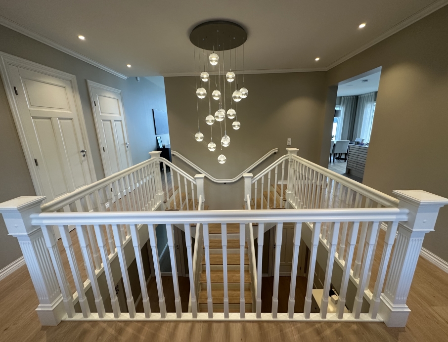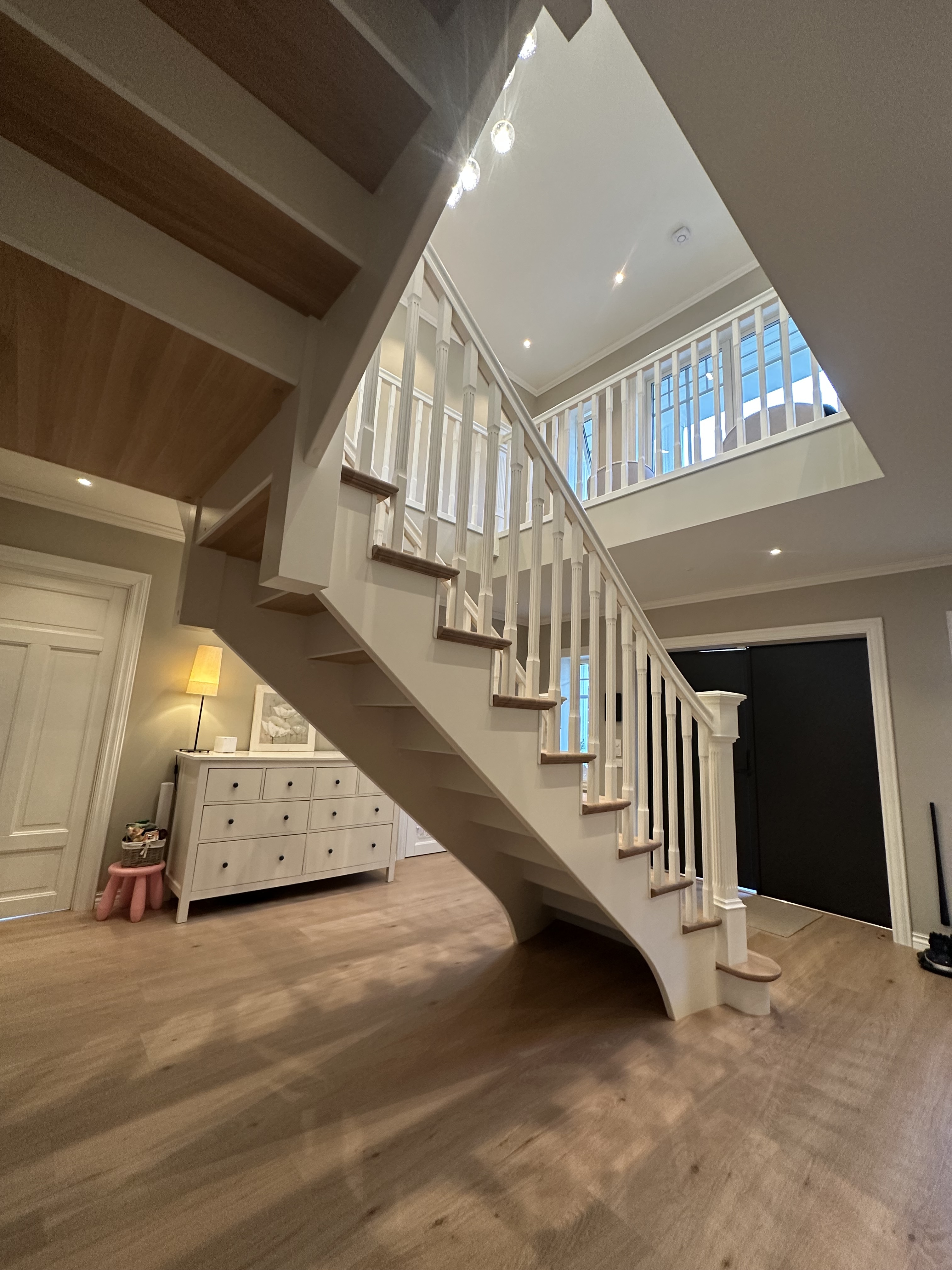 Elegantiški Y formos laiptai nesenstančio klasikinio stiliaus – įspūdingi centriniai laiptai, kurie gražiai išsišakoja link viršutinio aukšto ir sukuria didingą erdvės pojūtį hole. Pakopos ir turėklas pagaminti iš šilto vienjuosčio ąžuolo su dailiai profiliuota noselė ir subtiliu užapvalinimu, suteikiančiu klasikinės elegancijos ir aukštą komfortą. Visi kiti komponentai (laiptasijos, baliustrados, turėklai ir kolonos) pagaminti iš dažyto uosio, padengto švaria balta apdaila, kuri suteikia prabangų ir lengvą įspūdį. Integruotas LED apšvietimas po kiekviena pakopa sukuria švelnią, šiltą šviesą, pabrėžiančią pakopų formą ir užtikrinančią saugumą bei jaukią atmosferą vakare. Puikus pasirinkimas reprezentaciniams namams, ieškantiems klasikinės Y formos laiptų konstrukcijos su moderniomis detalėmis, aukšta kokybe ir „wow“ efektu prieškambaryje.